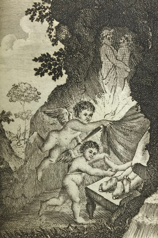 S.l.n.d., 1745 1 volume in-12 (15,5 x 10 cm) de (10)-159-XX pages. 8 figures hors-texte gravées sur cuivre par J.-B. Scotin (4 sont signées), 1 fleuron de titre à l'eau-forte, 4 bandeaux à l'eau-forte (amours jouant dans différentes situations), 1 frontispice gravé (non signé). Reliure de l'époque plein maroquin vieux rouge, plats décorés "à la dentelle" avec roulettes dorées fleurdelisées, guirlandes et glands, filet doré sur les coupes, dos orné aux petits fers dorés, pièce de titre de maroquin lavallière, roulette dorée en encadrement intérieur des plats, tranches dorées, doublures et gardes de papier peigne. Belle et fine reliure de l'époque très bien conservée. Intérieur frais avec quelques taches sans gravité, petit manque de papier à l'angle d'un feuillet sans atteinte au texte. La gravure hors-texte p. 53 provient d'un autre exemplaire de même édition et de même tirage. NOUVELLE ÉDITION.