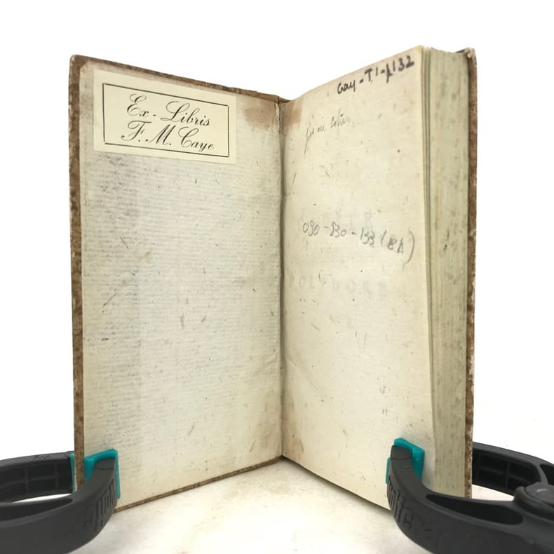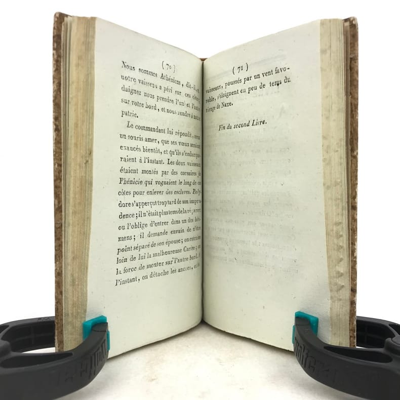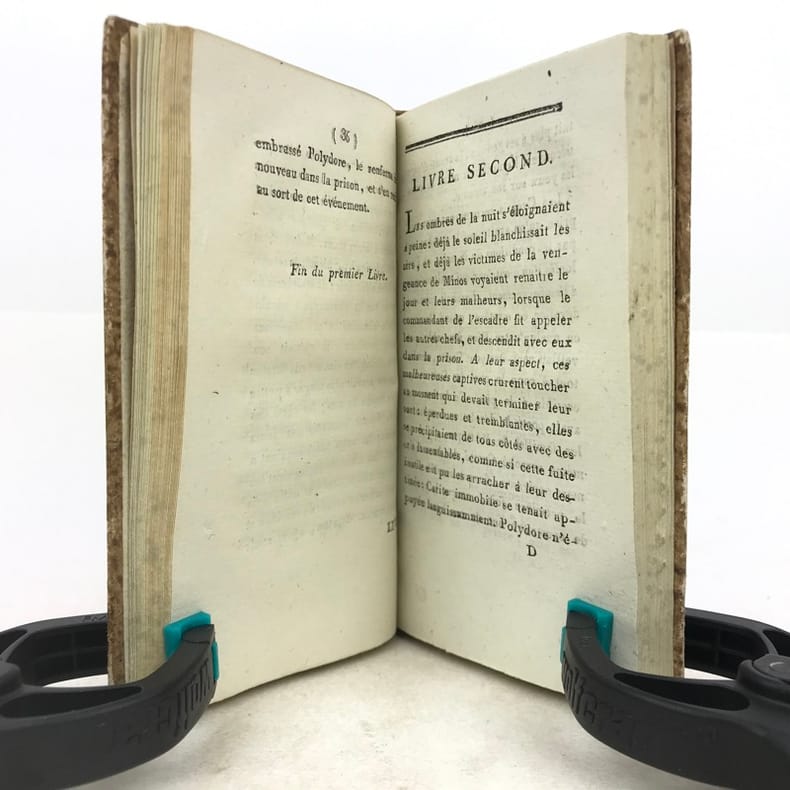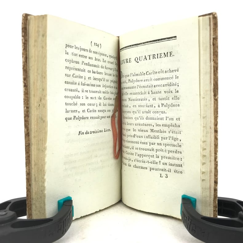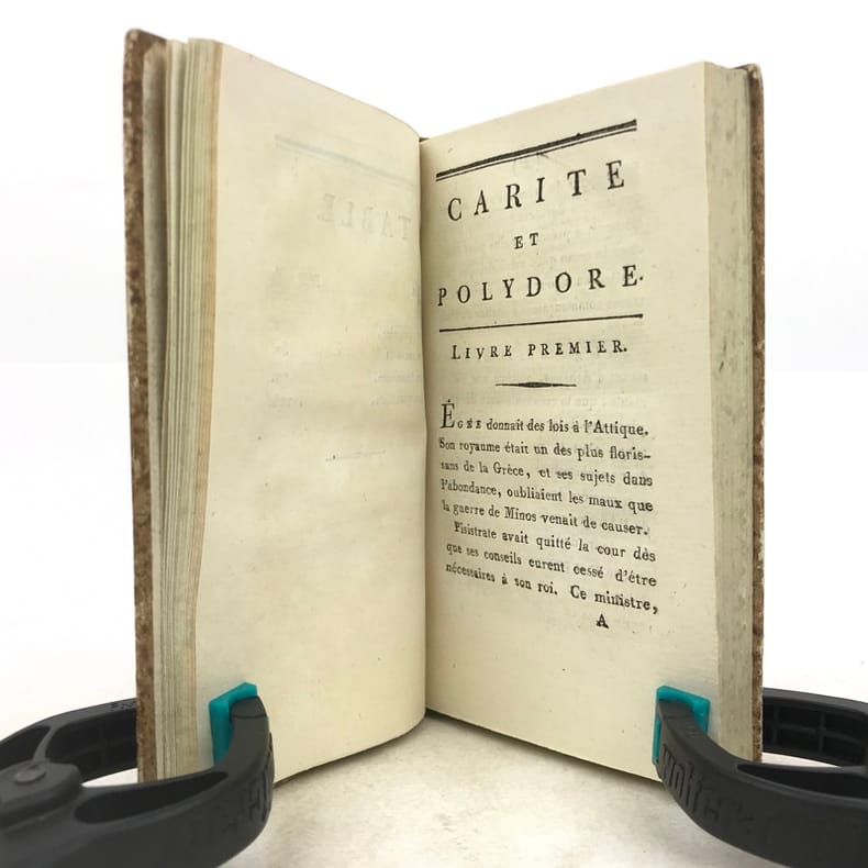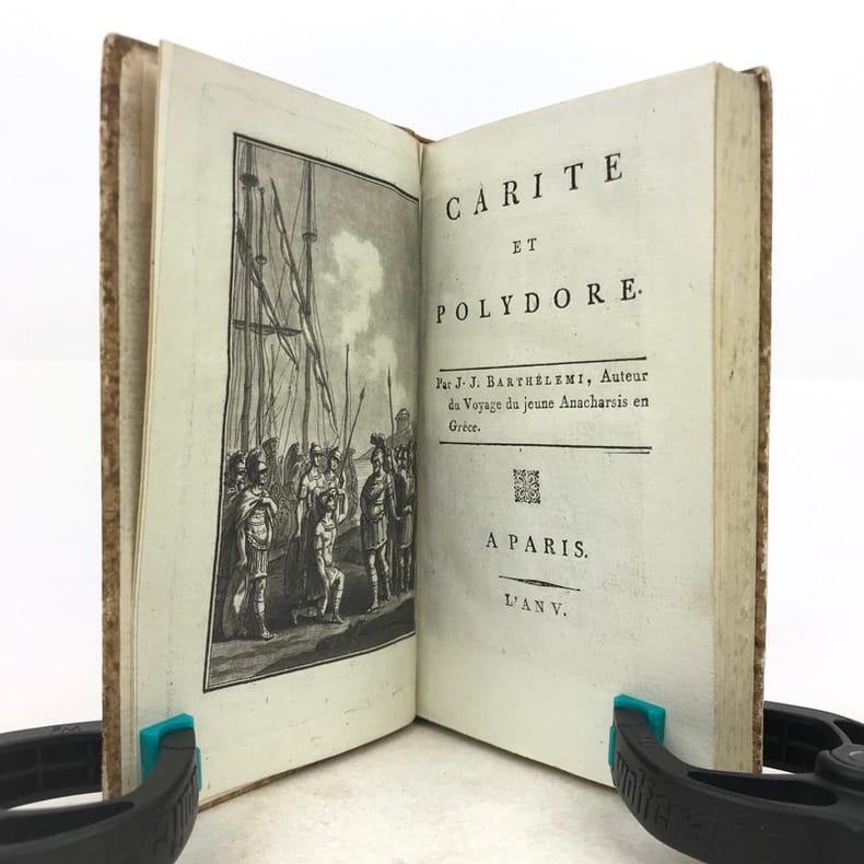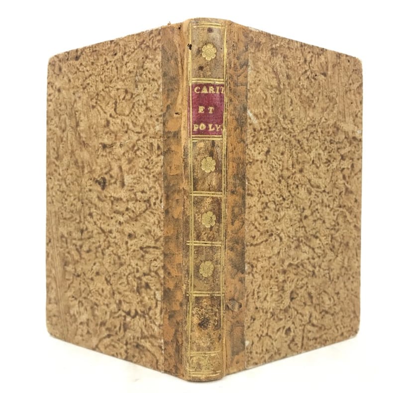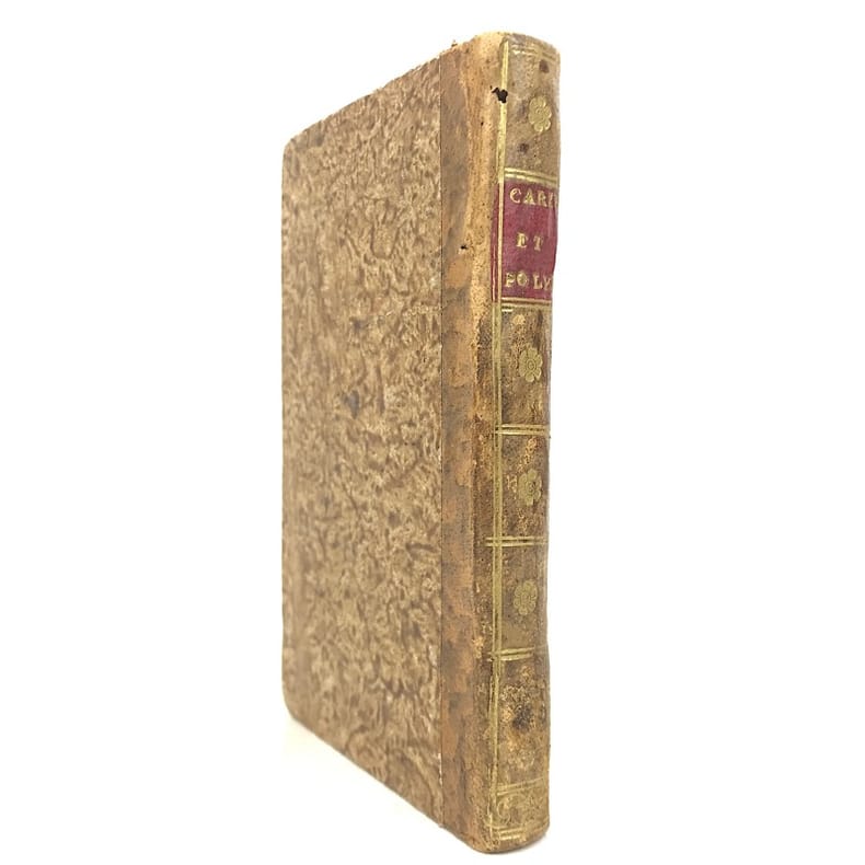 1 volume petit in-12 (13 x 8 cm), demi-basane marbrée (reliure de l’époque), dos lisse orné, pièce de titre et de tomaison en maroquin grenat, tranches mouchetées, étiquette d’ex-libris de F. M. Caye, xxxi-[3]-157-[1] pages (complet). Infimes frottements aux coins. État très correct. Nouvelle édition, illustrée d’un frontispice. L’abbé Jean-Jacques Barthélemy (1716-1795) est un ecclésiastique, archéologue, numismate et homme de lettres français. Célèbre pour ses travaux sur le phénicien et le palmyrénien, il est également l’auteur du Voyage du jeune Anacharsis en Grèce - grâce auquel il sera élu à l’Académie française - et réalise de nombreuses traductions à partir du texte, comme ce court texte que nous avons ici, Carite et Polydore. Bon exemplaire.
