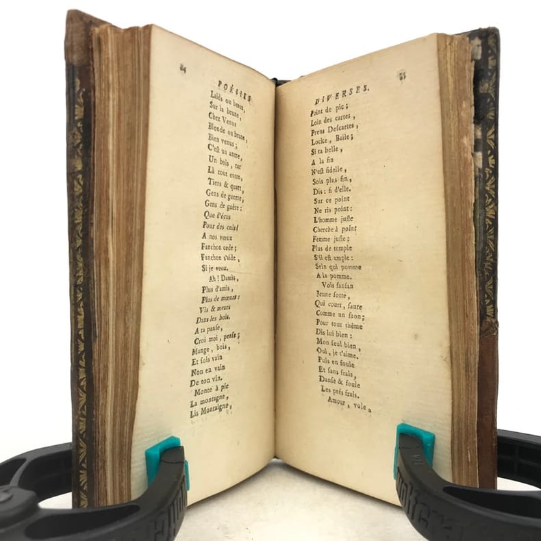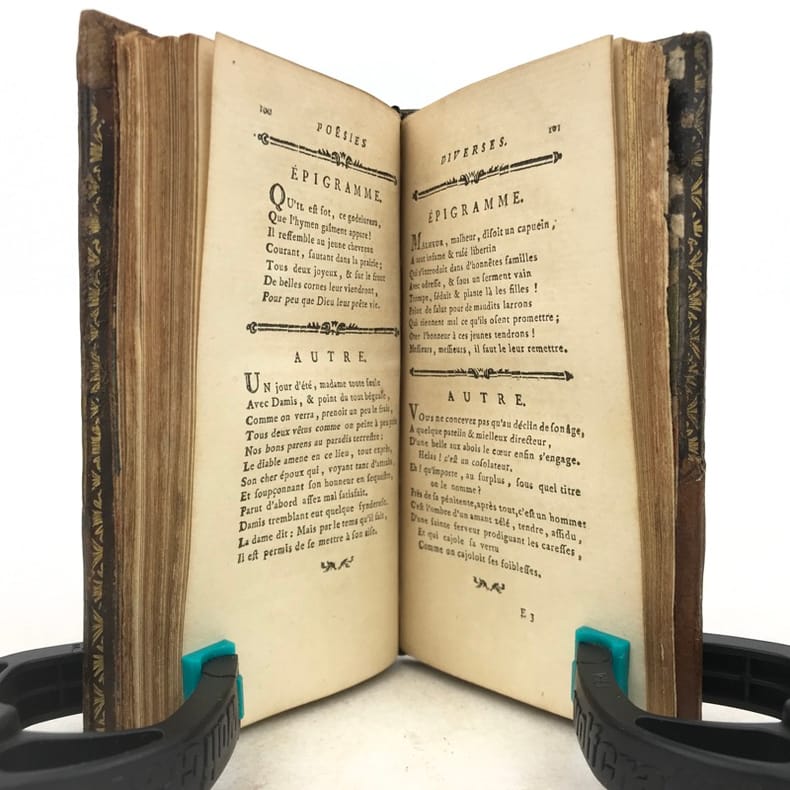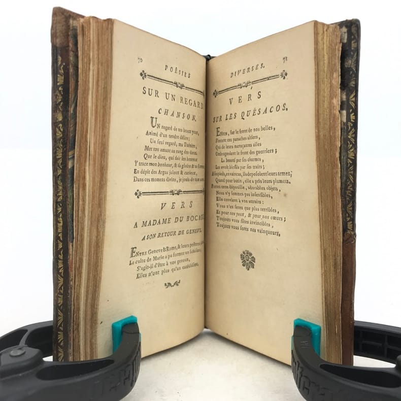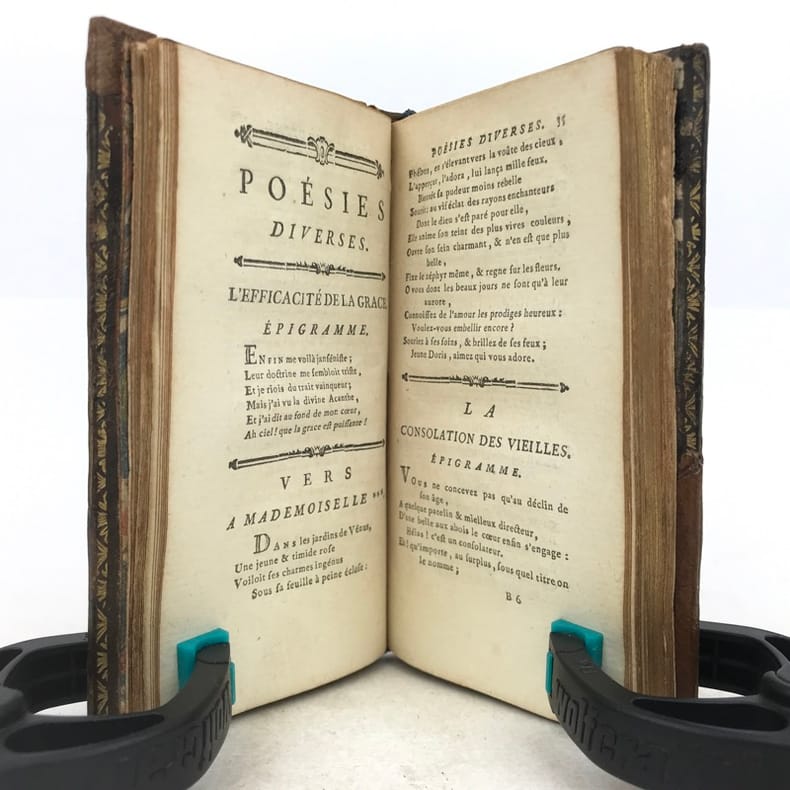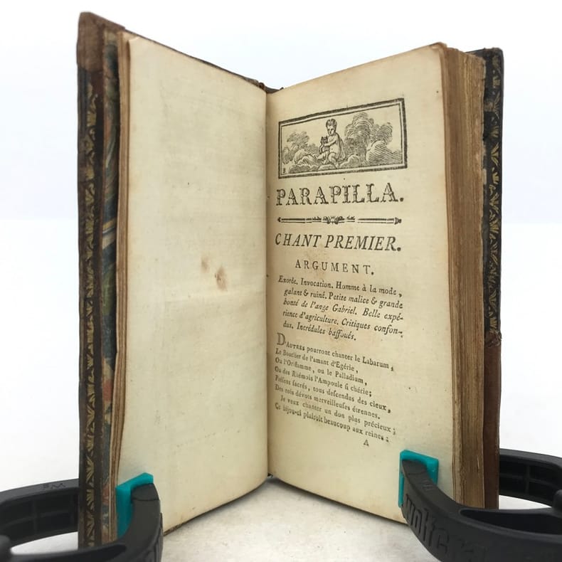 1 volume in-24 (11,5 x 6,5 cm), veau marbré (reliure de l’époque), dos lisse orné, pièce de titre en maroquin fauve, triple filet doré encadrant les plats, filet doré sur les coupes, roulette dorée sur les chasses, tranches dorées, [4]-164 pages (complet). Coins et coiffes grossièrement restaurés, mouillures et rousseurs. État correct tout de même. Nouvelle édition illustrée d’un frontispice. Poème traduit de l’italien et publié pour la première fois en français en 1776. Charles Borde (1711-1781) homme de lettres français. Proche de Mably et de Condillac, ses œuvres se composent principalement de poésie et de textes légers. Il fut d’ailleurs au cœur d’une controverse avec Jean-Jacques Rousseau sur la place des sciences et des arts au sein de la société. Bon exemplaire.