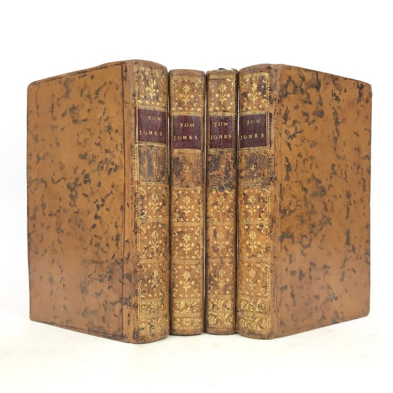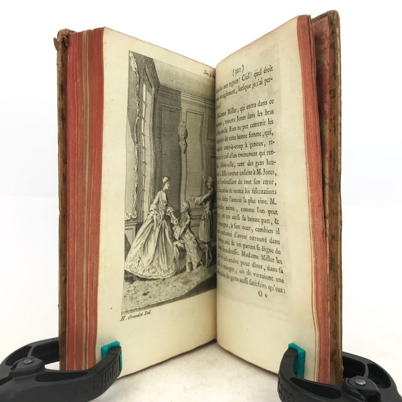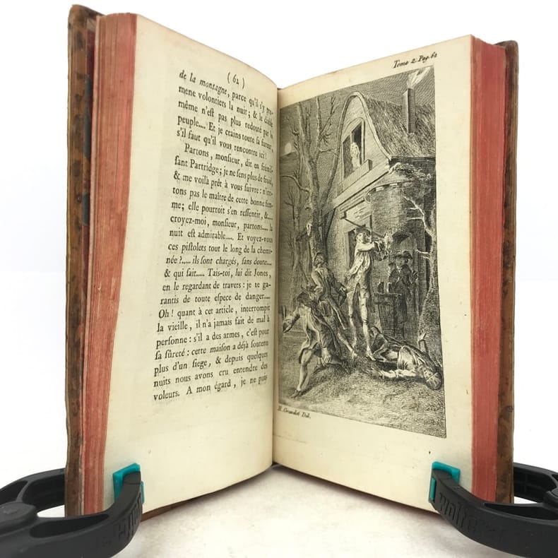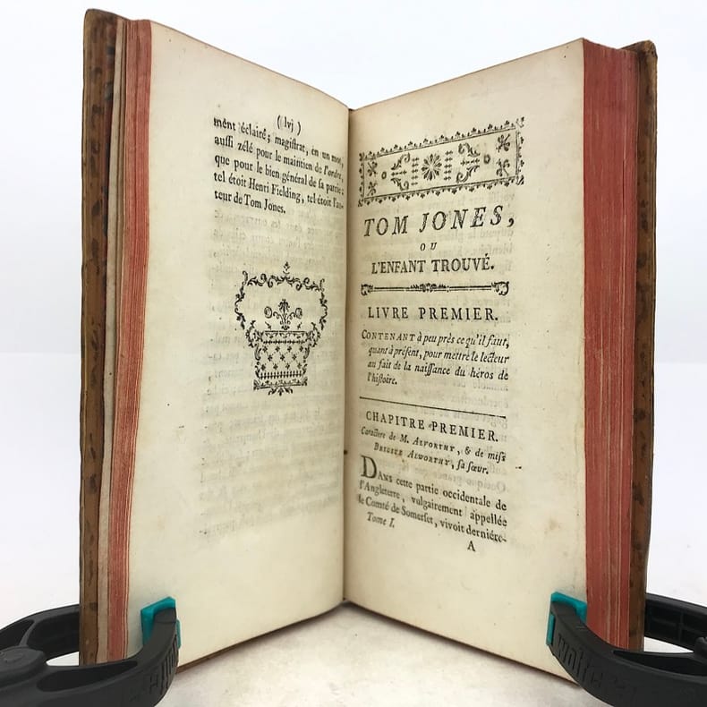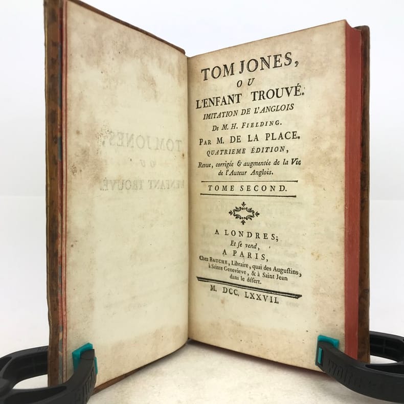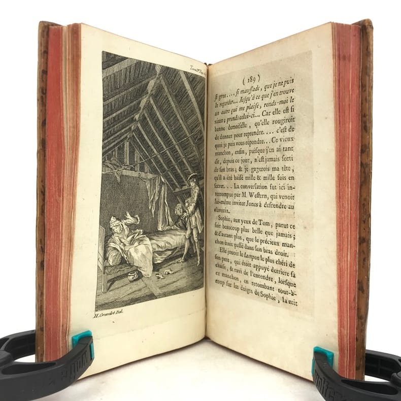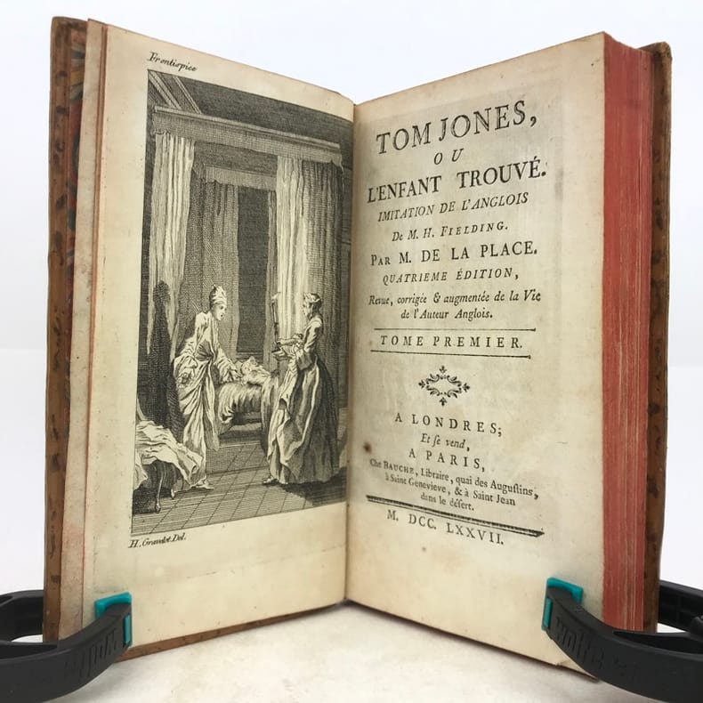4 volumes in-12 (17 x 9,5 cm), veau fauve marbré (reliure de l’époque), dos lisse orné, pièce de titre en maroquin grenat, filet à froid encadrant les plats, filet doré sur les coupes, tranches rouges, lvi-348 ; [4]-346 ; [4]-296 ; [4]-366 pages (complet). Légers frottements aux pièces de tomaison, garde inférieure du tome I déchirée, rousseurs éparses. État très correct tout de même. Nouvelle édition de la traduction française, réalisée par Pierre-Antoine de La Place (1707-1793) et illustrée d’un frontispice et de 15 gravures hors-texte. Il est le premier traducteur de cet ouvrage en 1750, ainsi que des œuvres de Sarah Fielding, sœurs de Henry. Henry Fielding (1707-1754) est un dramaturge, poète, essayiste et romancier anglais. Tom Jones devient très rapidement l'un des plus grands classiques de la littérature anglaise, figurant au sein de la liste de Maugham Somerset des dix plus grands romans. Fielding s'inspire de sa propre vie pour sa rédaction, et inclut notamment des traits de caractère de sa première épouse, Charlotte Craddock, décédée deux ans avant le début de sa rédaction. Agréable exemplaire.