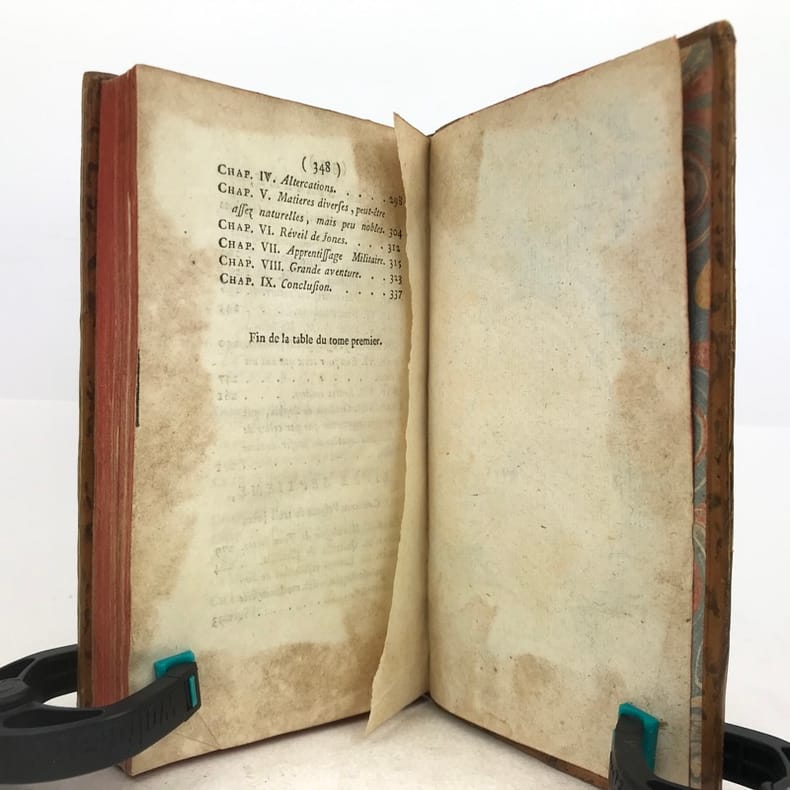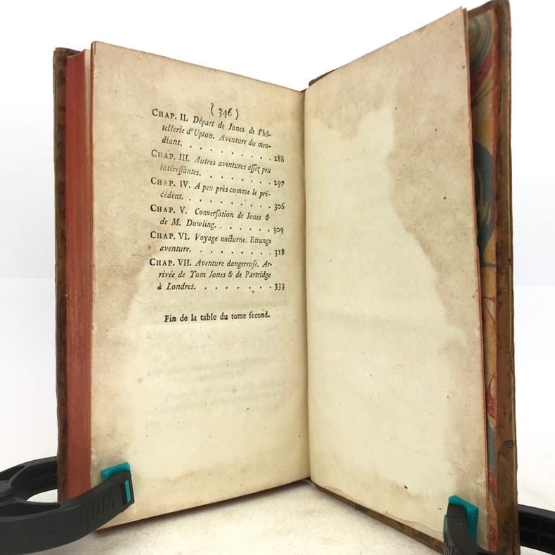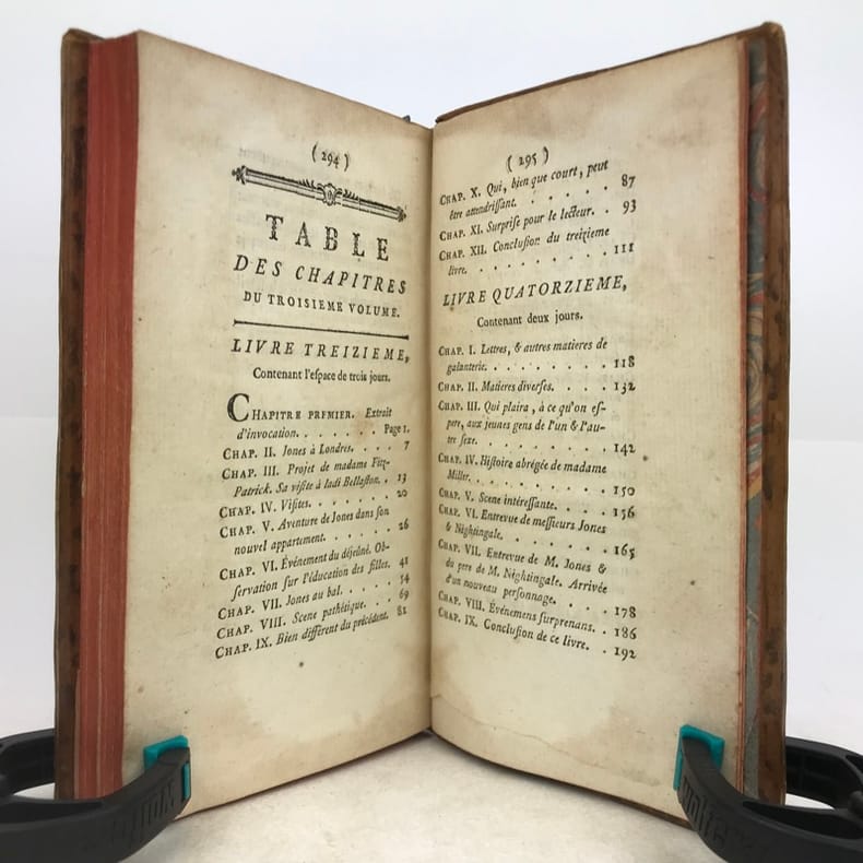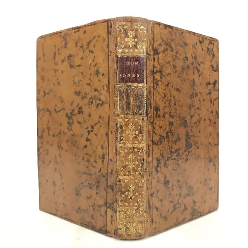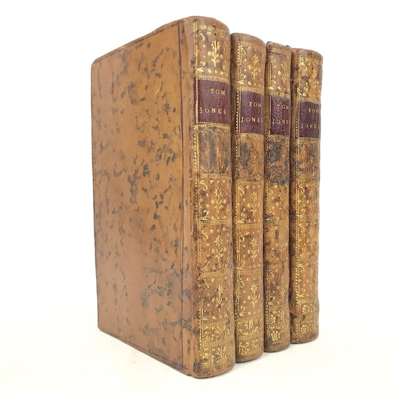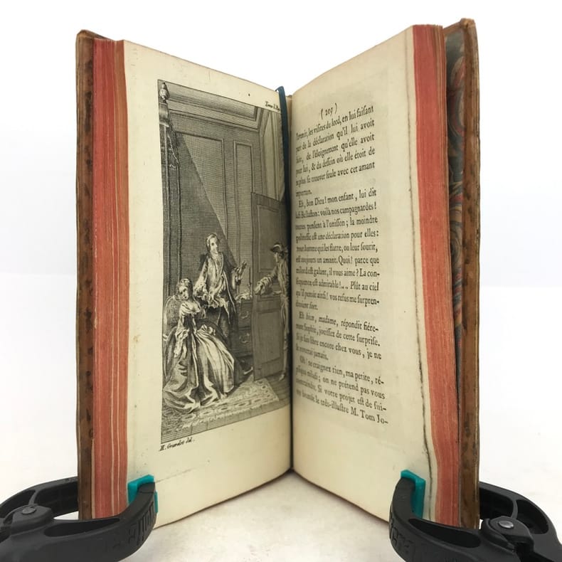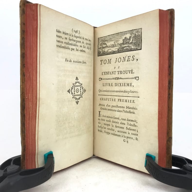4 volumes in-12 (17 x 9,5 cm), veau fauve marbré (reliure de l’époque), dos lisse orné, pièce de titre en maroquin grenat, filet à froid encadrant les plats, filet doré sur les coupes, tranches rouges, lvi-348 ; [4]-346 ; [4]-296 ; [4]-366 pages (complet). Légers frottements aux pièces de tomaison, garde inférieure du tome I déchirée, rousseurs éparses. État très correct tout de même. Nouvelle édition de la traduction française, réalisée par Pierre-Antoine de La Place (1707-1793) et illustrée d’un frontispice et de 15 gravures hors-texte. Il est le premier traducteur de cet ouvrage en 1750, ainsi que des œuvres de Sarah Fielding, sœurs de Henry. Henry Fielding (1707-1754) est un dramaturge, poète, essayiste et romancier anglais. Tom Jones devient très rapidement l'un des plus grands classiques de la littérature anglaise, figurant au sein de la liste de Maugham Somerset des dix plus grands romans. Fielding s'inspire de sa propre vie pour sa rédaction, et inclut notamment des traits de caractère de sa première épouse, Charlotte Craddock, décédée deux ans avant le début de sa rédaction. Agréable exemplaire.