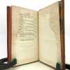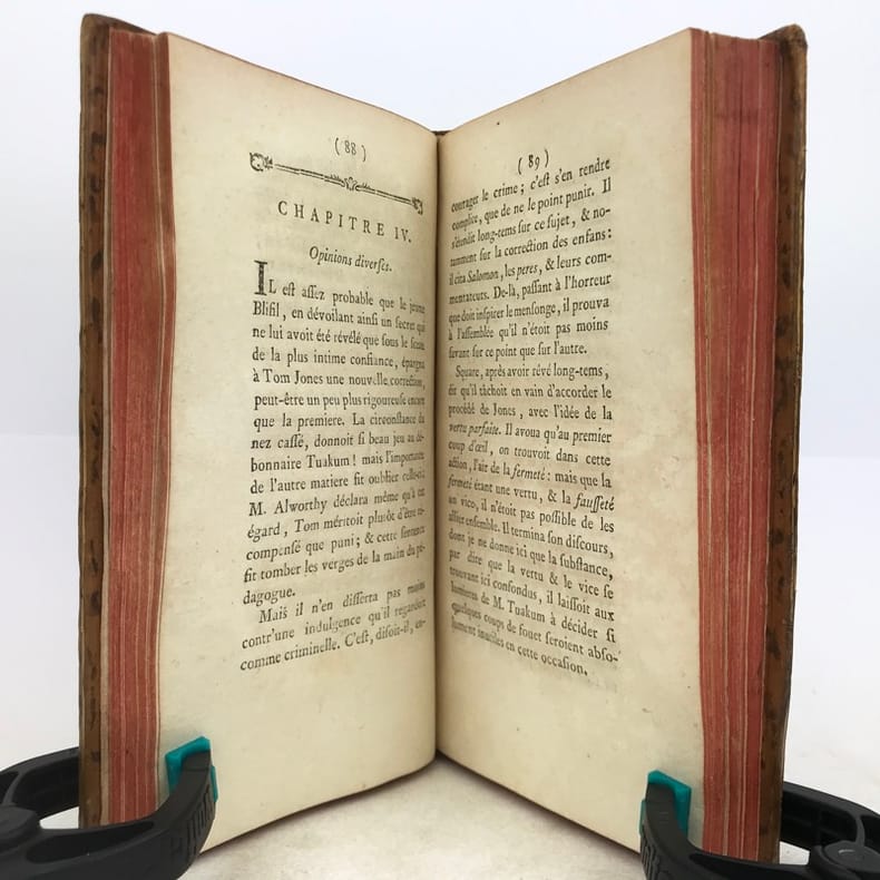 Paris, Dauthereau, Impr. Firmin Didot, Paris, Dauthereau, Impr. Firmin Didot1828 ; 6 volumes in-18, demi-veau rose, dos à nerfs, fil. et dent. dor., fleurons à froid, tr. marbr. 2 ff., IV pp., 283 pp. - 2 ff., 361 pp. - 2 ff., 338 pp. - 2 ff., 407 pp. - 2 ff., 324 pp. - 2 ff., 344 pp.“Le premier roman du monde et le livre le mieux fait de l’Angleterre” selon La Harpe, jugement confirmé par Somerset Maugham qui place Tom Jones parmi les dix plus grands romans dans son essai Dix romans et leurs auteurs. Publié à Londres en 1749, il sera adapté dès 1750 en français par Pierre-Antoine Laplace et retraduit ensuite par Davaux en 1795 puis par L. C. Chéron en 1804. Cette édition de 1828 est donné comme une traduction nouvelle. Dans l’Avant-propos du traducteur signé E. T., celui-ci parle de ses prédécesseurs “La Place qui a cruellement mutilé Tom Jones (...) Lavaux (pour Davaux) qui lui a fait parler un français rempli de négligences, Chéron, lourd et diffus dans son exactitude”. Nous n’avons pas su identifier ce nouveau traducteur. En tête du 1er tome on trouve (pp. 1. à 48) la Notice biographique et littéraire sur Henry Fielding par Walter Scott. Bel exemplaire, jolies reliures romantiques.
