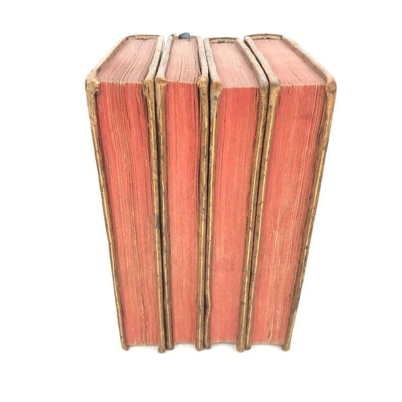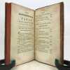 Londres, 1801. Quatre volumes in-16 de 239, 236, 204 et 256 pages avec 9 charmantes gravures réparties dans les volumes. Très bon état intérieur. Charmantes reliures en veau vert foncé, filet doré sur les plats, dos lisse orné de paniers fleuris, carquois et vases de fleurs, pièces de titre et de tomaison rouges, filet perlé sur les coupes, roulette sur les chasses, tranches dorées. Dos légèrement passés et légères usures à certains motifs dorés. Mais l'ensemble est très agréable.