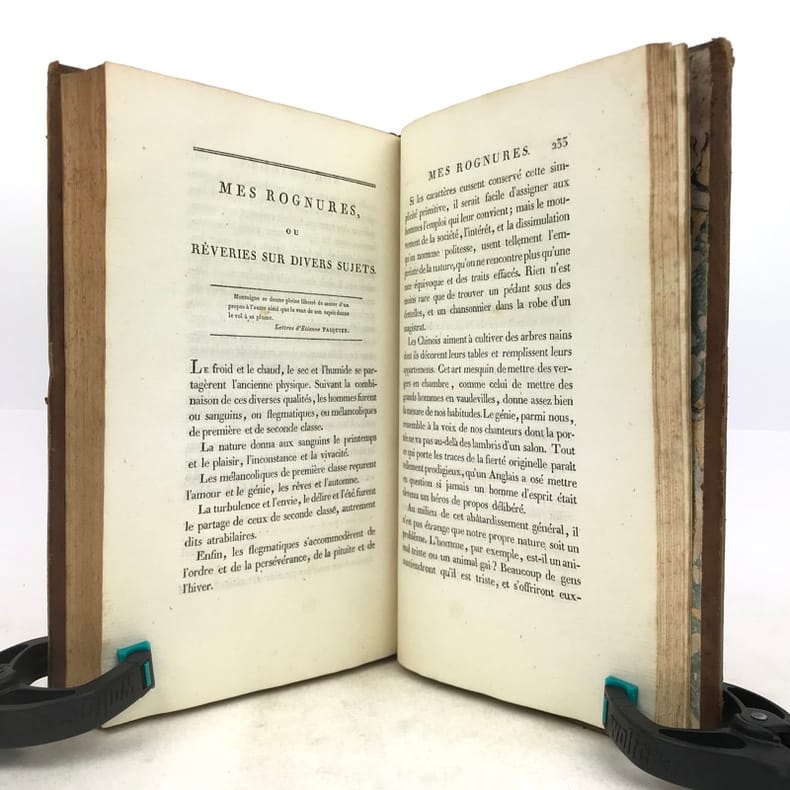 1 volume in-8 (19,5 x 12 cm), veau moucheté et glacé (reliure de l’époque), dos lisse orné, pièce de titre en maroquin noir, double filet doré encadrant les plats, filet doré sur les coupes, tranches mouchetées, annotation manuscrite sur une garde supérieure (concernant l’auteur de cet ouvrage), xxxix-[1]-284 pages (complet). Un coin frotté, rousseurs éparses. État très correct tout de même. ÉDITION ORIGINALE. Pierre-Édouard Lémontey (1762-1826), avocat de métier, est un homme politique, homme de lettres et historien français. Il est notamment à l’origine de la célèbre expression apocryphe “L’État, c’est moi”, attribuée à Louis XIV. Publié de façon anonyme, ce curieux ouvrage pamphlétaire, critiquant les revirements politiques de la Révolution, et portant également sur la charge des avocats au sein de la société. Agréable exemplaire.