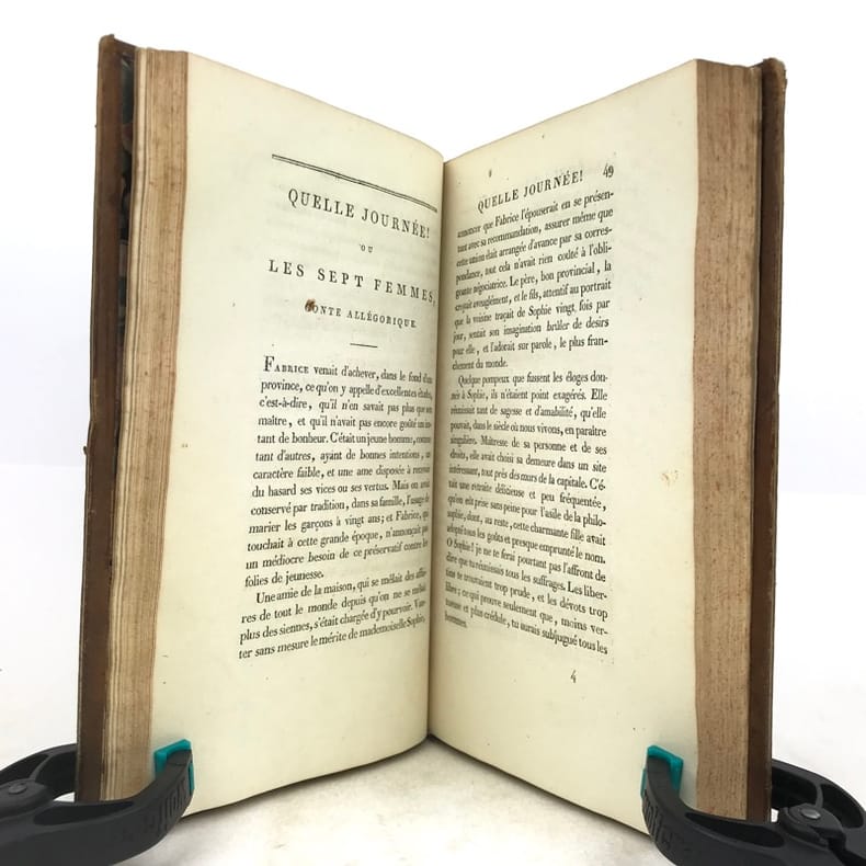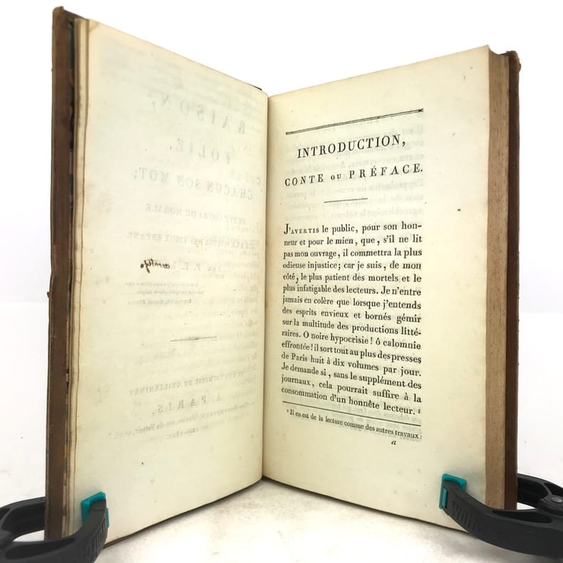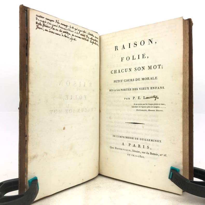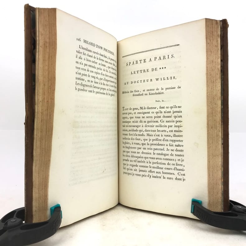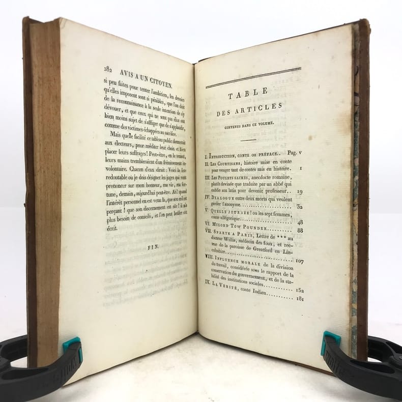 Paris, chez Deterville, An X (1801). 12 x 20, xxxix-284 pages, reliure dos/coins cuir lisse, orné de motifs dorés, plats marbrés, tranches mouchetées, bon état (papier blanc, pas de rousseur, mors avant fendu).