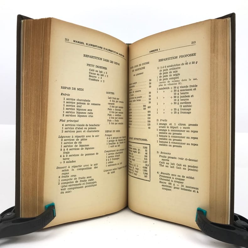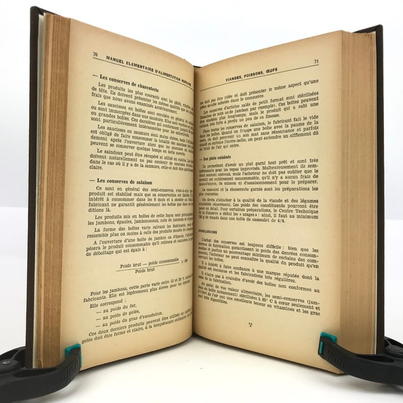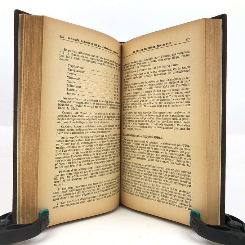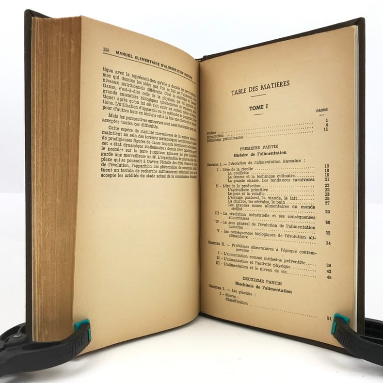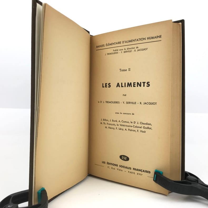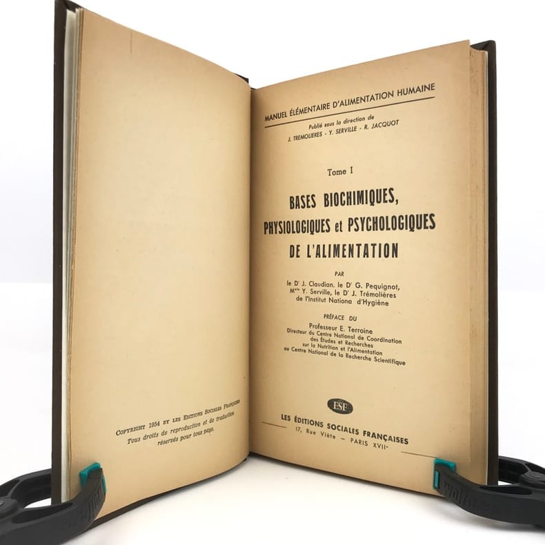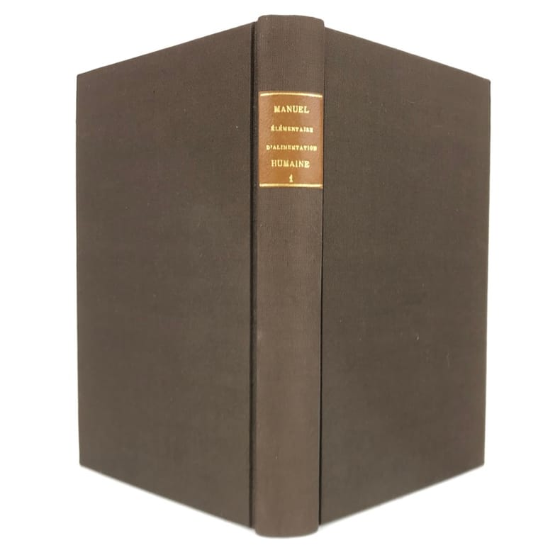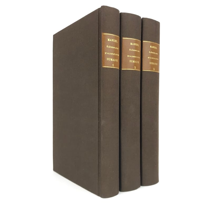 3 volumes in-8 (21,3 x13,5 cm), bradel toile marron (reliure moderne), pièces de titre miel, couverture et dos conservés. viii-262-[2] ; x-368-[2] ; x-345-[7] pages (complet). Papier un peu bruni avec quelques feuillets un peu cassants, grand tableau dépliant restauré à l’adhésif. Bon état. Ouvrage illustré de nombreux schémas explicatifs, figures et tableaux in texte, ainsi que d’un grand tableau dépliant (compris dans la pagination). Textes par Claudian, Pequignot, Serville, Trémolières, Jacquot avec le concours de nombreux autres docteurs, professeurs, ingénieurs agronomes, diététiciennes, etc. Ouvrage faisant partie de la collection : Manuel élémentaire d’alimentation humaine; réalisé à l’intention des professeurs d’hygiène alimentaire et de cuisine, de tous les techniciens du secteur alimentaire et des responsables de collectivités (économes…). Intéressant exemplaire. Vendu 02/10/2025