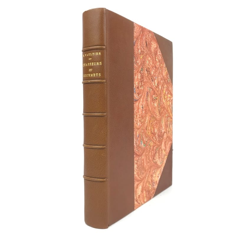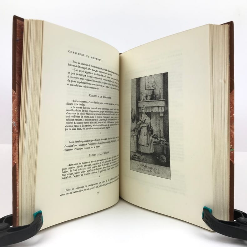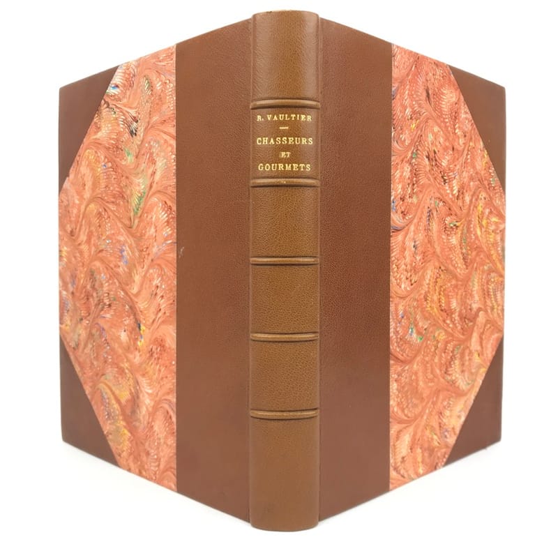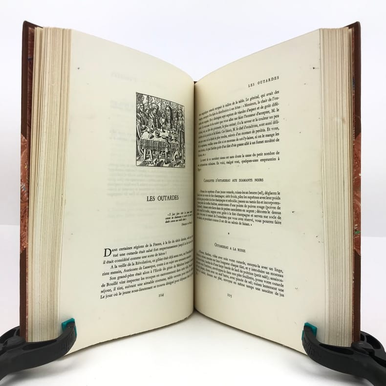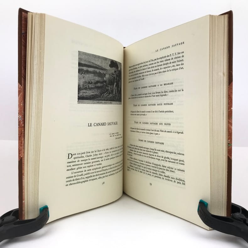 1 volume in-8 (23 x 18,5 cm), demi-maroquin fauve à coins (reliure postérieure, signée J. Faki), dos à nerfs, tête dorée, couverture et dos conservés. 256-[2] pages (complet). Bon état. ÉDITION ORIGINALE de ce texte, illustrée de reproductions de documents anciens in-texte. “Un des meilleurs recueils de recettes pour amateurs de gibier accompagnées de commentaires historico-gastronomiques” avec une préface de Curnonsky. 1/2490 exemplaires sur fleur d’Alfa, (n°1390). Bon exemplaire.