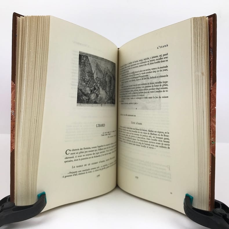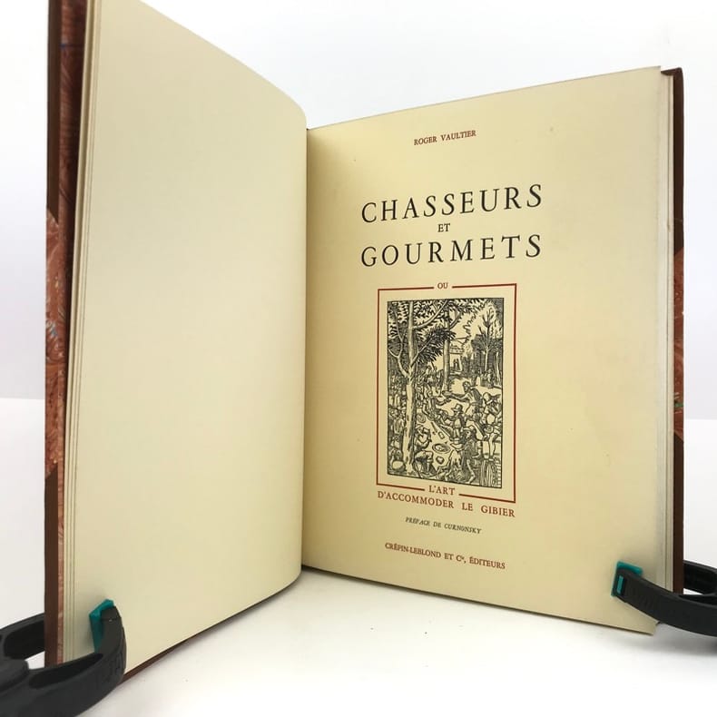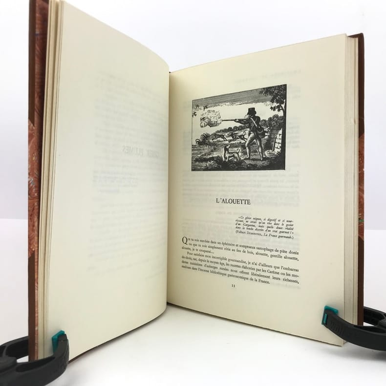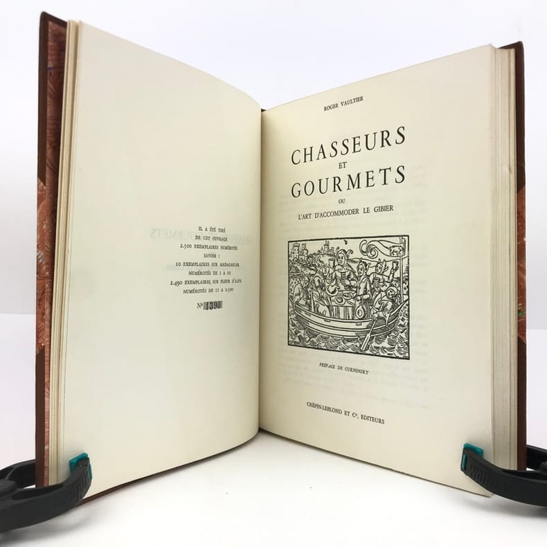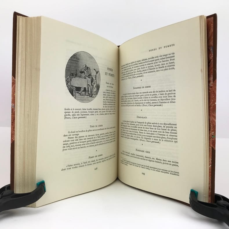 1 volume in-8 (23 x 18,5 cm), demi-maroquin fauve à coins (reliure postérieure, signée J. Faki), dos à nerfs, tête dorée, couverture et dos conservés. 256-[2] pages (complet). Bon état. ÉDITION ORIGINALE de ce texte, illustrée de reproductions de documents anciens in-texte. “Un des meilleurs recueils de recettes pour amateurs de gibier accompagnées de commentaires historico-gastronomiques” avec une préface de Curnonsky. 1/2490 exemplaires sur fleur d’Alfa, (n°1390). Bon exemplaire.