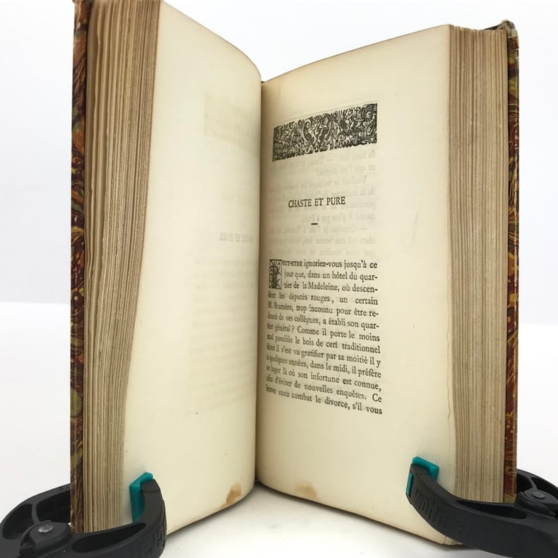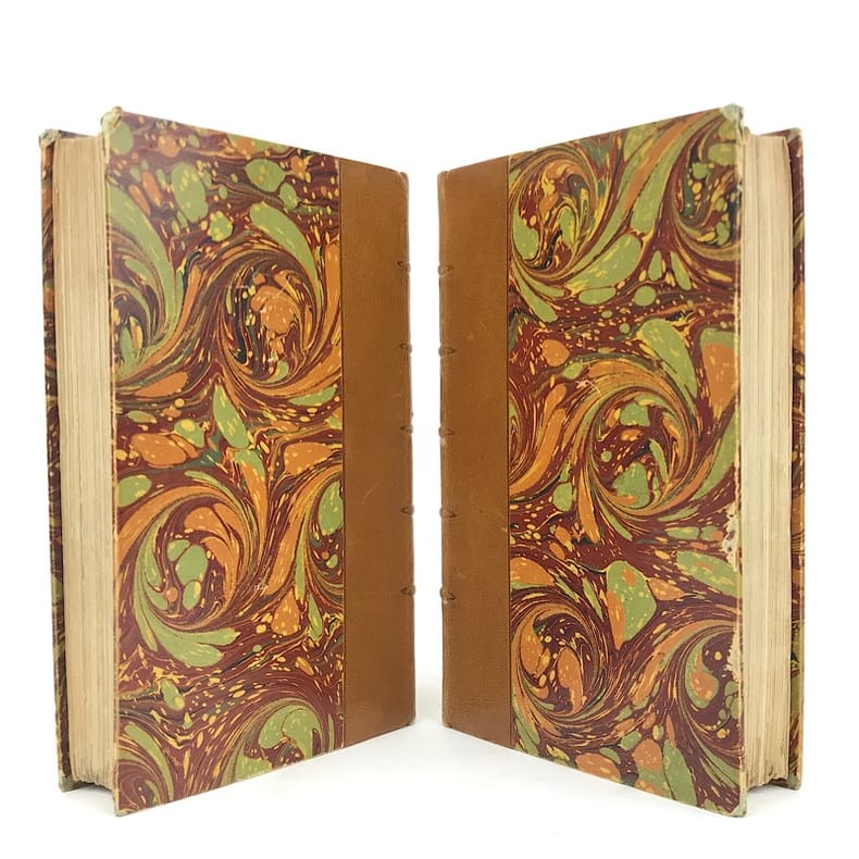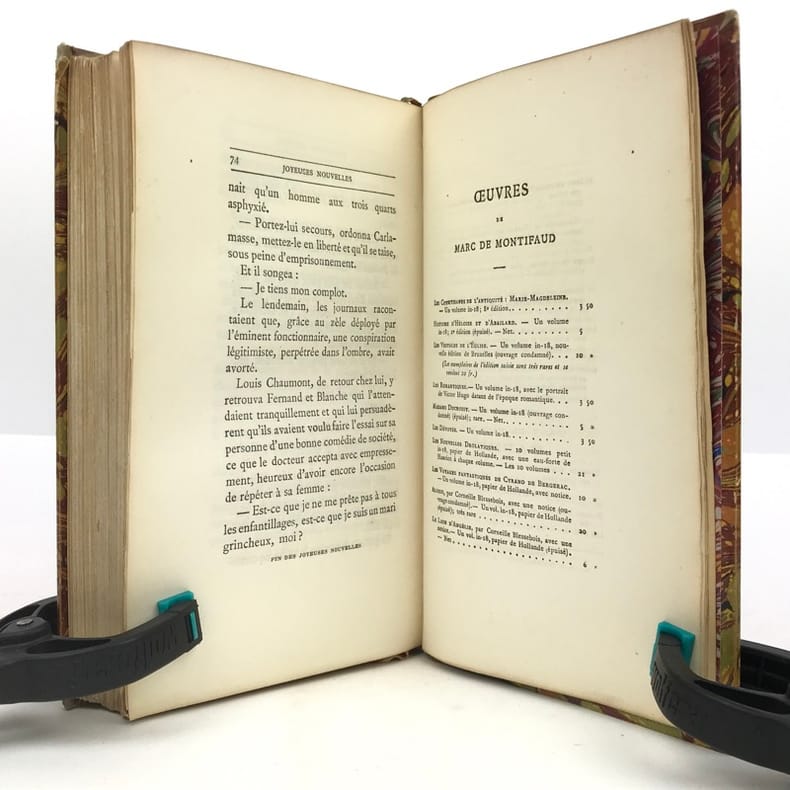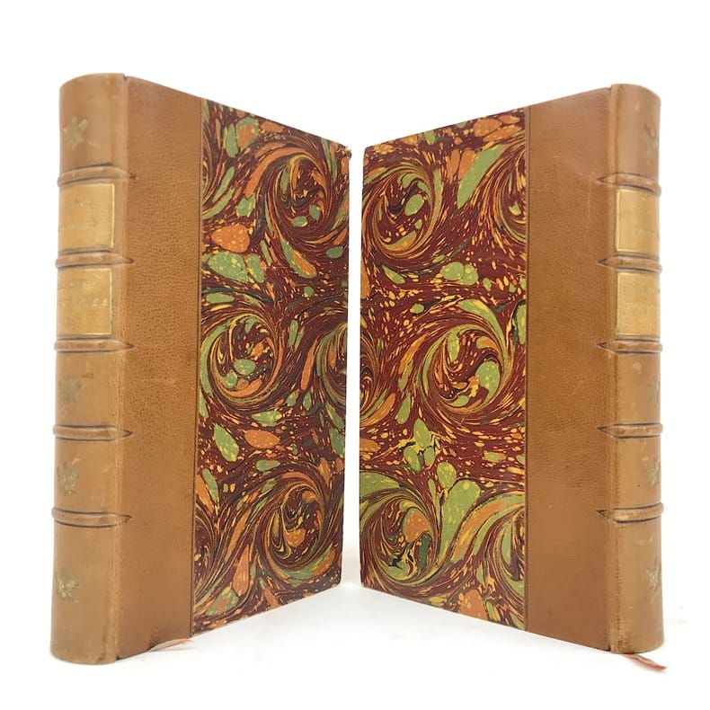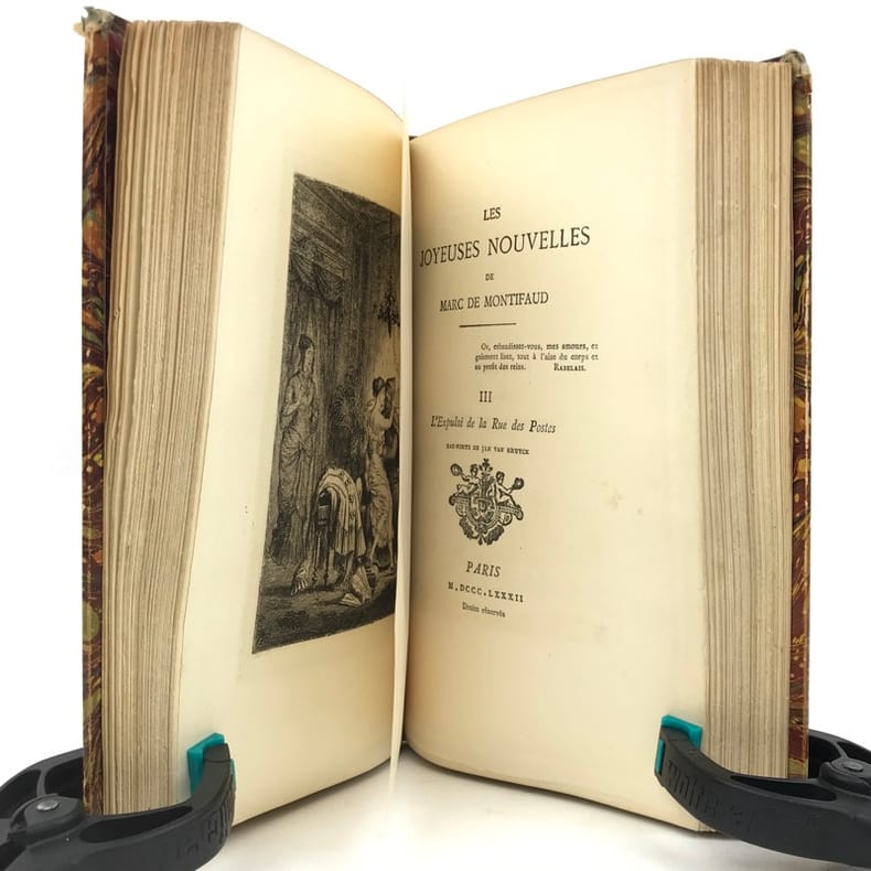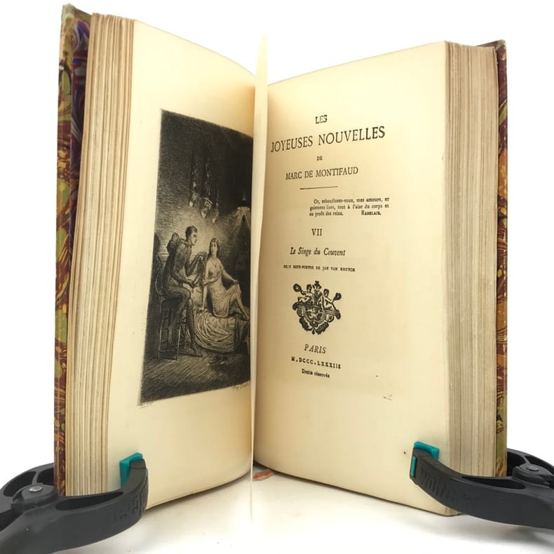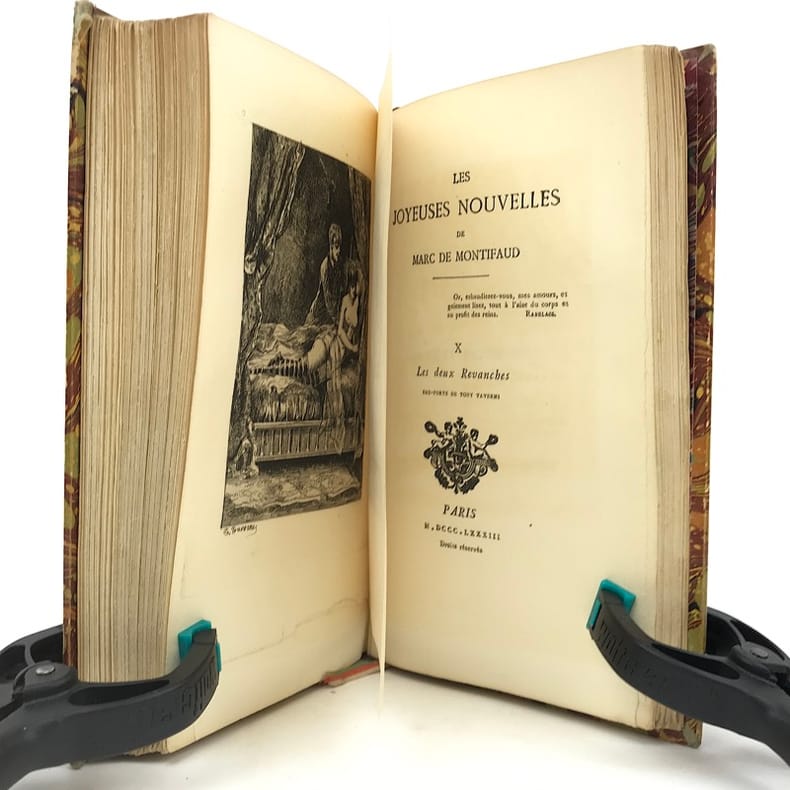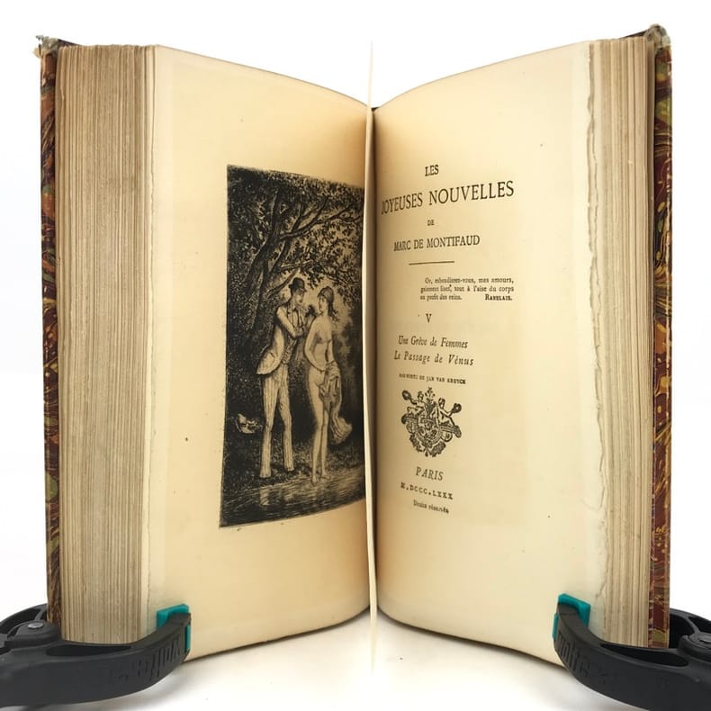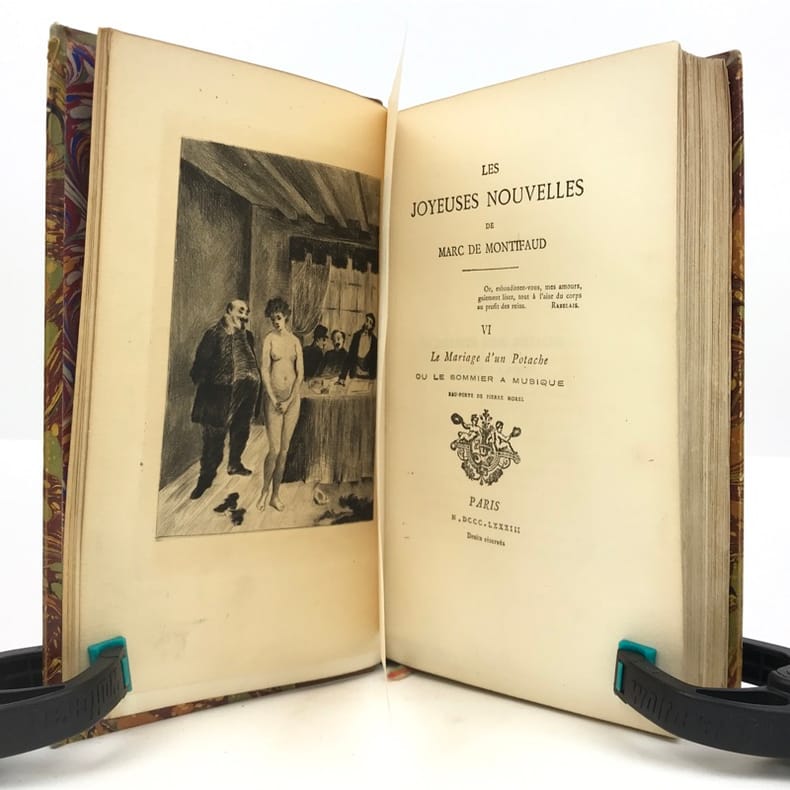 2 volumes in-12 (18 cm x 10,5 cm), demi-chagrin fauve (reliure de l’époque), dos à nerfs orné de motifs dorés, pièce de titre et de tomaison blondes, tête dorée. 64-75-1 bl.-[4]-67-1 bl.-[4]-67-1 bl.-[4]-85-1 bl.-[2] ; 88-69-1 bl.-[2]-64-71-1 bl.-74-[2] pages (complet). Dos insolé, coins légèrement abîmés. Bon état. ÉDITION ORIGINALE illustrée de 11 planches gravées à l'eau-forte de Van ruys. Marc de Montifaud, de son vrai nom Marie-Amélie Chartroule (1845-1912), est une écrivaine française. On lui doit surtout un nombre important de nouvelles drolatiques, d’esprit galant et provocateur, à saveur parfois anticléricale et coiffées de titres suggestifs : Entre messe et vêpres, ou les Matinées de carême au Faubourg Saint-Germain (1882. ). Ses écrits lui valurent un certain nombre de poursuites judiciaires et quelques-uns sont censurés. Sa publication de l’ouvrage contre les religieuses, Vestales de l’Église, lui vaut même un emprisonnement en 1877, tout comme son livre Mme Ducroisy, en 1878. Bel exemplaire.