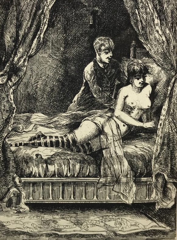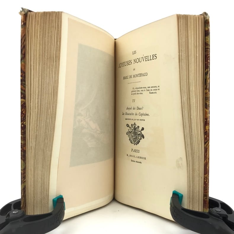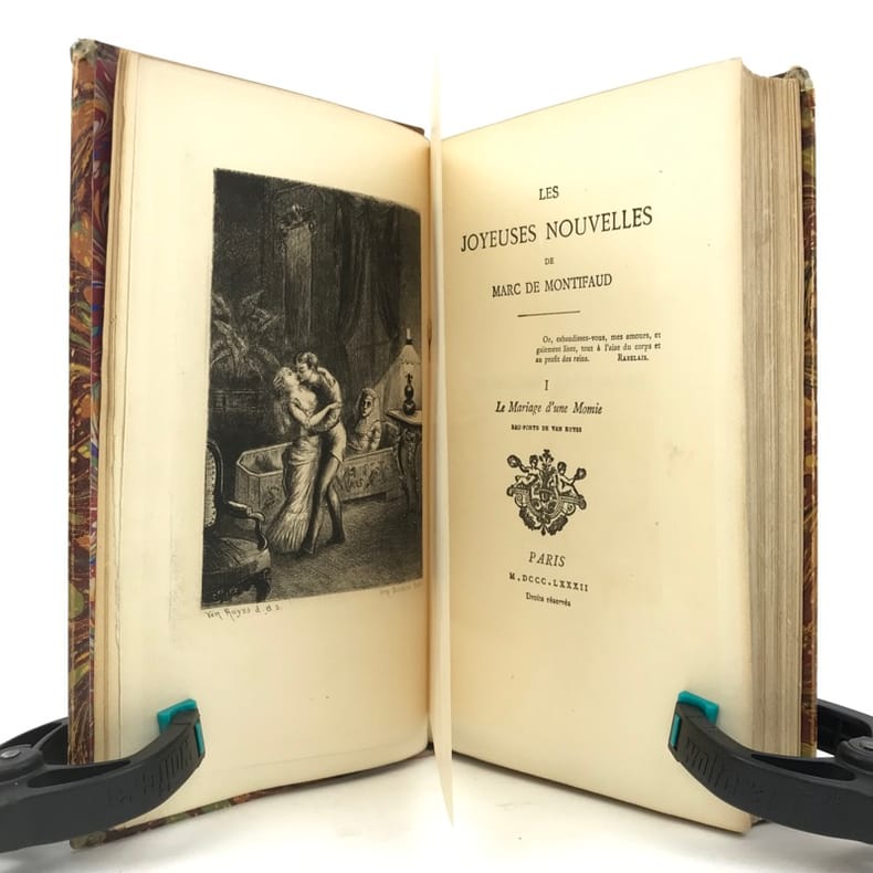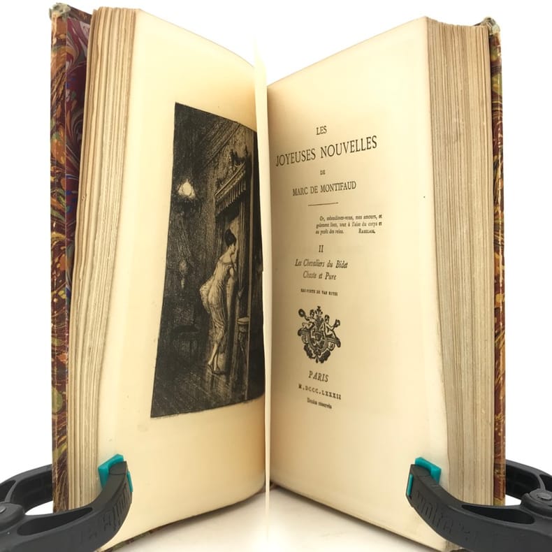 Éditions originales ornée de 20 frontispices finement exécutés à l’eau-forte par Hanriot. On retrouve dans ces nouvelles le style acéré et libre de Madame de Montifaud. Les 19 nouvelles qui forment les recueils étaient toutes publiées avec pagination séparée. Il manque dans les Joyeuses nouvelles le récit intitulé « Manière de s’en servir ». Exemplaire très frais sur Hollande, non rogné. Gay, II, 738.