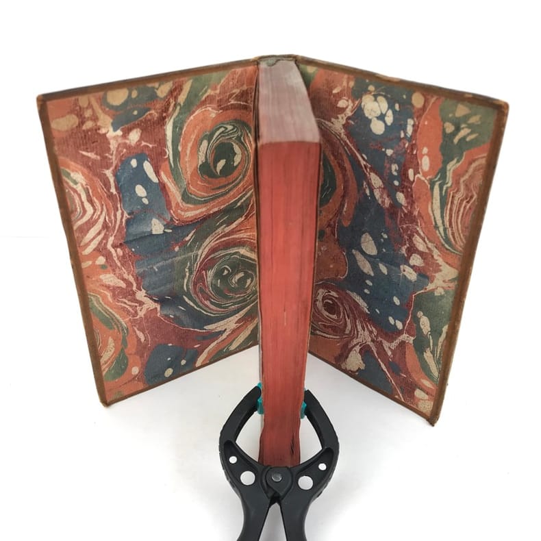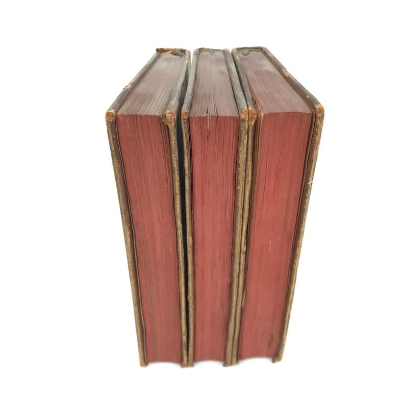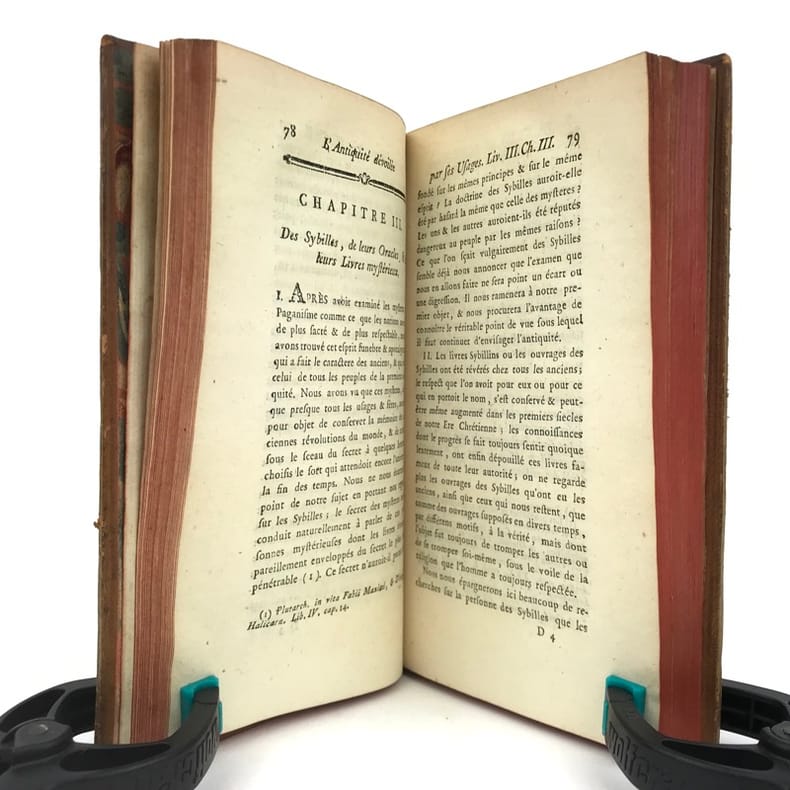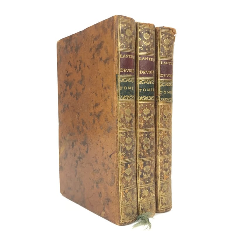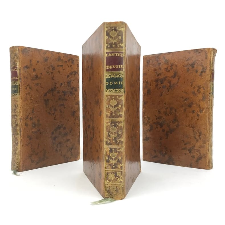 3 volumes in-12 (16,5 cm x 9,5 cm), basane brune marbrée (reliure de l’époque), dos lisse à motifs dorés, pièce de titre rouge, pièce de tomaison verte, tranches rouges. xxiv-358 ; vii-1 bl.-352 ; vii-1 bl.-361-1 bl. pages (complet). Frottements et épidermures à la reliure, accident à la coiffe de tête du tome III, mors fendu au tome III (1 cm), feuillets légèrement brunis. État très correct tout de même. Nouvelle édition. Nicolas-Antoine Boulanger (ou Boullanger), (1722-1759), est un ingénieur, homme de lettres et philosophe français dont l’œuvre est principalement posthume. Dans son ouvrage L'Antiquité dévoilée, publiée pour la première fois en 1766, Boulanger cherche à expliquer par des symboles astronomiques, mais surtout par la terreur que le Déluge inspira aux hommes, les superstitions et les pratiques religieuses de l'humanité. Agréable exemplaire.