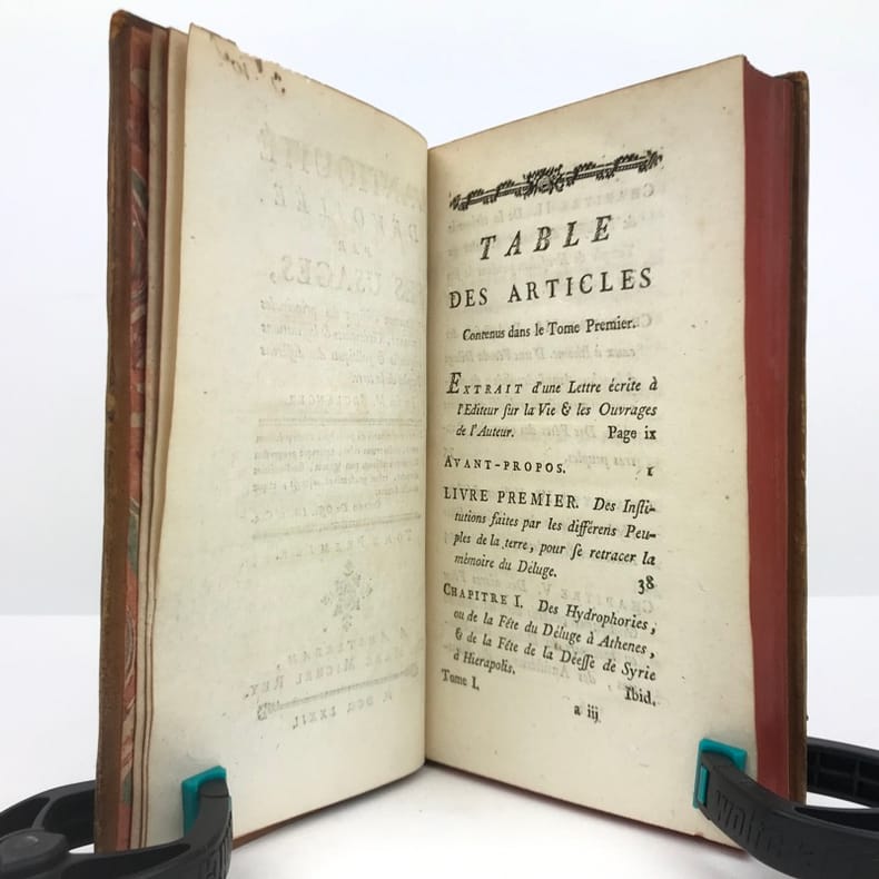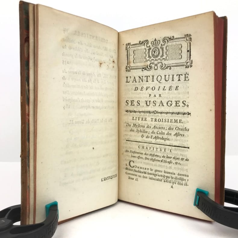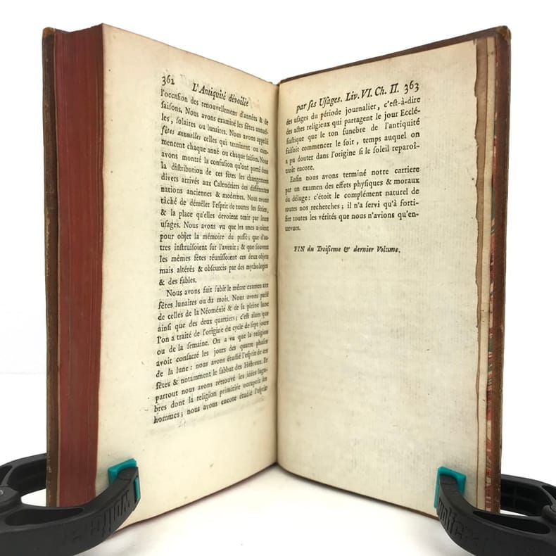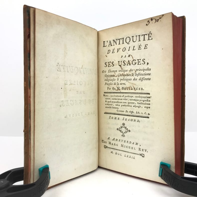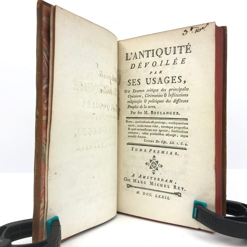 Ouvrage posthume, remanié par d’Holbach, l’Antiquité dévoilée ambitionne d’interpréter superstitions et les pratiques religieuses de l'humanité par l'empreinte cataclysmes de la nature, notamment le déluge. Bon état d’occasion