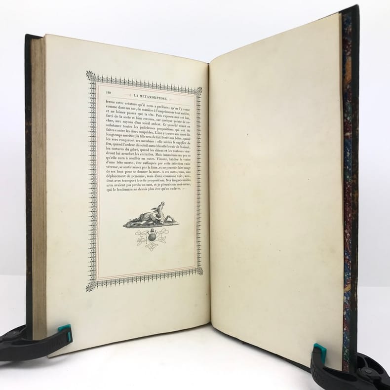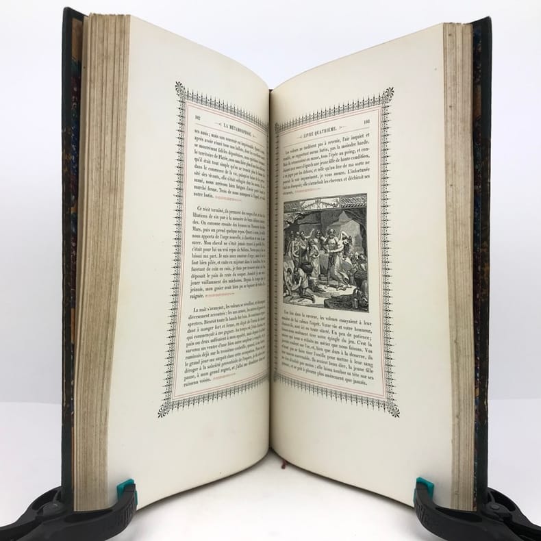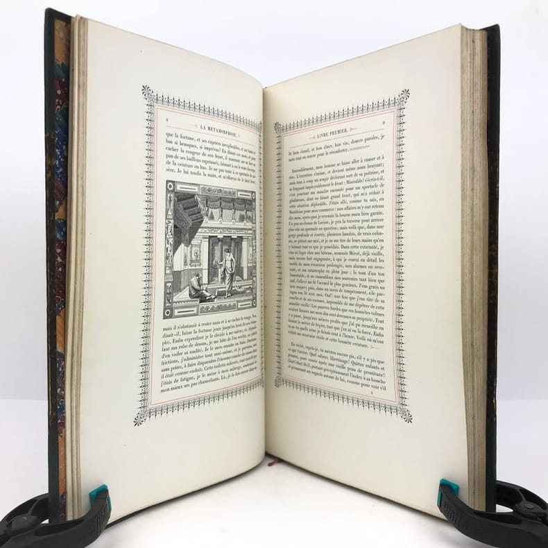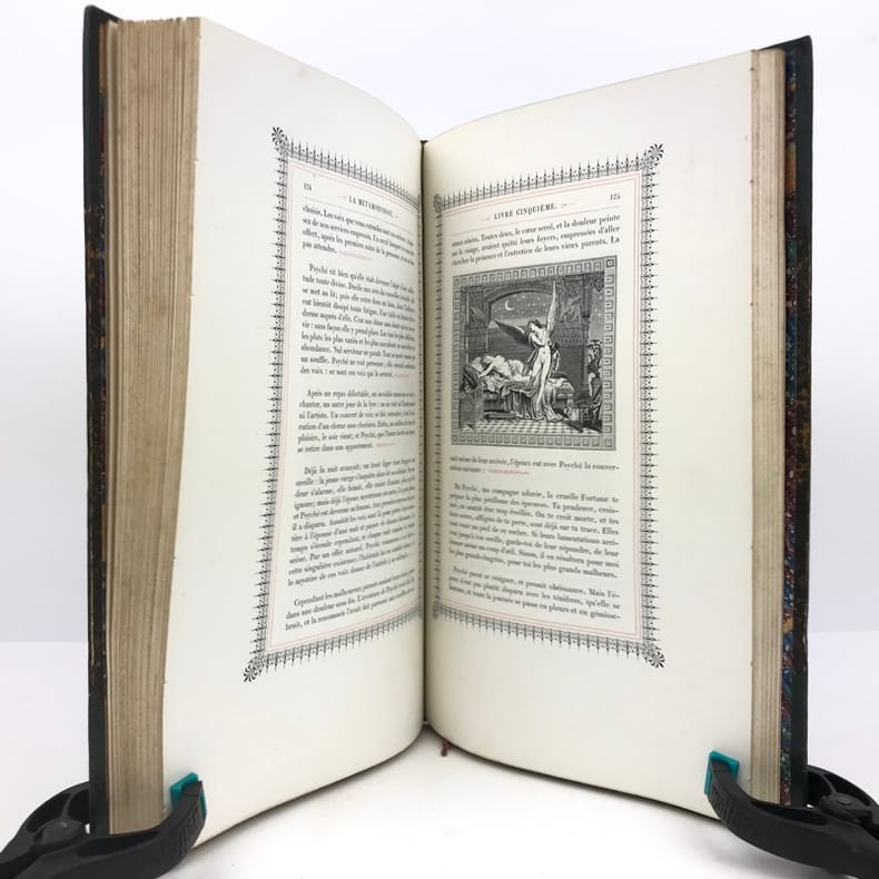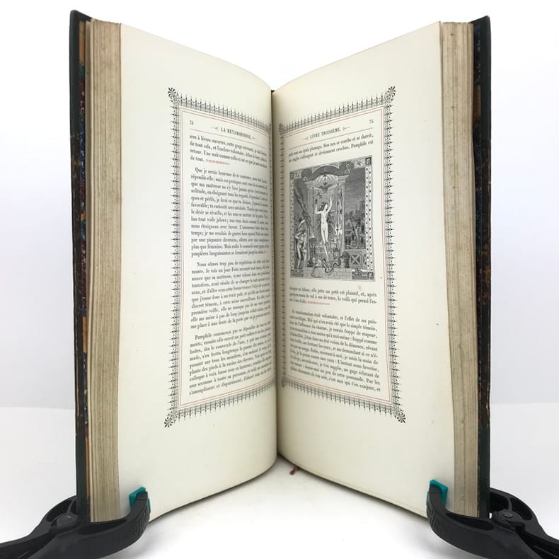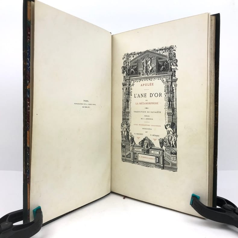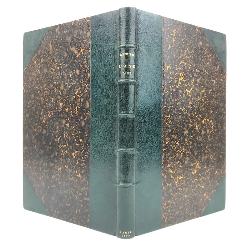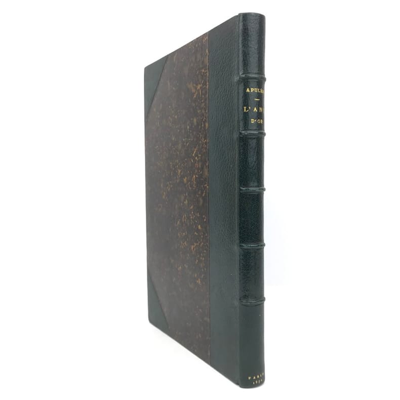 1 volume in-4 (25,5 cm x 16 cm), demi-maroquin vert à coins (reliure de l’époque), dos à nerfs avec titre et auteur dorés, tête dorée, texte joliment encadré. [4]-v-1 bl.-180 pages (complet). Piqûres. Bon état. Nouvelle édition de L'Âne d’or, traduit par Savalète, illustrée d’un titre-gravé ainsi que de nombreuses vignettes in-texte et à pleine-page de A. Racinet et P. Bénard. Né vers 125 à Madaure, et fils de notables locaux, Apulée, auteur prolifique du deuxième siècle, est surtout connu dans la littérature pour son roman, L’Âne d’or. Jubilant dans le baroque aux confins de l'érotisme, du fantastique et de la mort, Les Métamorphoses d’Apulée, seul roman latin dont nous possédions le texte intégral, racontent à la première personne les tribulations d’un naïf trop curieux qu’une opération de sorcellerie ratée a transformé en âne, et tissent dans tous les styles la trame parodique d’une comédie humaine dont le dénouement est procuré par l’intervention d’Isis-Reine, Déesse Éminentissime. Bel exemplaire.