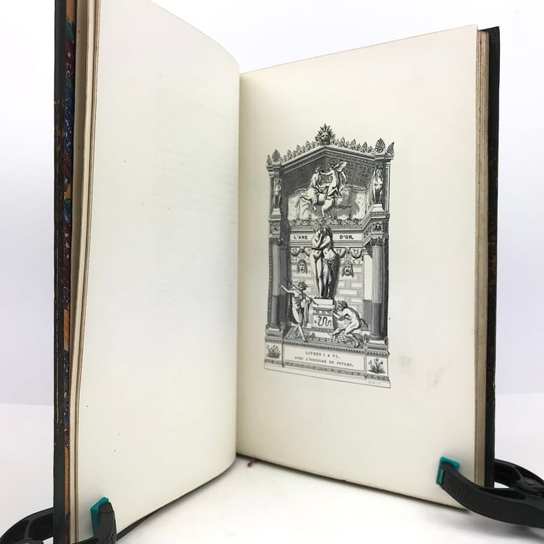 Paris Firmin-Didot 1872 1 vol. relié gr. in-8, demi-maroquin noir à coins bordés d'un double-filet doré, dos à nerfs, caissons richement décorés de motifs dorés, tête dorée, V + 180 pp. Jolie édition des 6 premiers livres de L'âne d'or, ornée de frises décoratives en encadrement et de nombreuses gravures par A. Racinet et P. Bénard. Ex-libris gravé au contreplat. Petit accroc en tête du plat supérieur, sans gravité, sinon bel exemplaire bien relié à l'époque.