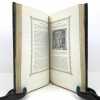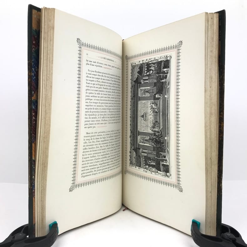 1872 Couverture rigide Paris, Firmin-Didot, 1872. Grand in-8, reliure en plein maroquin rouge, trois filets dorés sur les plats, dos à 5 nerfs richement orné de 5 motifs représentant l'âne d'or, tranche supérieure dorée, dentelles intérieures, reliure signée ALLO au premier contreplat en pied, papier à la cuve aux contreplats. Vignette au feuillet de faux-titre, titre frontispice, V pages, 180 pages, (livres I à VI), illustrées de nombreuses gravures dans le texte et à pleine page dessinées par A. Racinet et P. Bénard, texte encadré d’ornementations en noir et rouge.Ouvrage traduit par Savalète, préface de J. Andrieux. Premier tirage non cartonné aux pages 35, 43, 73.Bel exemplaire dans une reliure signée Allô.