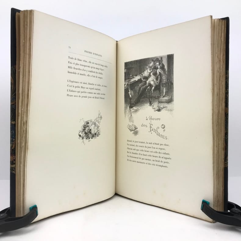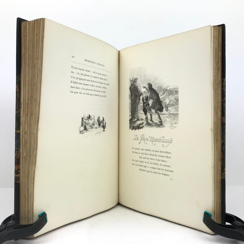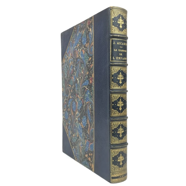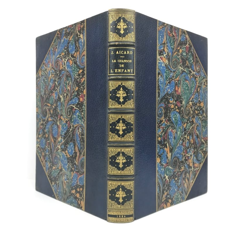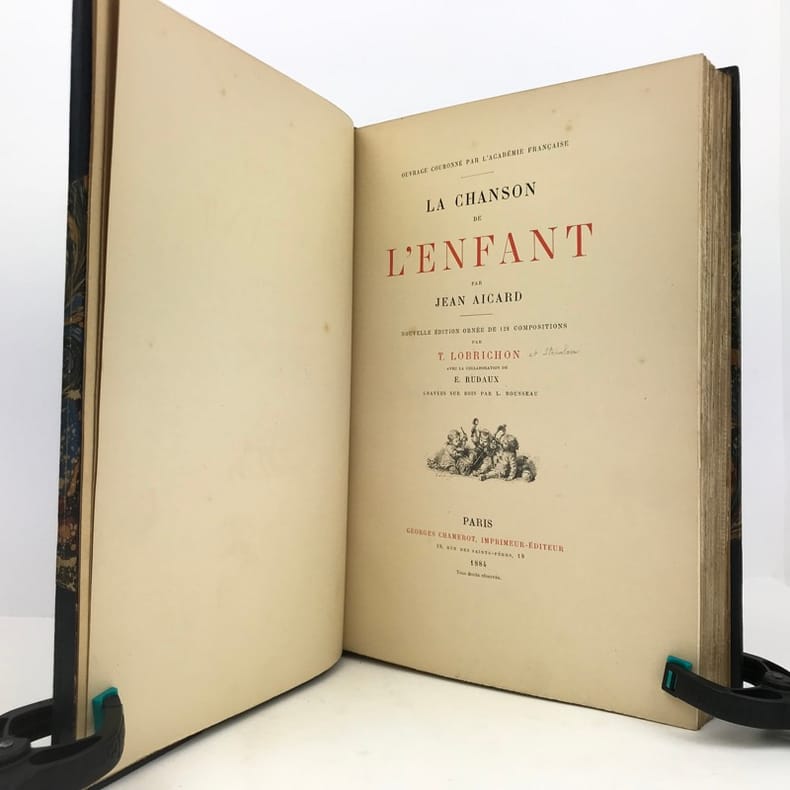 1 volume in-4 (28 cm x 18 cm), demi-maroquin bleu à coins (reliure de l’époque signée L. Pouillet), dos à nerfs orné de motifs dorés, tête dorée, couverture et dos conservés. [8]-268 pages (complet). Rousseurs. Nouvelle édition de ce recueil de chants pour enfants; illustrée de 123 compositions in-texte ou à pleine-page, par T. Lobrichon. Bel exemplaire.