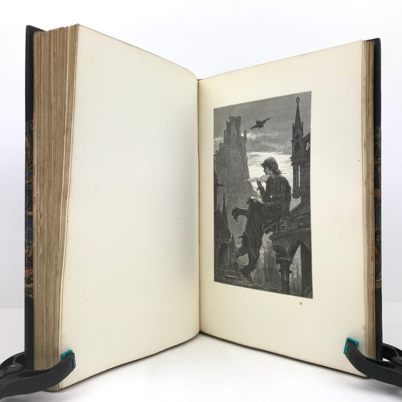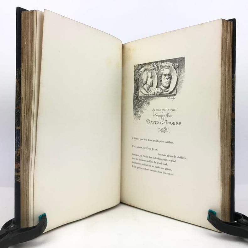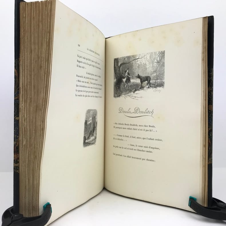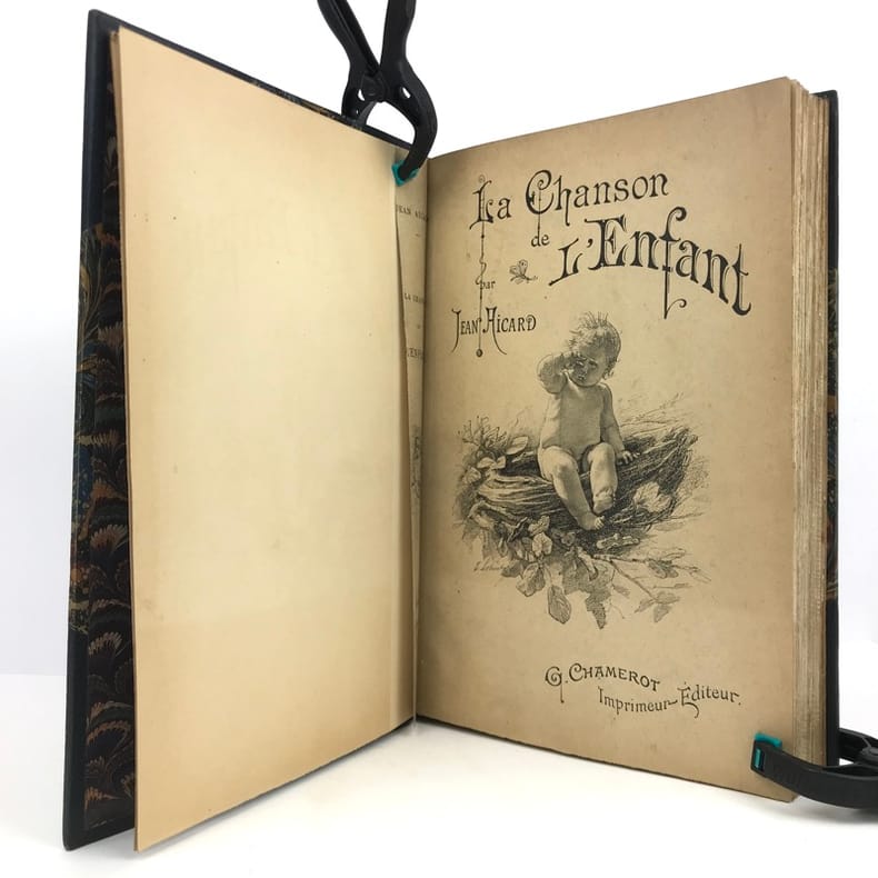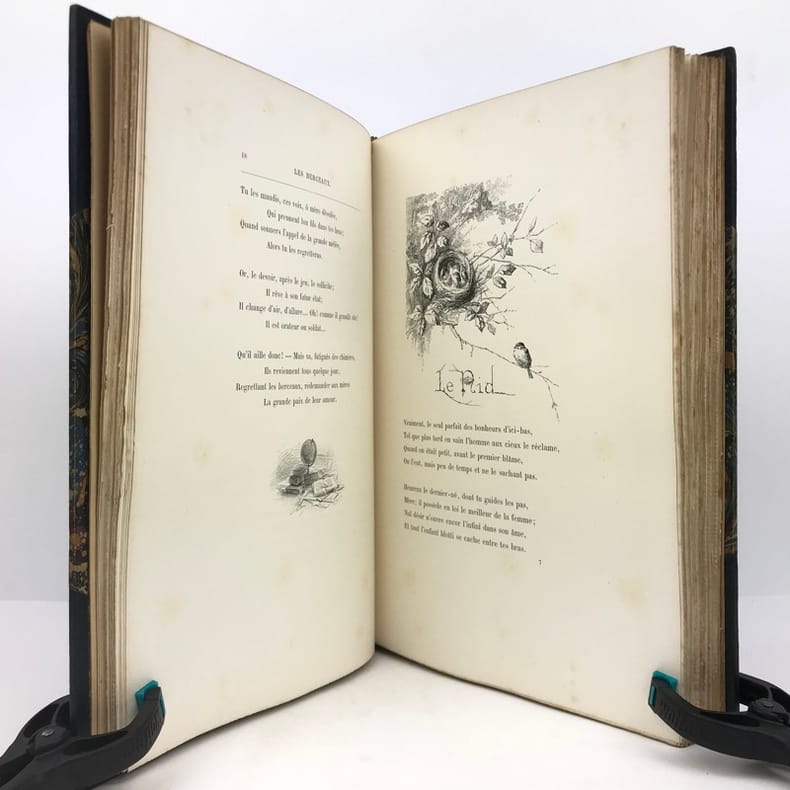 1 volume in-4 (28 cm x 18 cm), demi-maroquin bleu à coins (reliure de l’époque signée L. Pouillet), dos à nerfs orné de motifs dorés, tête dorée, couverture et dos conservés. [8]-268 pages (complet). Rousseurs. Nouvelle édition de ce recueil de chants pour enfants; illustrée de 123 compositions in-texte ou à pleine-page, par T. Lobrichon. Bel exemplaire.