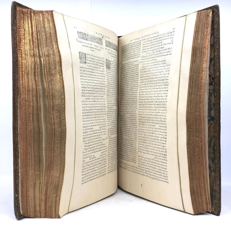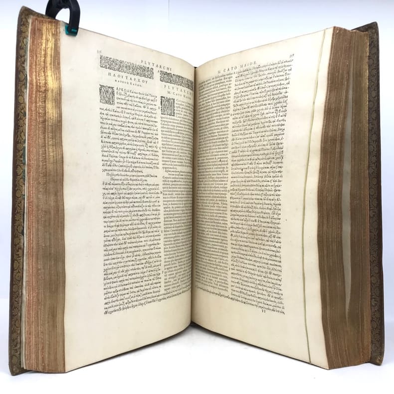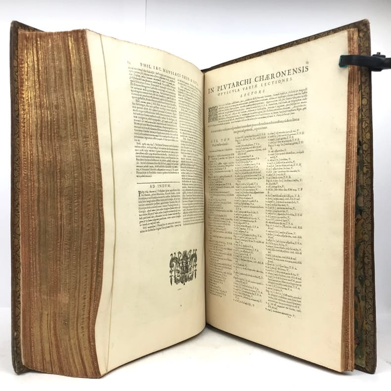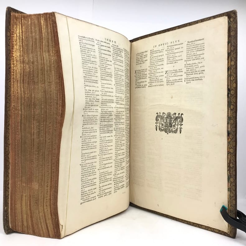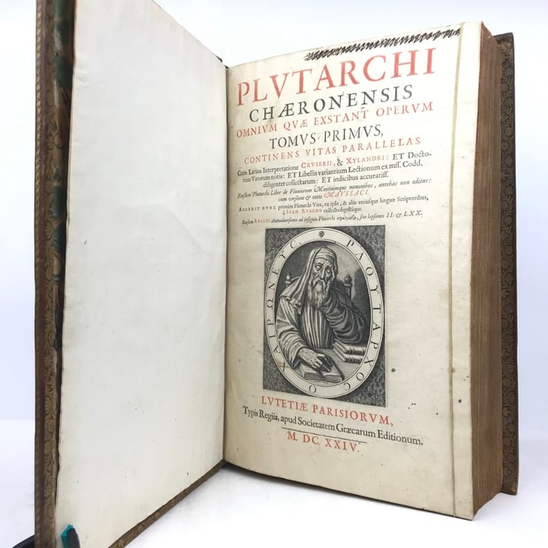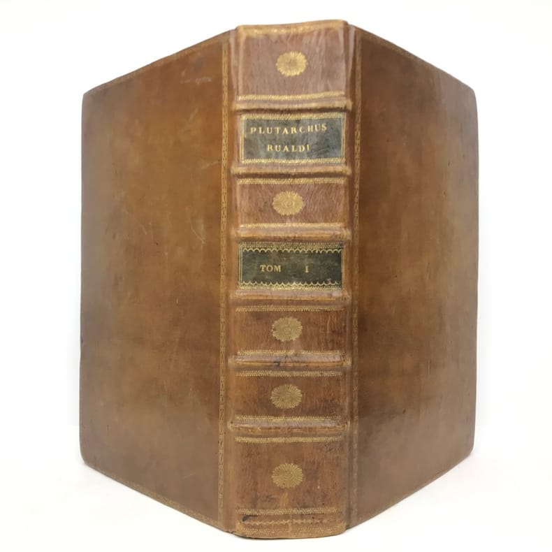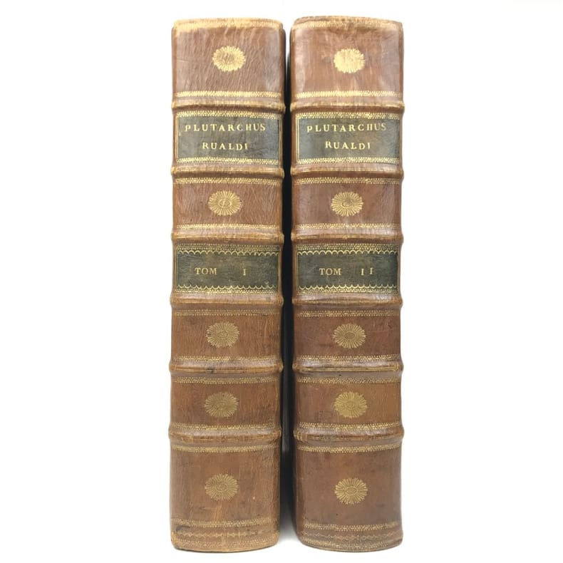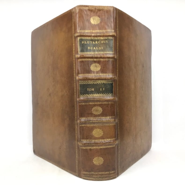 2 volumes fort in-folio (41 x 27 cm), maroquin citron (reliure postérieure du XVIIIe siècle), dos à nerfs orné, pièces de titre et de tomaison en maroquin vert, roulette dorée encadrant les plats, sur les coupes et sur les chasses, tranches dorées, titre en rouge et noir, texte sur double colonne, ex-libris cancellé en tête de la page de titre, timbre sec, 42-[2]-1076-114-[44]-66-[2]-67 à 150-[8] ; [8]-1164-[4]-84-13 à 80-[48] pages (complet). Infimes frottements aux coins, quelques traces sur des feuillets et quelques rousseurs, nombreuses erreurs de pagination inhérente à l'édition sans manque de texte. Très bon état. Nouvelle édition bilingue, avec le texte latin en regard de la traduction grecque. Elle est également illustrée d’un portrait en médaillon de l’auteur, sur les pages de titre, ainsi que d’un second portrait à pleine page au tome II. Recueil des principales œuvres de Plutarque, philosophe et historien du Ier siècle de notre ère. Nous y retrouvons notamment les célèbres Vies parallèles, mettant chacune en scène un personnage latin et un personnage grec, ainsi que ses Œuvres morales, véritable source d’inspiration pour les penseurs humanistes de la Renaissance. Bel exemplaire.