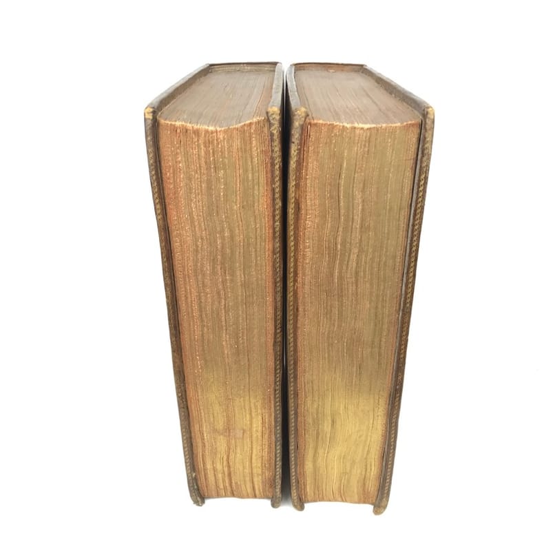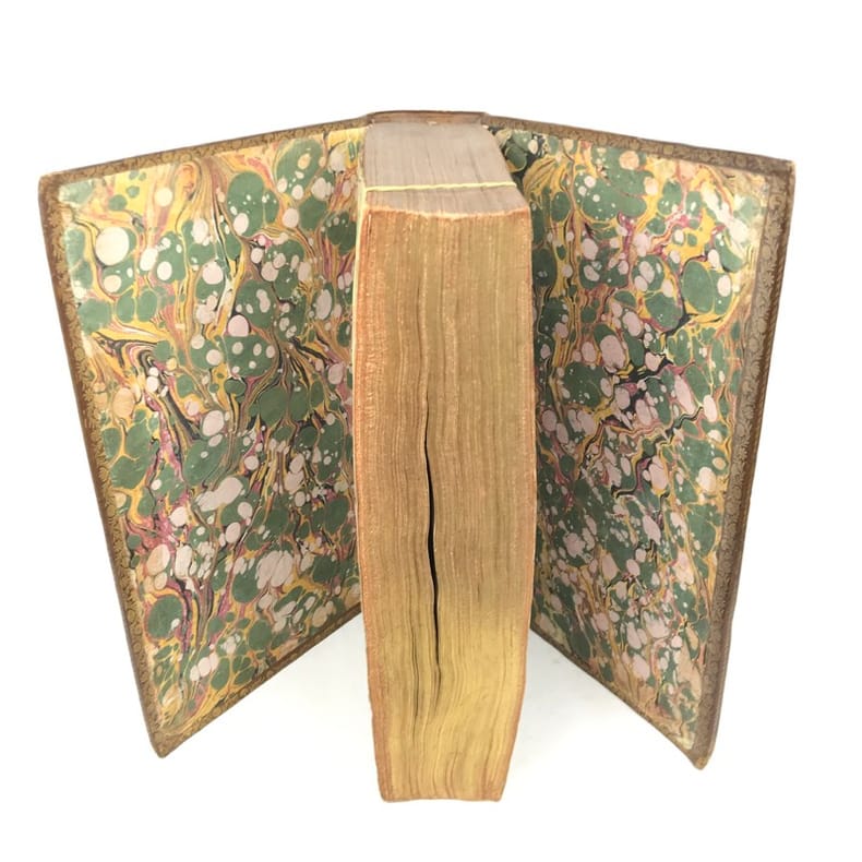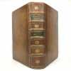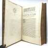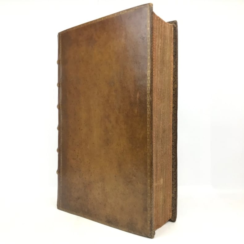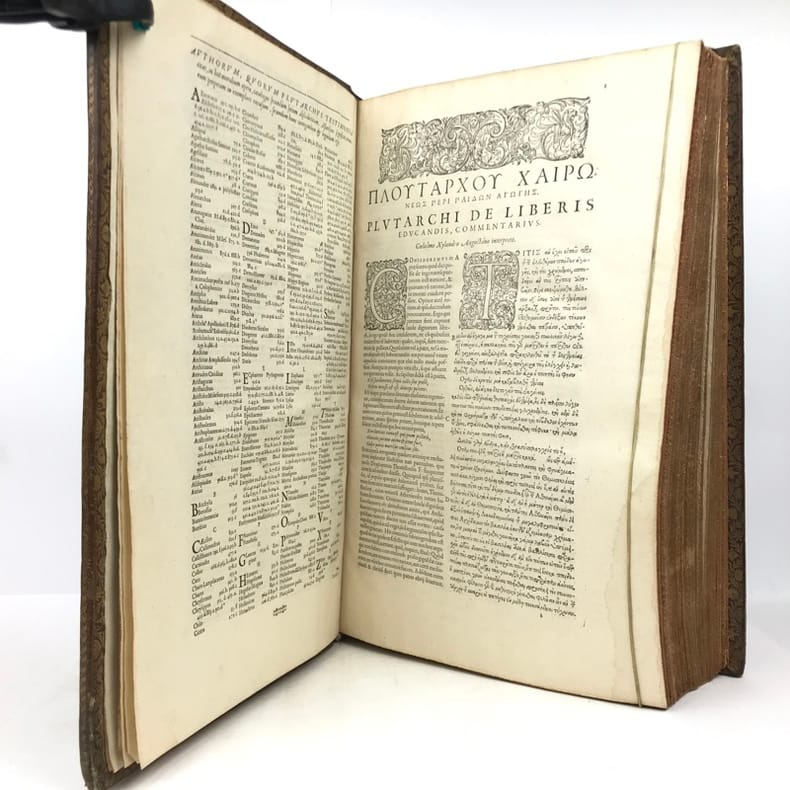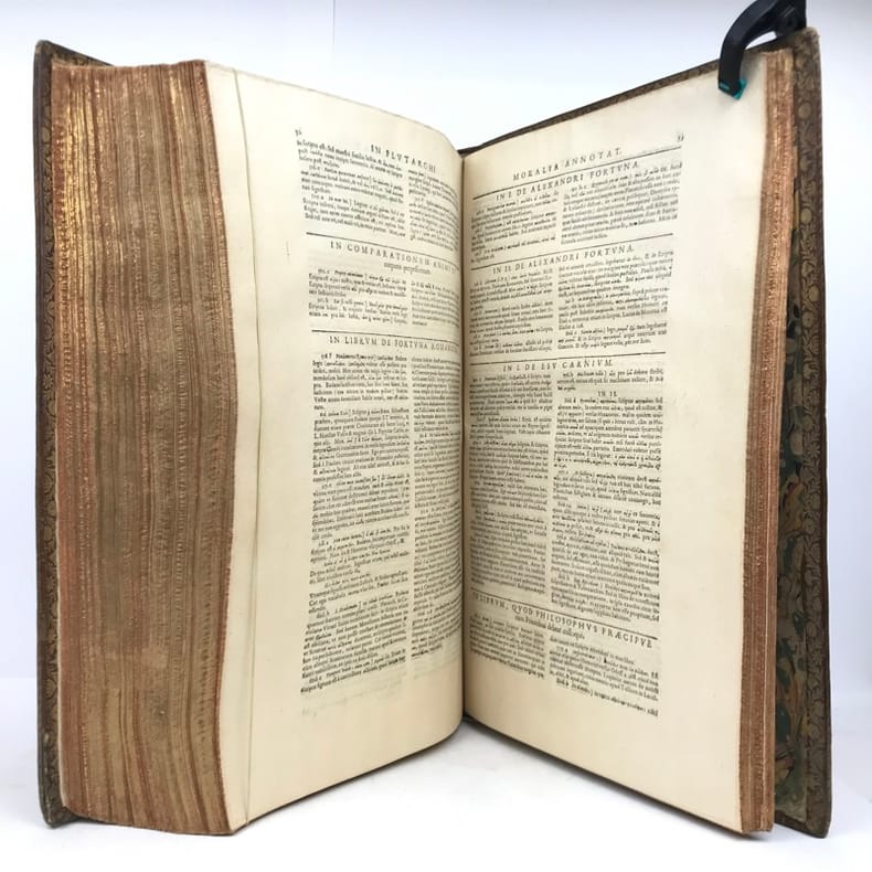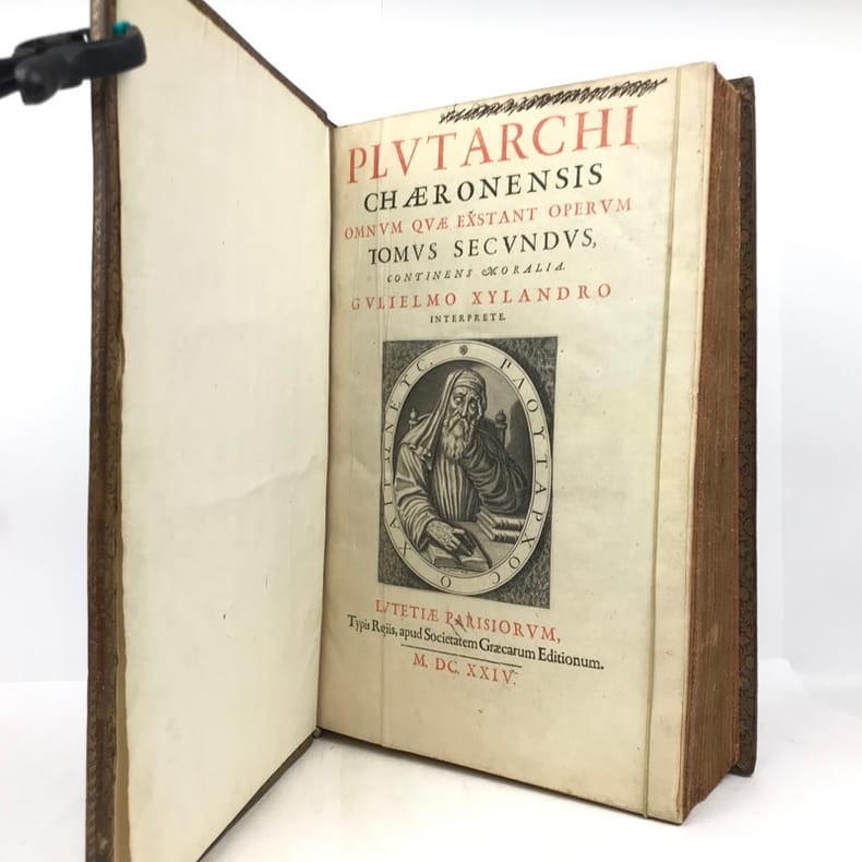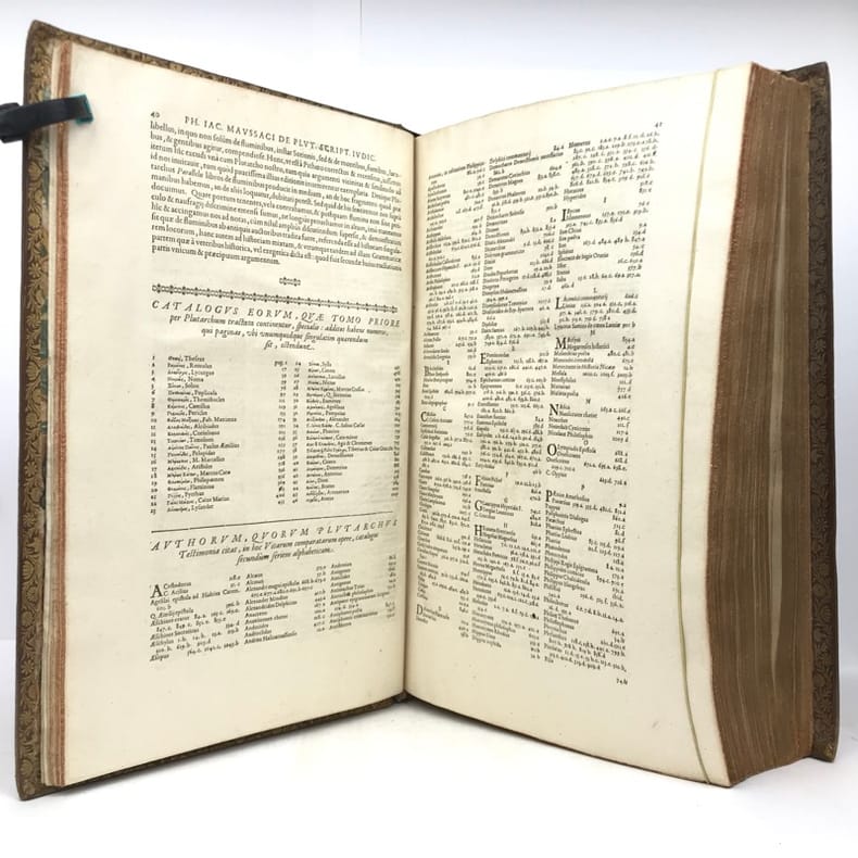 2 volumes fort in-folio (41 x 27 cm), maroquin citron (reliure postérieure du XVIIIe siècle), dos à nerfs orné, pièces de titre et de tomaison en maroquin vert, roulette dorée encadrant les plats, sur les coupes et sur les chasses, tranches dorées, titre en rouge et noir, texte sur double colonne, ex-libris cancellé en tête de la page de titre, timbre sec, 42-[2]-1076-114-[44]-66-[2]-67 à 150-[8] ; [8]-1164-[4]-84-13 à 80-[48] pages (complet). Infimes frottements aux coins, quelques traces sur des feuillets et quelques rousseurs, nombreuses erreurs de pagination inhérente à l'édition sans manque de texte. Très bon état. Nouvelle édition bilingue, avec le texte latin en regard de la traduction grecque. Elle est également illustrée d’un portrait en médaillon de l’auteur, sur les pages de titre, ainsi que d’un second portrait à pleine page au tome II. Recueil des principales œuvres de Plutarque, philosophe et historien du Ier siècle de notre ère. Nous y retrouvons notamment les célèbres Vies parallèles, mettant chacune en scène un personnage latin et un personnage grec, ainsi que ses Œuvres morales, véritable source d’inspiration pour les penseurs humanistes de la Renaissance. Bel exemplaire.
