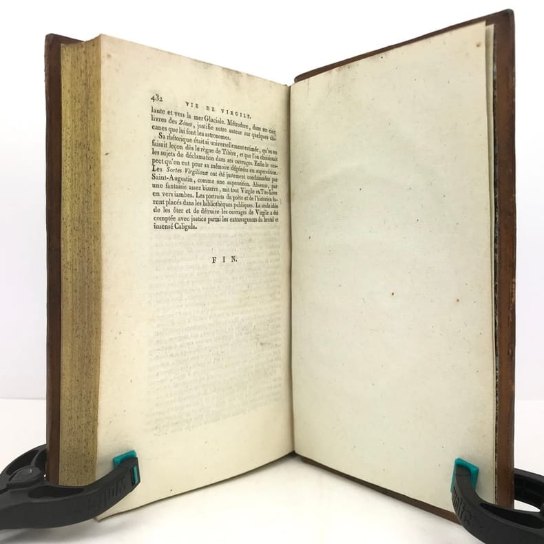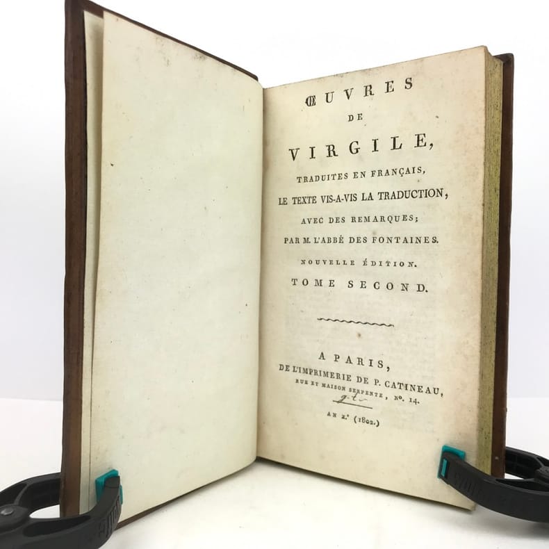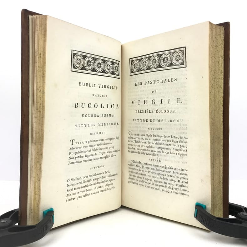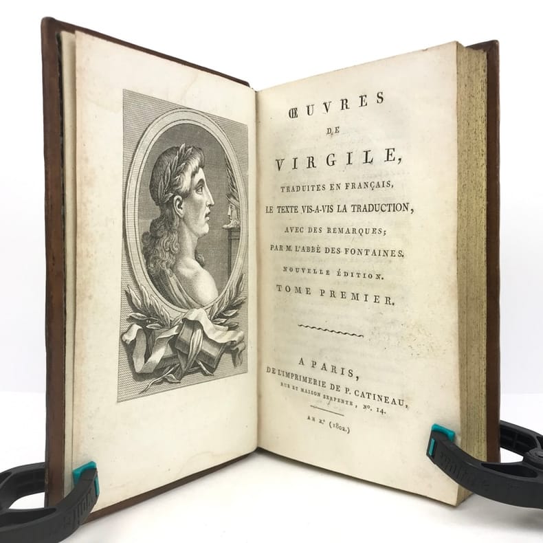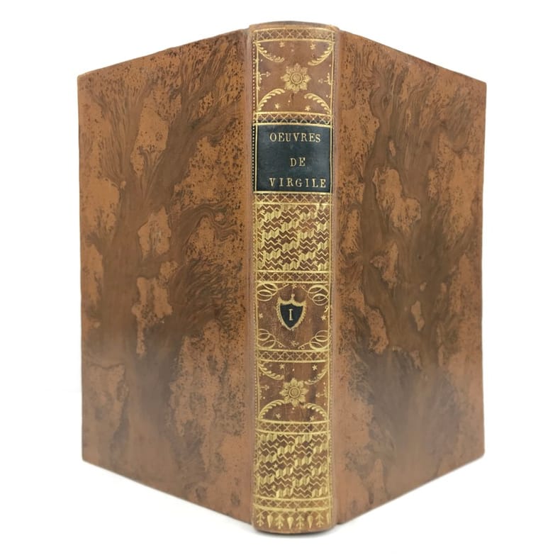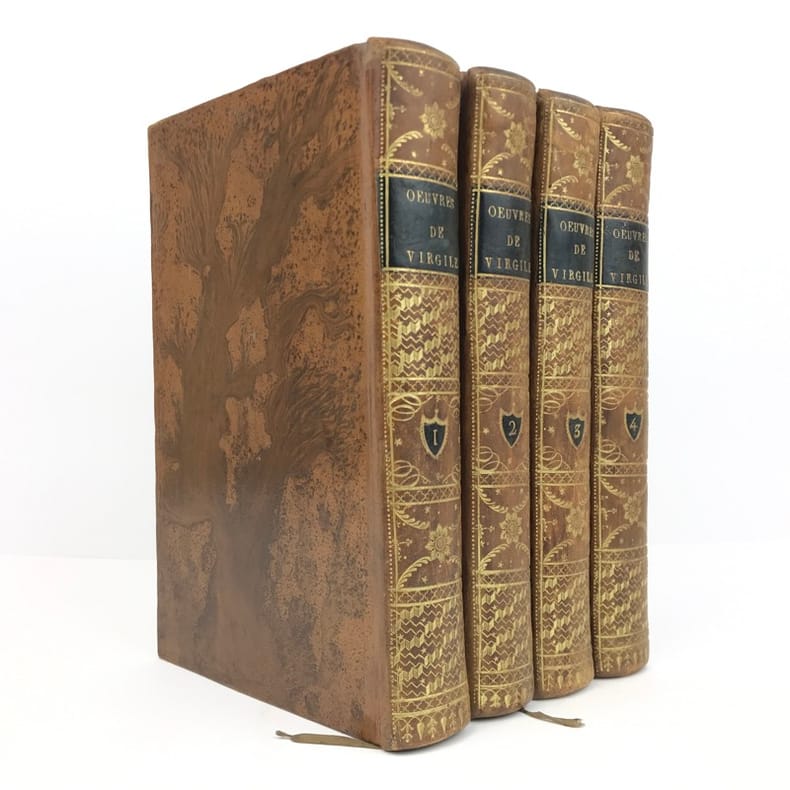 4 volumes in-8 (19,5 cm x 12 cm), basane brune racinée (reliure de l’époque), dos lisse à motifs dorés, pièce de titre et de tomaison noires. xl-42 à 438 ; 360 ; 388 ; 432 pages. Manque possiblement la page de faux-titre à chaque tome. Feuillets légèrement ternis. Bon état. Nouvelle édition bilingue, latin-français, avec les commentaires de l’Abbé des fontaines, illustrée d’un frontispice ainsi que de 15 gravures hors-texte. Virgile est né en Lombardie, dans le nord de l’Italie. Il meurt en l’an 19 avant notre ère, à l’âge de 51 ans. Il est le grand poète de la Rome païenne, qui célébrait dans ses Géorgiques et juste avant la célébration de l’Homme-Dieu, les pâtures et les bergers. Son but ultime était la littérature, ou plus précisément la poésie. Durant ses études de rhétorique, il éprouve une certaine répulsion pour la vie à Rome et se fait couper les vivres par ses parents, qui étaient paysans. Il écrit alors les Bucoliques en 39 av. J.-C. et s’affirme sur la scène littéraire en tant que poète. Puis il écrira les Géorgiques, à Naples, un poème qu’il fera lire à Octave, le futur Auguste, qui lui commandera l’Énéide. Agréable exemplaire.