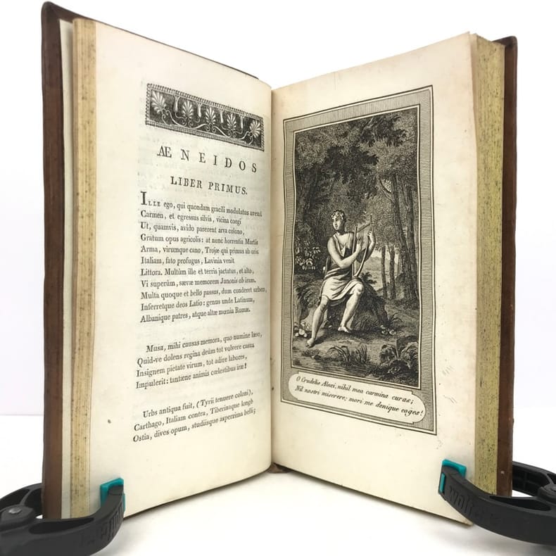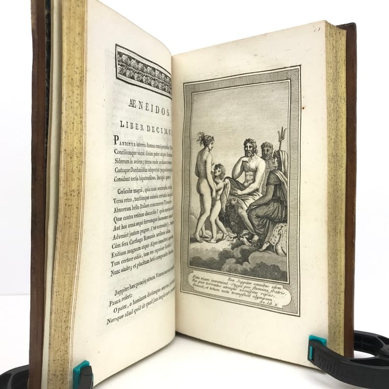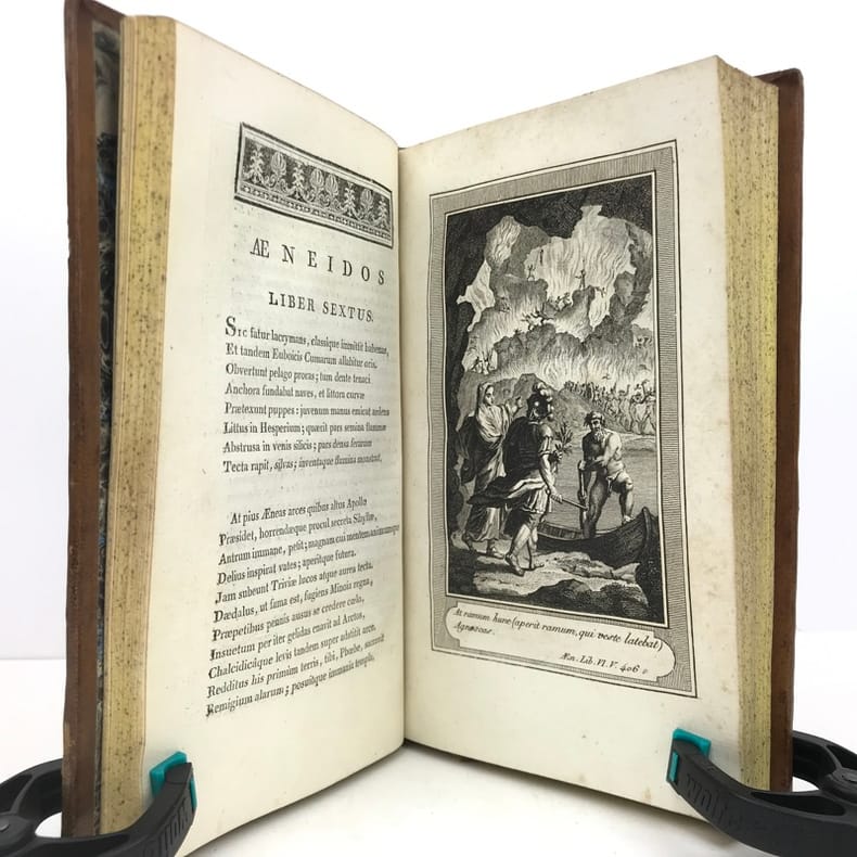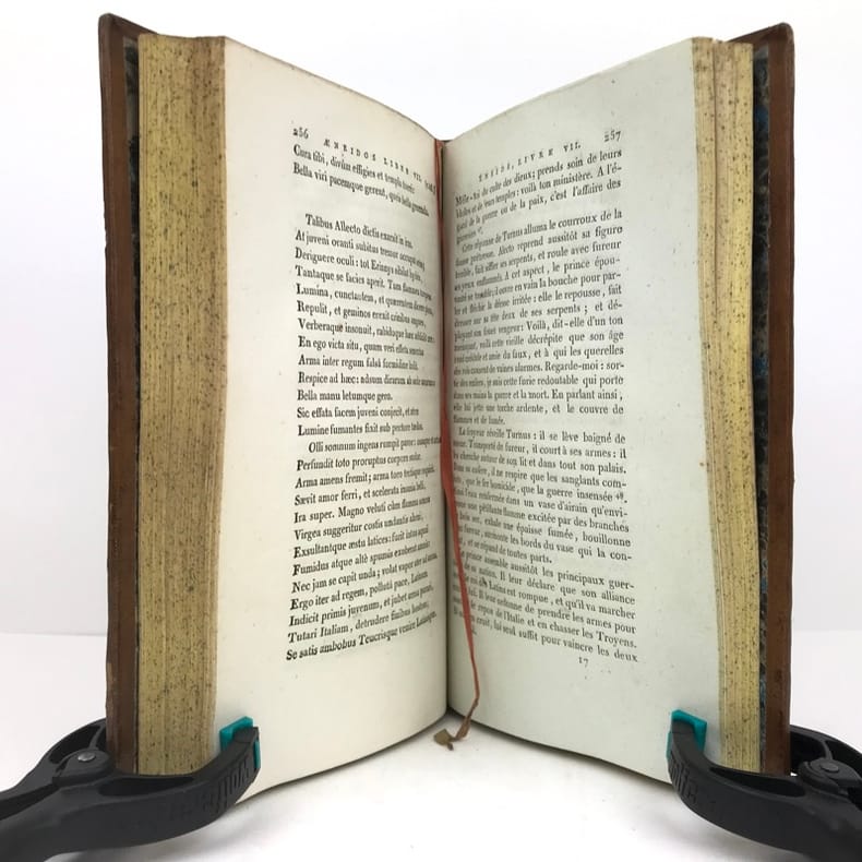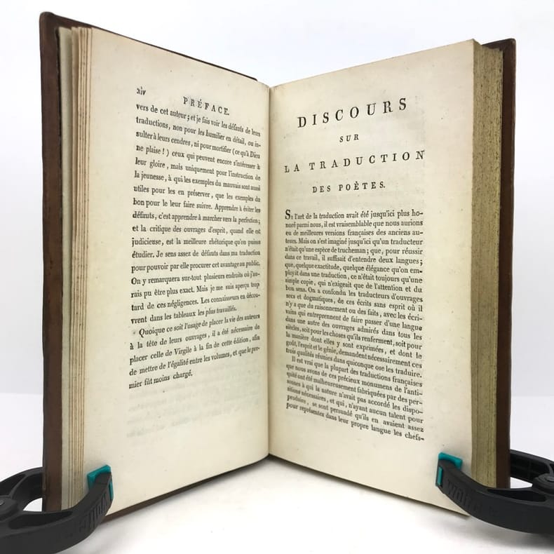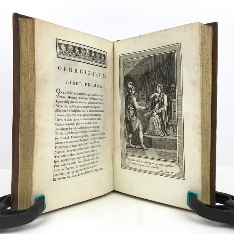4 volumes in-8 (19,5 cm x 12 cm), basane brune racinée (reliure de l’époque), dos lisse à motifs dorés, pièce de titre et de tomaison noires. xl-42 à 438 ; 360 ; 388 ; 432 pages. Manque possiblement la page de faux-titre à chaque tome. Feuillets légèrement ternis. Bon état. Nouvelle édition bilingue, latin-français, avec les commentaires de l’Abbé des fontaines, illustrée d’un frontispice ainsi que de 15 gravures hors-texte. Virgile est né en Lombardie, dans le nord de l’Italie. Il meurt en l’an 19 avant notre ère, à l’âge de 51 ans. Il est le grand poète de la Rome païenne, qui célébrait dans ses Géorgiques et juste avant la célébration de l’Homme-Dieu, les pâtures et les bergers. Son but ultime était la littérature, ou plus précisément la poésie. Durant ses études de rhétorique, il éprouve une certaine répulsion pour la vie à Rome et se fait couper les vivres par ses parents, qui étaient paysans. Il écrit alors les Bucoliques en 39 av. J.-C. et s’affirme sur la scène littéraire en tant que poète. Puis il écrira les Géorgiques, à Naples, un poème qu’il fera lire à Octave, le futur Auguste, qui lui commandera l’Énéide. Agréable exemplaire.