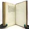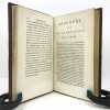 Édition originale de cette traduction française des Œuvres de Virgile comprenant les Bucoliques, les Géorgiques et l’Enéide. Brunet, V, 1301; Frère, Manuel du bibliophile normand, I, p.9. Cette traduction en vers est due aux frères Robert et Antoine Le Chevalier d’Agneaux. L’Enéide commence par un titre à part orné de la marque de Guillaume Auvray. «Antoine Chevalier, surnommé d’Agneaux, natif de Vire en Normandie, frère puiné de Robert Chevalier, &c. Ils ont tous deux traduit fort doctement les œuvres de Virgile en vers François, avec la vie dudit Virgile, imprimées à Paris en 1582, chez Perier et Auvray. J’entends qu’ils traduisent aujourd’hui les œuvres d’Horace. Ils florissent cette année 1584, & s’étudient à profiter au public de tout leur pouvoir». (Les Bibliothèques françaises de la Croix du Maine, p. 32) «The two brothers are celebrated as the first translators of Virgil into French verse. They were born at Vire in Normandy, and studied together, the one law and the other medicine, at Paris, Poitiers, Montpellier and Toulouse. After travelling together over great part of France, they retired to their native province, and gave themselves up to literature. In 1582 they produced their translation of the whole works of Virgil, which gained them a high reputation. It appeared at Paris with a dedication to Henri III, and was shortly after reprinted, accompanied with the Latin text. Vauquelin so greatly admired it, that he exclaims in his ‘Art Poëtique’:’Apollon même avoue, Qu’en eux se reconnait le Cigne de Mantoue’. The success of their first production encouraged the brothers to undertake a version of the Odes of Horace…” (The biographical Dictionary, p. 458). «Quelques personnes recherchent encore la traduction de Virgile, en vers, par les frères Robert et Antoine Le Chevalier d’Agneaux, 125 fr. Solar» (Brunet). Très belle édition, admirablement imprimée en italiques. Le titre est orné de la grande marque de Guillaume Auvray. De nombreuses lettrines ornées ainsi que d’élégants bandeaux gravés sur bois ornent la présente édition. «Virgile est l’ami du solitaire, le compagnon des heures secrètes de la vie... Les tableaux de Virgile ne sont pas bornés à de certaines perspectives de la vie; ils représentent toute la nature: ce sont les profondeurs des forêts, l’aspect des montagnes, les rivages de la mer, où des femmes exilées regardent, en pleurant, l’immensité des flots...» Chateaubriand. «Et notamment Vergile en ses Géorgiques que j’estime le plus plein et acomply de la Poësie» (Montaigne, Essais, II, 10). Montaigne admirait tout particulièrement la poésie de Virgile. Il intitula d’ailleurs un de ses essais Sur des vers de Virgile. Très bel exemplaire, grand de marges, conservé dans son vélin doré de l’époque à recouvrement, de ce beau recueil poétique très évocateur du XVIe siècle français. Provenance: Congrégation des missions à Bordeaux avec ex libris manuscrit à l’encre d’une main du XVIIIe siècle sur le titre et la mention cat inscript; ex libris manuscrit du XVIIIe siècle sur la dernière garde.