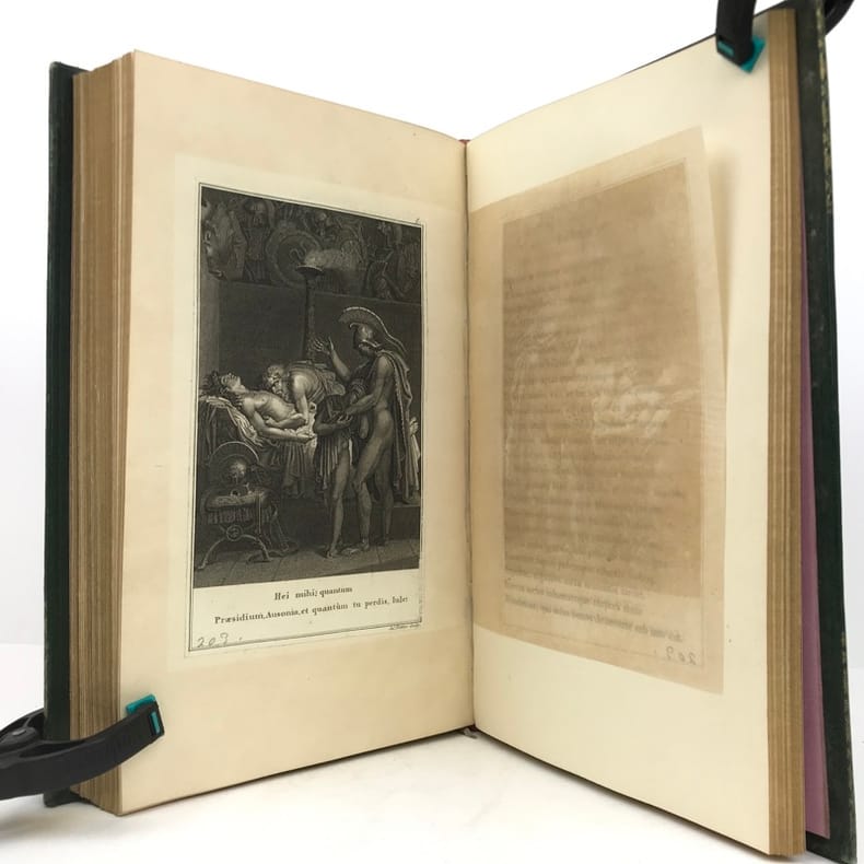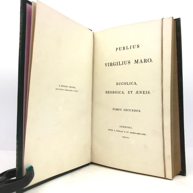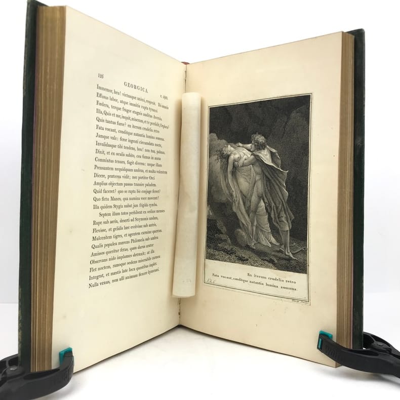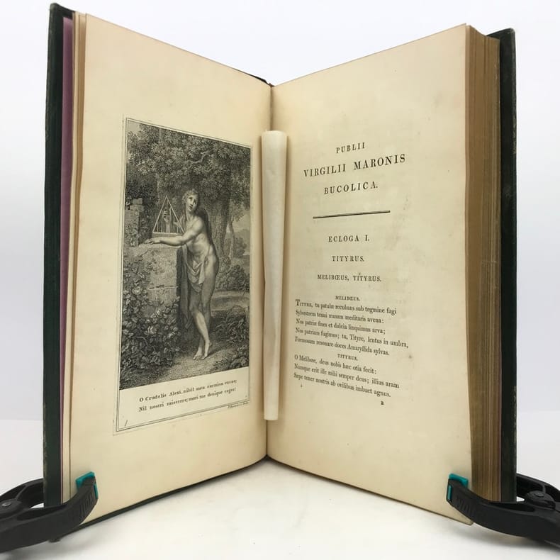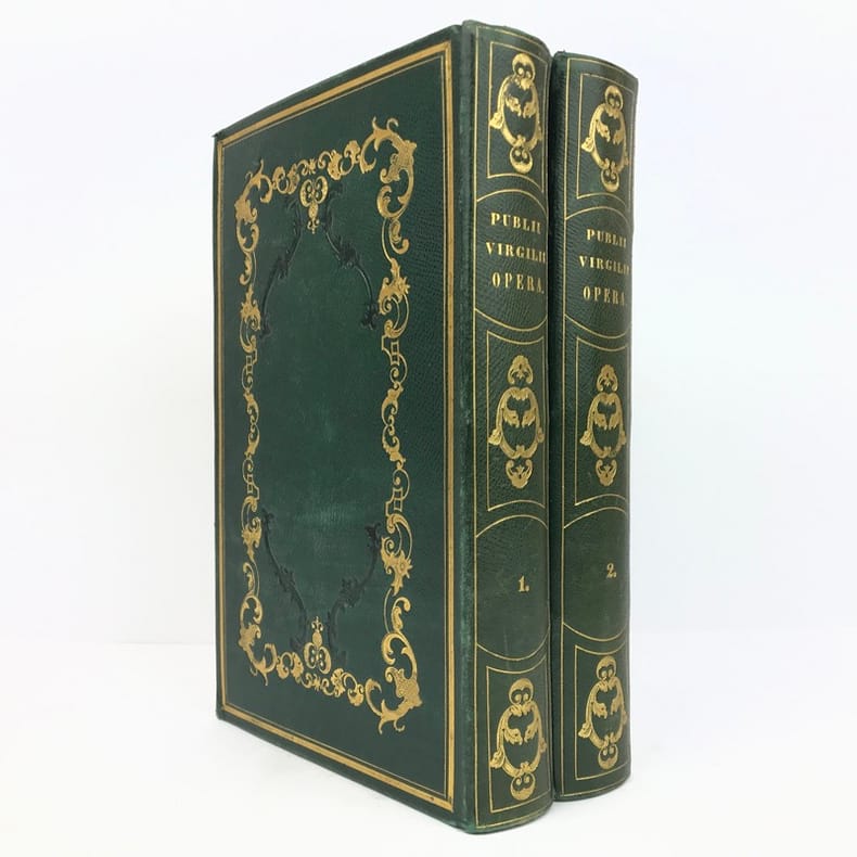 2 volumes in-4 (25,5 cm x 15,5 cm), chagrin vert (reliure de l'époque), dos lisse à motifs dorés, filets dorés en encadrement des plats avec motifs dorés et à froid au centre, tranches dorées, contreplat et gardes en moires roses. [4]-246-32 ; [4]-276 pages (complet). Légers frottements à la reliure, quelques feuillets brunis. Bon état. Nouvelle édition latine illustrée d’une carte et de 66 gravures hors-texte dont la plupart ont été gravées par Fittler et Bartolozzi. Virgile est né en Lombardie, dans le nord de l’Italie. Il meurt en l’an 19 avant notre ère, à l’âge de 51 ans. Il est le grand poète de la Rome païenne, qui célébrait dans ses Géorgiques et juste avant la célébration de l’Homme-Dieu, les pâtures et les bergers. Son but ultime était la littérature, ou plus précisément la poésie. Durant ses études de rhétorique, il éprouve une certaine répulsion pour la vie à Rome et se fait couper les vivres par ses parents, qui étaient paysans. Il écrit alors les Bucoliques en 39 av. J.-C. et s’affirme sur la scène littéraire en tant que poète. Puis il écrira les Géorgiques, à Naples, un poème qu’il fera lire à Octave, le futur Auguste, qui lui commandera l’Énéide. Bel exemplaire.