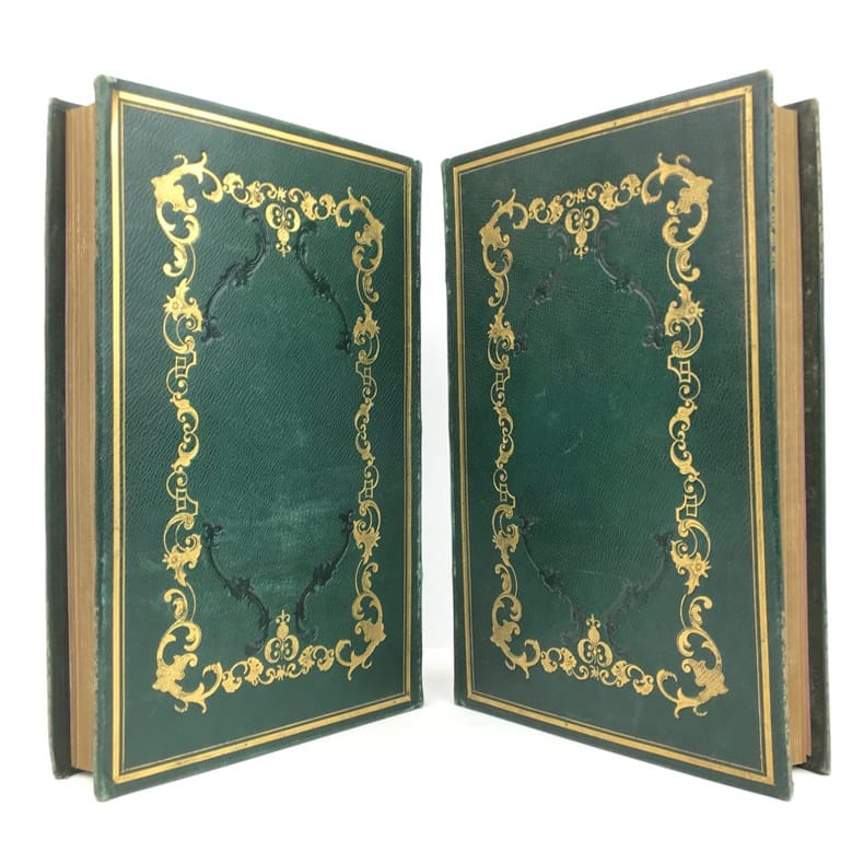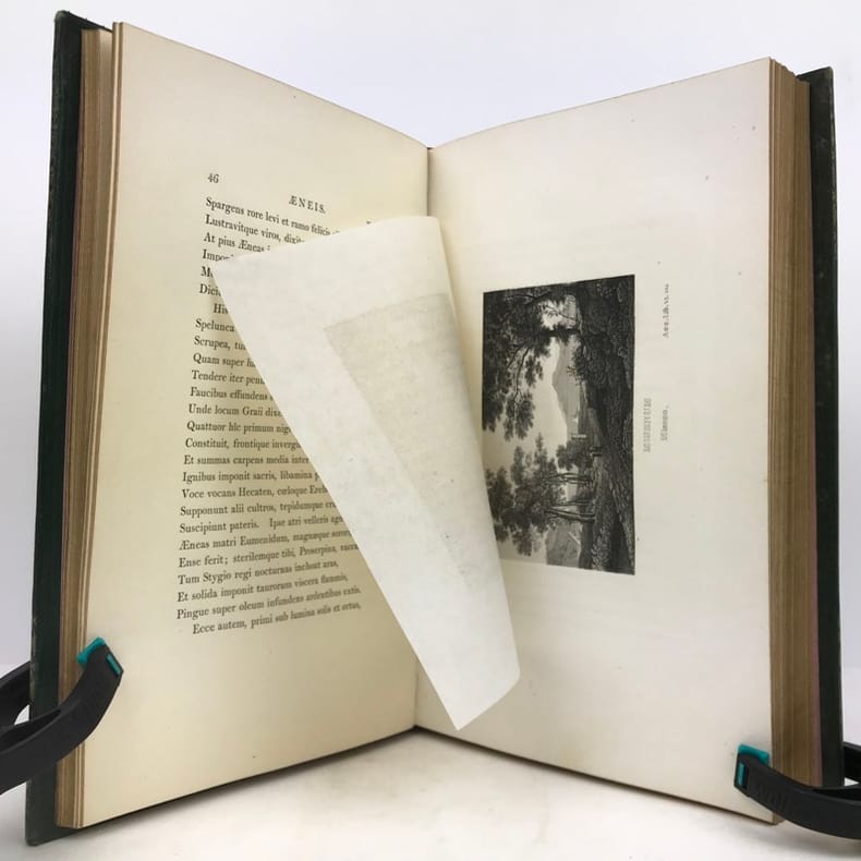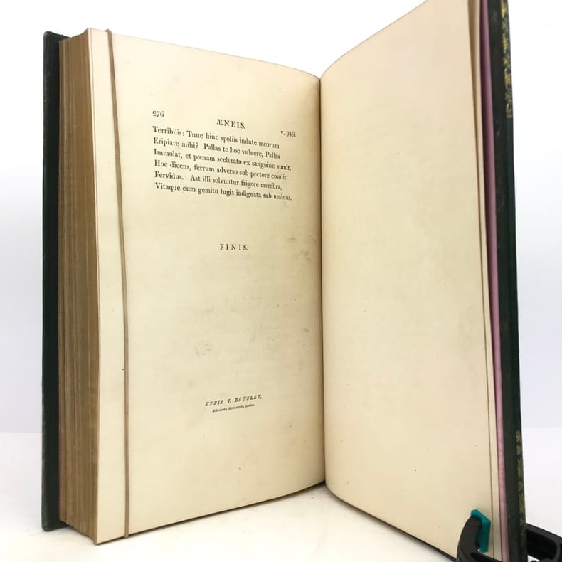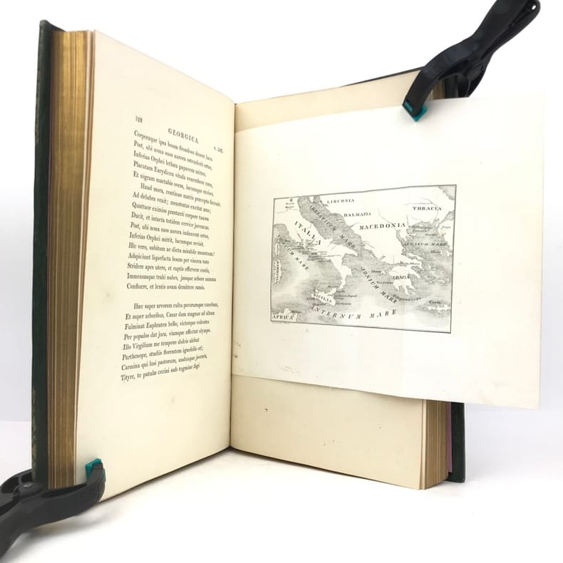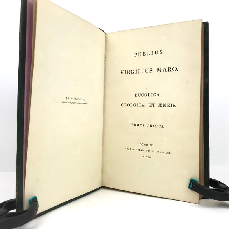 2 volumes in-4 (25,5 cm x 15,5 cm), chagrin vert (reliure de l'époque), dos lisse à motifs dorés, filets dorés en encadrement des plats avec motifs dorés et à froid au centre, tranches dorées, contreplat et gardes en moires roses. [4]-246-32 ; [4]-276 pages (complet). Légers frottements à la reliure, quelques feuillets brunis. Bon état. Nouvelle édition latine illustrée d’une carte et de 66 gravures hors-texte dont la plupart ont été gravées par Fittler et Bartolozzi. Virgile est né en Lombardie, dans le nord de l’Italie. Il meurt en l’an 19 avant notre ère, à l’âge de 51 ans. Il est le grand poète de la Rome païenne, qui célébrait dans ses Géorgiques et juste avant la célébration de l’Homme-Dieu, les pâtures et les bergers. Son but ultime était la littérature, ou plus précisément la poésie. Durant ses études de rhétorique, il éprouve une certaine répulsion pour la vie à Rome et se fait couper les vivres par ses parents, qui étaient paysans. Il écrit alors les Bucoliques en 39 av. J.-C. et s’affirme sur la scène littéraire en tant que poète. Puis il écrira les Géorgiques, à Naples, un poème qu’il fera lire à Octave, le futur Auguste, qui lui commandera l’Énéide. Bel exemplaire.