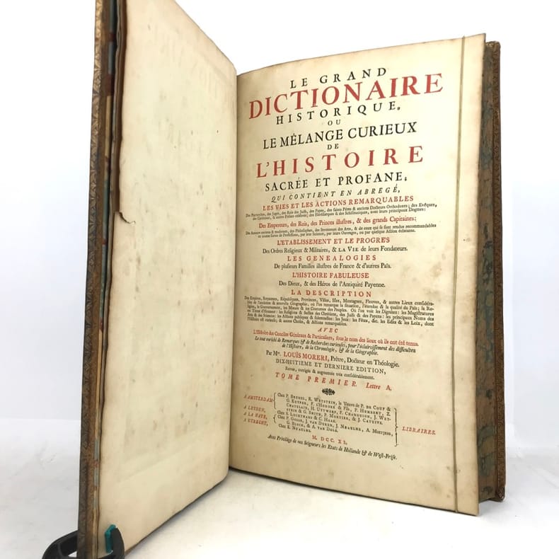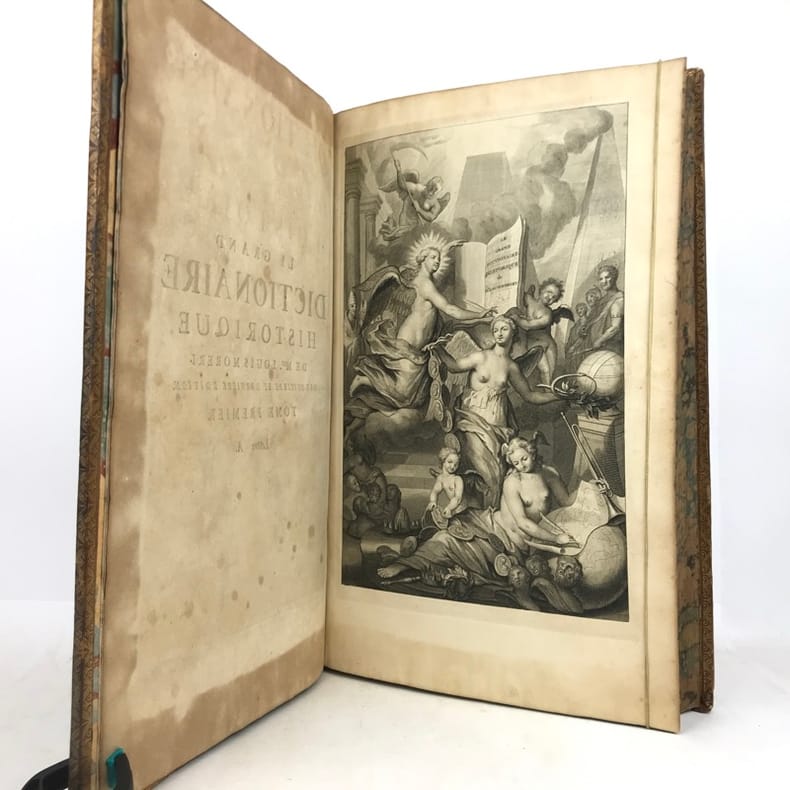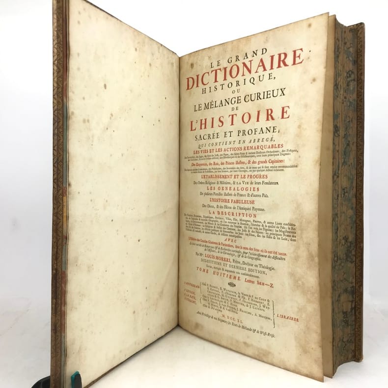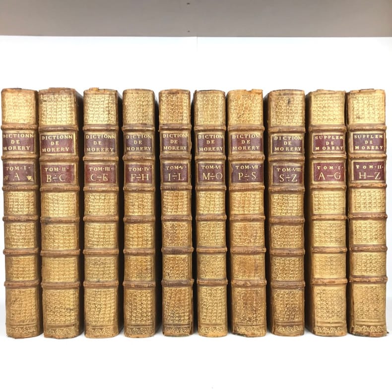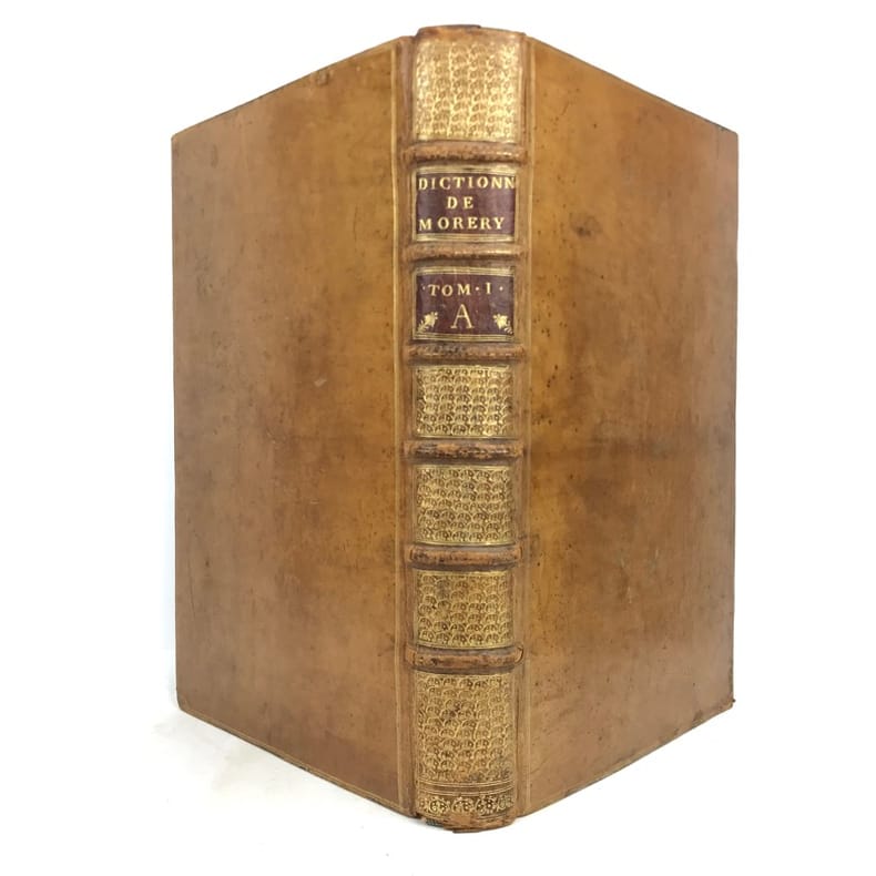 EDITION EN 10 Volumes....la Plus Complète.............La fortune littéraire de ce dictionnaire est attestée par par le vif succès qu'il reçut durant deux siècles : Victor Hugo l'utilisa fréquemment pour les indications historiques qui figurent dans ses romans. Le dictionnaire de Moréri demeure encore utile aujourd'hui, comme le premier répertoire de notices biographiques, spécialement en ce qui concerne l'histoire et la pensée du XVIe siècle européen. Bel exemplaire en veau blond du temps. Petits défauts de reliure sans gravité... La séquence des 10 volumes est absolument uniforme....Bel état de l'ensemble et trés bon état intérieur (very good condition in spite of the small defects indicated).