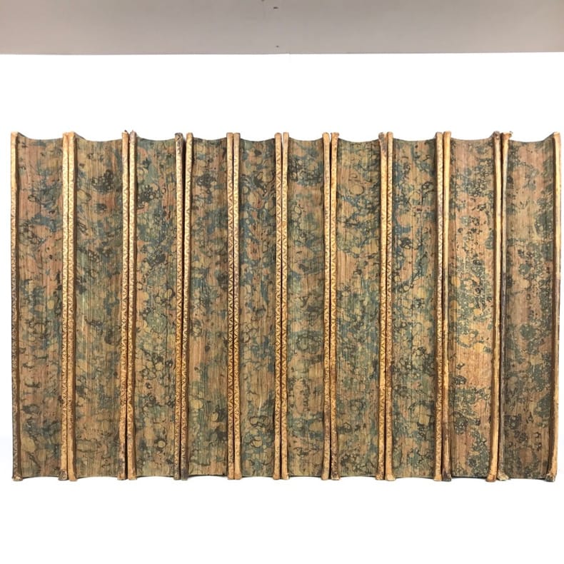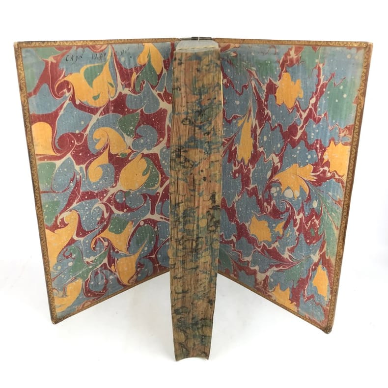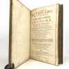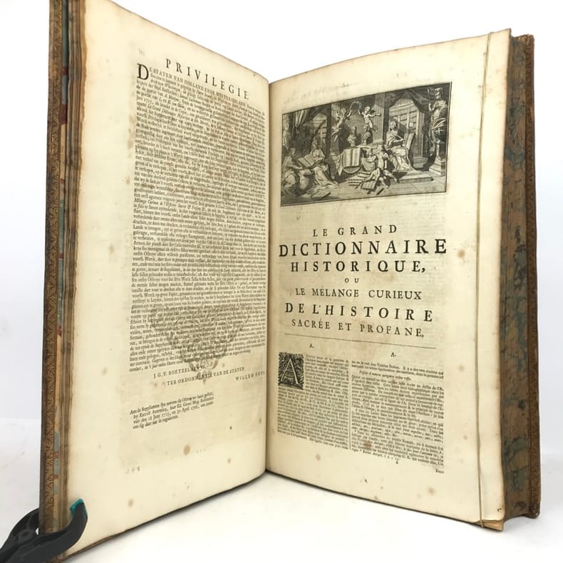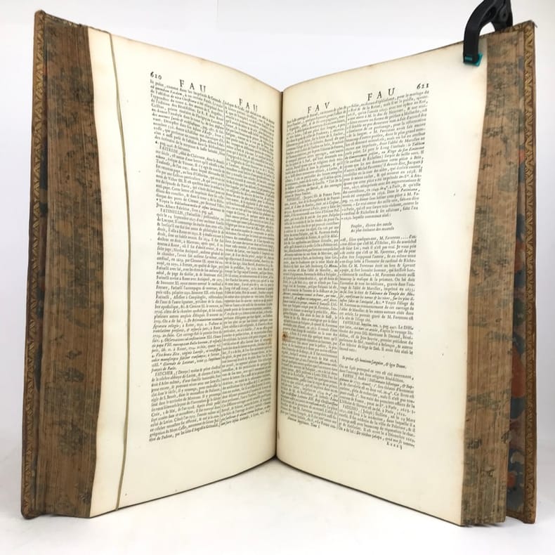 10 volumes in-folio (40 cm x 24,5 cm), veau glacé blond (reliure postérieure), dos à nerfs orné de motifs dorés à la grotesque, pièce de titre et de tomaison rouge, triple filet doré en encadrement des plats, tranches marbrées, roulette dorée intérieure. xxi-808 ; [2]-536-358 ; [2]-359 à 760-179-1 bl.-216 ; [2]-223-1 bl.-271-1 bl.-242 ; [2]-225-1 bl.-51-1 bl.-320-110 ; [2]-514-131-1 bl.-102 ; [2]-408-27-[1]-240-214 ; [2]-215 à 430-271-[1]-205-[1]-130 ; [4]-901-[1]-59-[1]-1749 ; [2]-135-2 à 823-[1] pages. Manque les feuillets Hh hhh2 et Hh hhh3. Frottements à la reliure, coiffes accidentées, mors fendus sur les longueurs, feuillets brunis et rousseurs éparses. État très correct tout de même. Avant dernière édition de ce célèbre dictionnaire, illustrée d’un titre-gravé. Premier dictionnaire de noms propres par le célèbre encyclopédiste et généalogiste français Louis Moreri (1643-1680). Édité pour la première fois à Lyon en 1674, ce dictionnaire contient principalement des articles historiques, géographiques et biographiques. Particulièrement riche, il connaîtra 20 éditions entre 1674 et 1759, dont la dernière parue à Paris. Bel exemplaire.