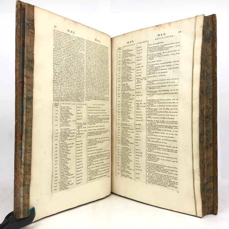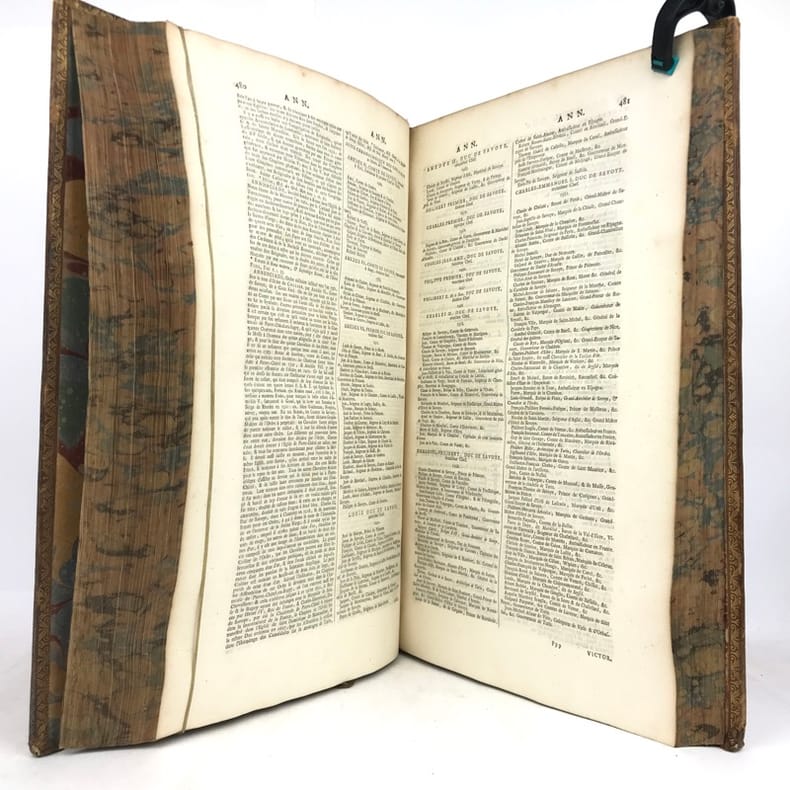Folio Amsterdam Brunel, Leyden, La Haye, Utrecht 1740. 8 volumes In-folio, plein veau de l'époque, dos à 6 nerfs très orné. Qui contient en abrégé les vies et les actions remarquables des Patriarches, desJjuges, des Rois des Juifs, des Papes, des Saints Pères et anciens Docteurs orthodoxes, des Evêques, des Cardinaux, et autres Prélats célèbres, des Hérésiarques et des Schismatiques avec leurs principaux dogmes. Des Empereurs, des Rois, desPprinces illustres et des grands Capitaines. Des auteurs anciens et modernes, des philosophes, des inventeurs des arts et de ceux qui se sont rendus recommandables en toutes sortes de professions, par leur science, par leurs ouvrages ou par quelque action éclatante. L'établissement et le progrès des ordres religieux et militaire et la vie de leurs fondateurs, les généalogies de plusieurs familles illustres de France et d'autres pais. L'histoire fabuleuse des Dieux et des Héros de l'Antiquité Payenne. La descriptions des Empires, Royaumes, Républiques, Provinces, Villes, Isles, Montagnes, Fleuves et autres lieux considérables de l'ancienne et nouvelle géographie, ou l'on remarque la situation, l'étendue et la qualité du pais, la religion, le gouvernement, les moeur et les coutûmes des peuples. Ou l'on voit les dignités : Les magistratures ou titres d'honneur. Les religions et sectes des Chrétiens, des Juifs et des payens. Les principaux noms des arts et des sciences. Les actions pbliques et solemnelles. Les jeux. Les fêtes et les Edits et les Lois, dont l'histoire est curieuse et autres choses et actions remarquables avec l'histoire des Conciles Généraux et Particuliers, sous le nom des lieux ou ils ont été tenus. Le tout enrichi de remarques et de recherches curieuses, pour l'eclaircissement des difficultés de l'Histoire, de la Chronologie et de la Géographie. Quelques petits défauts aux coiffes et en queues, des coins un peu émoussés. Quelques rousseurs et trace d'humidité sans gravité. Un grand classique toujours recherché pour les nombreux renseignements historiques et généalogiques qu'il contient, véritable mine pour toute recherche historique.Bon exemplaire.