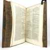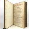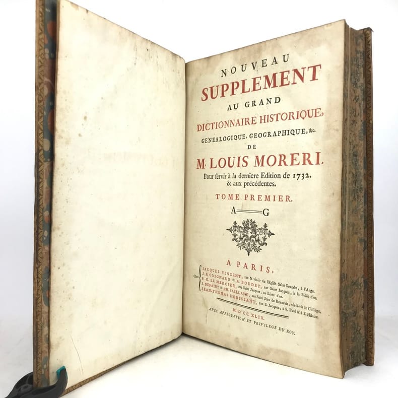 1732 10 volumes, reliure plein veau havane raciné in-folio (binding full calfskin in folio) (405 x 260 mm), (reliures de l'époque), dos à nerfs (spine with raised bands) - décoration or (gilt decoration) à filets or (gilt lines) et à froid (blind-stamping decoration) - entre-nerfs à compartiments à fleurons (compartment with floweret) - pièce de titre sur fond havane (label of title) avec double filets or (label of title with double gilt line) et pièce de tomaison sur fond marron foncé (label of title and label of volume numbering) avec double filets or (l label of volume numbering with double gilt line) - dentelle en pied (gilt lace at the the foot of spine), au TOME I : 5 trés légers trous de vers au niveau de la pièce de tomaison, coiffe supérieure manquante (is missing head of the spine), coiffe inférieure légèrement défraîchie ( tail of the spine lightly faded), au TOME II : coiffes supérieure et inférieure manquantes (are missing the head and tail of the spine), au TOME III : coiffe supérieure manquante (is missing head of the spine), coiffe inférieure légèrement défraîchie ( tail of the spine lightly faded), au TOME IV : coiffe supérieure légèrement défraîchie (head of the spine lightly faded), au TOME V : coiffes supérieure et inférieure manquantes (are missing the head and tail of the spine), au TOME VI : coiffe supérieure manquante (are missing the head of the spine), Charnière du 1er plat Fendue (cracked joint) en haut à gauche sur 4 cm et en bas à droite sur 5cm, au SUPPLEMENT I : coiffes supérieure et inférieure manquantes (are missing the head and tail of the spine), au SUPPLEMENT II : trés léger manque de cuir sur le dos entre deux nerfs sur 3 cm2 (lack of leather on the spine), coiffe supérieure légèrement défraîchie (head of the spine lightly faded), au NOUVEAU SUPPLEMENT I : coiffes supérieure et inférieure manquantes (are missing the head and tail of the spine), charnière fendue (cracked joint) sur 6cm en partant du bas du 1er plat, au NOUVEAU SUPPLEMENT II : coiffes supérieure et inférieure manquantes (are missing the head and tail of the spine), légers trous de vers sur le cuir du dos (semis n'atteignant à aucun moment le papier), trés léger manque de cuir et charnière fendue (cracked joint) sur 6 cm en haut et en bas du 1er plat, plats décorés d'un double filet à froid (cover blind-stamping), coins légèrement émoussés (corners blunt), roulettes sur les coupes (fillets on the cuts), - manque de dorure (blurred gilding), marque-page en tissu vert (bookmark in green tissue), toutes tranches lisses (all smooth edges), rouges (all red edges), pages de garde peignées (painting endpapers), avec un ex-libris (painting endpapers with book-plate) au Armes de Monsieur DE LONG Conseiller au Parlement de Toulouse, Orné d'un titre-frontispice en noir par Desmarets gravé par Duflos et un portrait hors texte de Moréri gravé par Duflos d'après De Troye, (12 + 986 + 1feuillet de privilège) + (1059) + (1008) + (1060) + (419 + 631) + (652 + 252) + (504 + 295) + (550) + (901 + 59 pages de corrections) + (823 + 1feuillet de privilège) PAGES, 1732 Paris Jean-Baptiste Coignard Editeur pour LE GRAND DICTIONNAIRE HISTORIQUE + 1735 Paris chez Vincent, Coignard, Lemercier , Herissant Editeurs pour le SUPPLEMENT AU GRAND DICTIONNAIRE HISTORIQUE + 1749 Paris chez Vincent, Coignard et Boudet, Lemercier, Desaint et Saillant, Herissant Editeurs pour le NOUVEAU SUPPLEMENT AU GRAND DICTIONNAIRE HISTORIQUE,