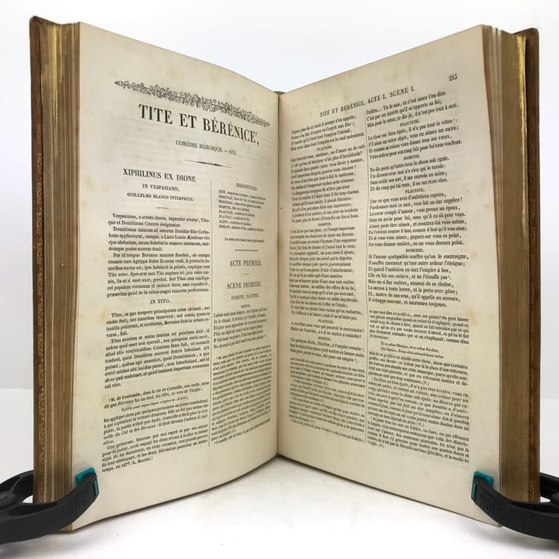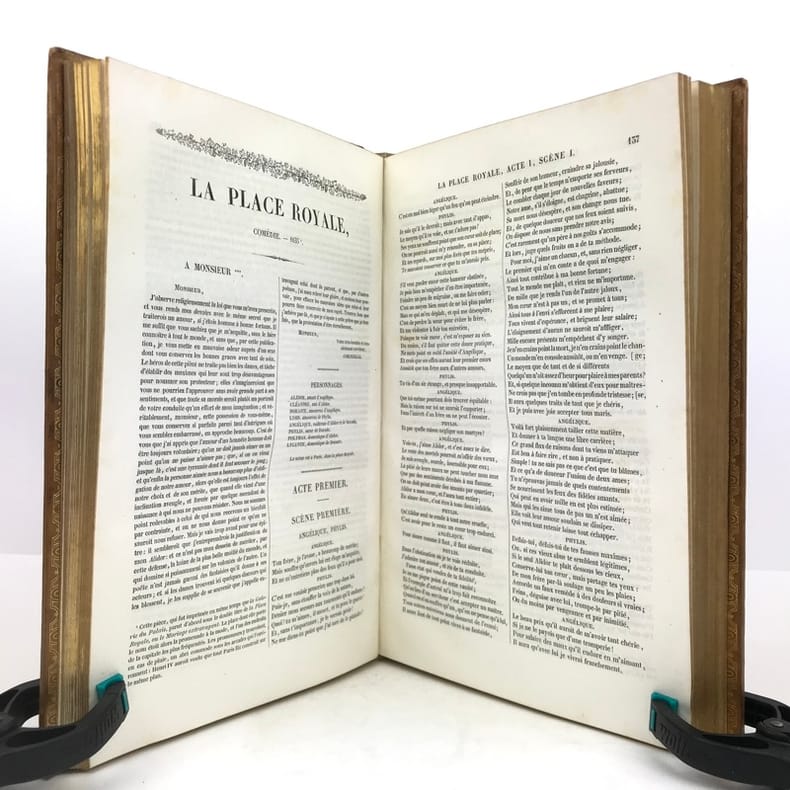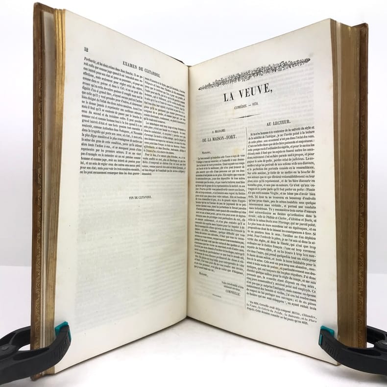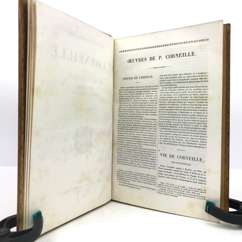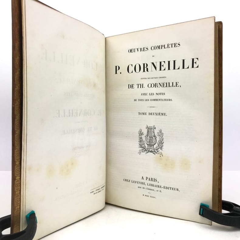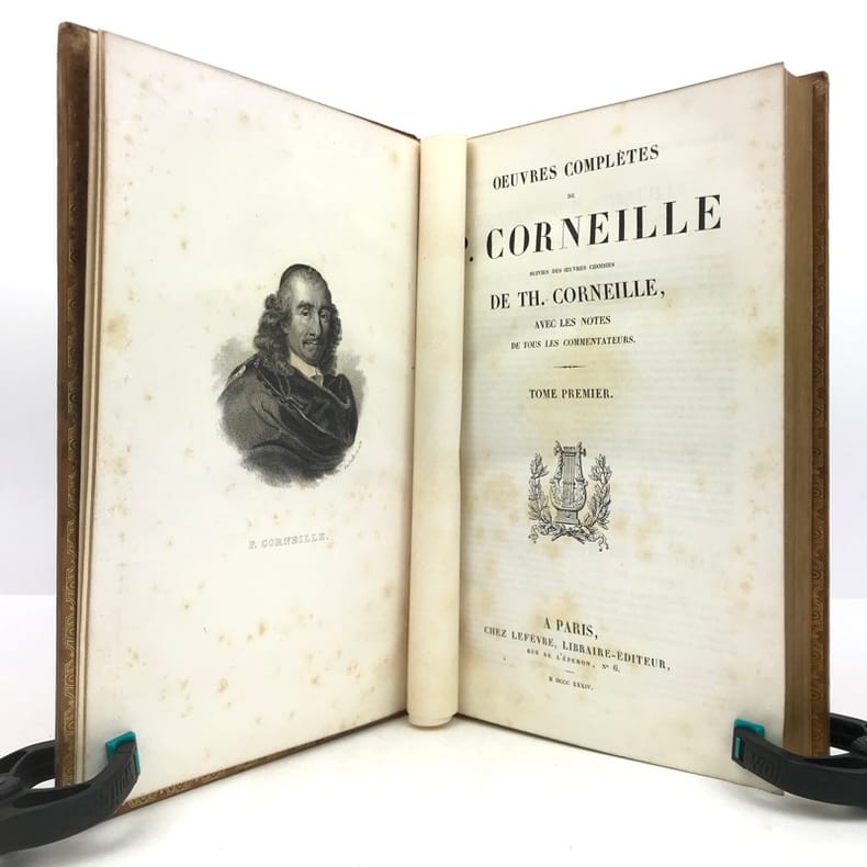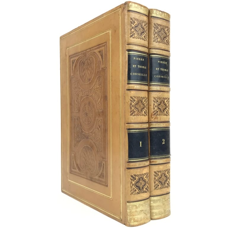 2 volumes grand in-8 (24,5 x 16,5 cm), veau blond (reliure romantique de l’époque), dos à nerfs orné, pièces de titre et de tomaison en maroquin noir, grande plaque à froid sur les plats avec double filet doré, filet doré sur les coupes, roulette dorée sur les chasses, tranches dorées, texte sur double colonne, [4]-ix-[1]-694 ; [4]-760 pages (complet). Dos légèrement insolés, coins frottés, rousseurs. État très correct tout de même.BELLE RELIURE ROMANTIQUE.Nouvelle édition illustrée d'un portrait de Pierre en frontispice.Oeuvres complètes de Pierre Corneille (1606-1684), complétées de quelques pièces de son jeune frère Thomas (1625-1709), tous deux célèbres pour leurs tragédies mythologiques et historiques.Plaisant exemplaire.