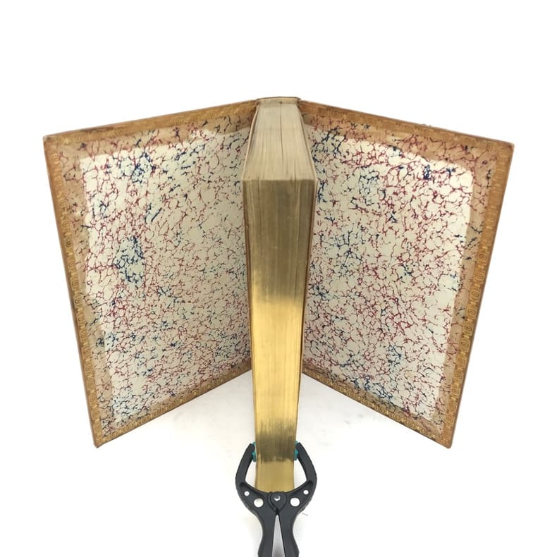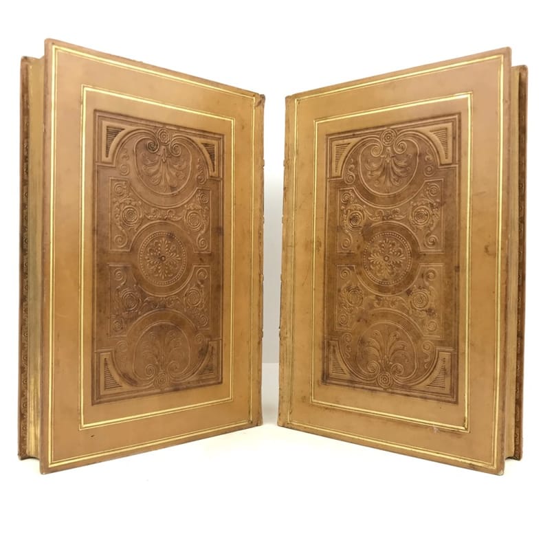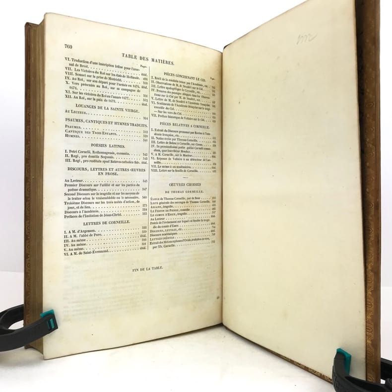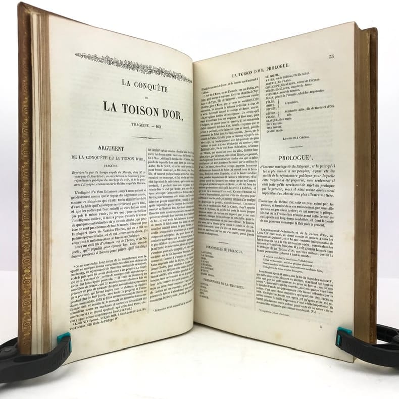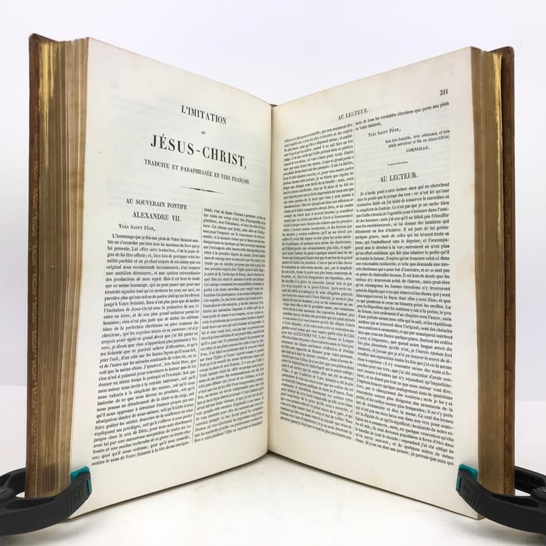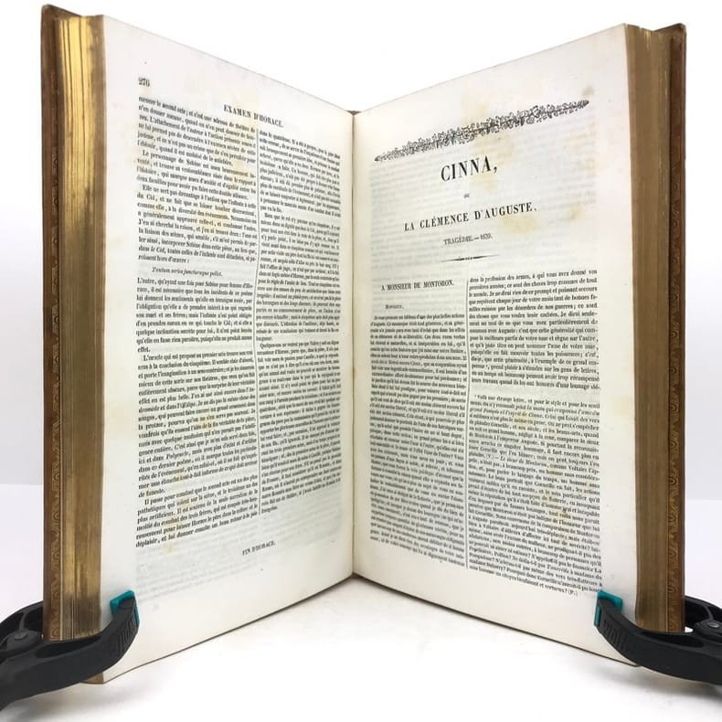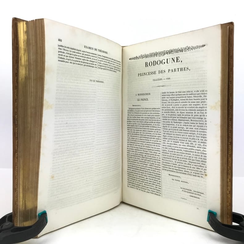 2 volumes grand in-8 (24,5 x 16,5 cm), veau blond (reliure romantique de l’époque), dos à nerfs orné, pièces de titre et de tomaison en maroquin noir, grande plaque à froid sur les plats avec double filet doré, filet doré sur les coupes, roulette dorée sur les chasses, tranches dorées, texte sur double colonne, [4]-ix-[1]-694 ; [4]-760 pages (complet). Dos légèrement insolés, coins frottés, rousseurs. État très correct tout de même.BELLE RELIURE ROMANTIQUE.Nouvelle édition illustrée d'un portrait de Pierre en frontispice.Oeuvres complètes de Pierre Corneille (1606-1684), complétées de quelques pièces de son jeune frère Thomas (1625-1709), tous deux célèbres pour leurs tragédies mythologiques et historiques.Plaisant exemplaire.