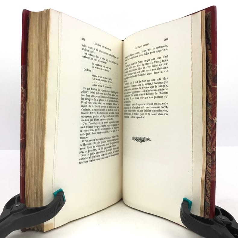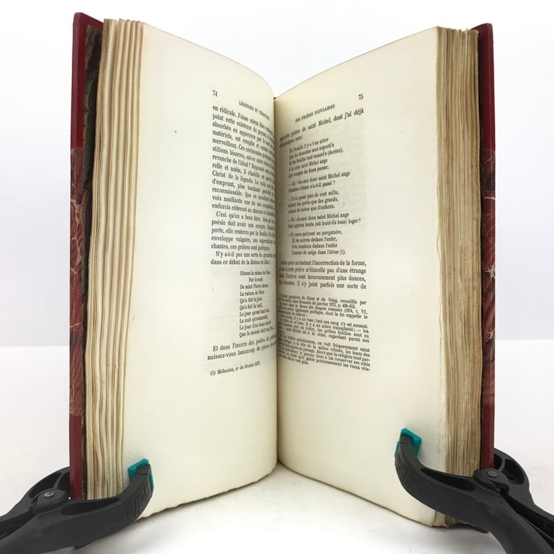 Edition originale sur vélin (Jean Vicaire, 319).Exemplaire non coupé, dos recollé avec quelques tout petits manques en tête et en pied.Très intéressante étude sur la poésie populaire en Bresse et en Bugey.La poésie des paysans (l’amour et le mariage à la campagne) ; des prières populaires ; vieux noëls ; frère Jean Gallet ; en Bugey (Le Capucin, les Fées de jailloux, Trois Vieilles) et en fin d’ouvrage, La Chanson Russe.
