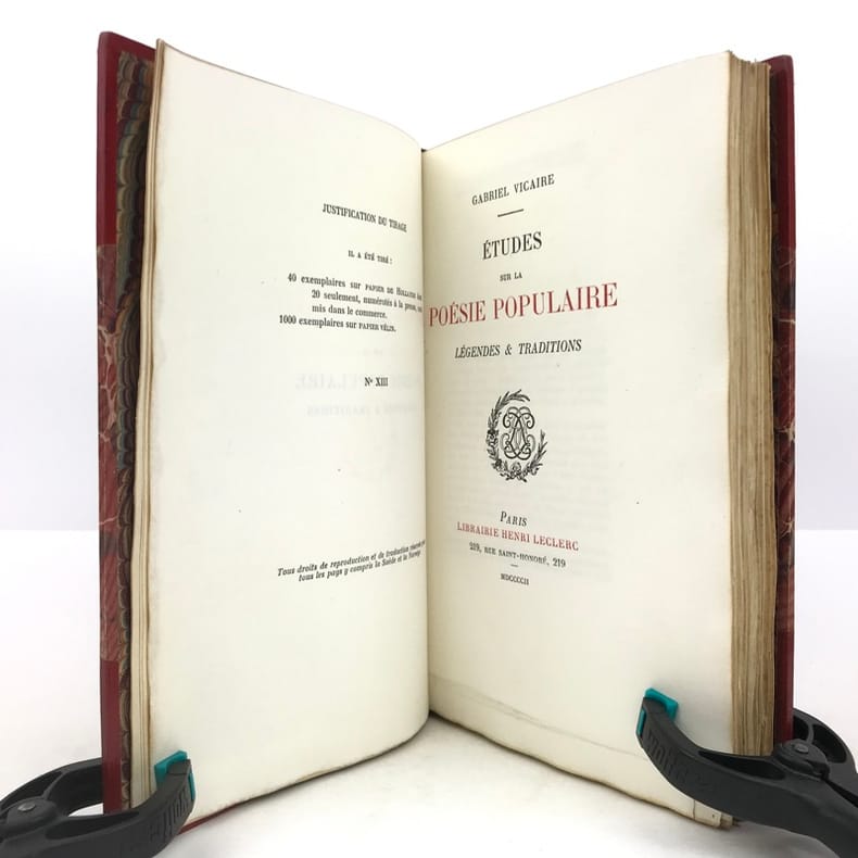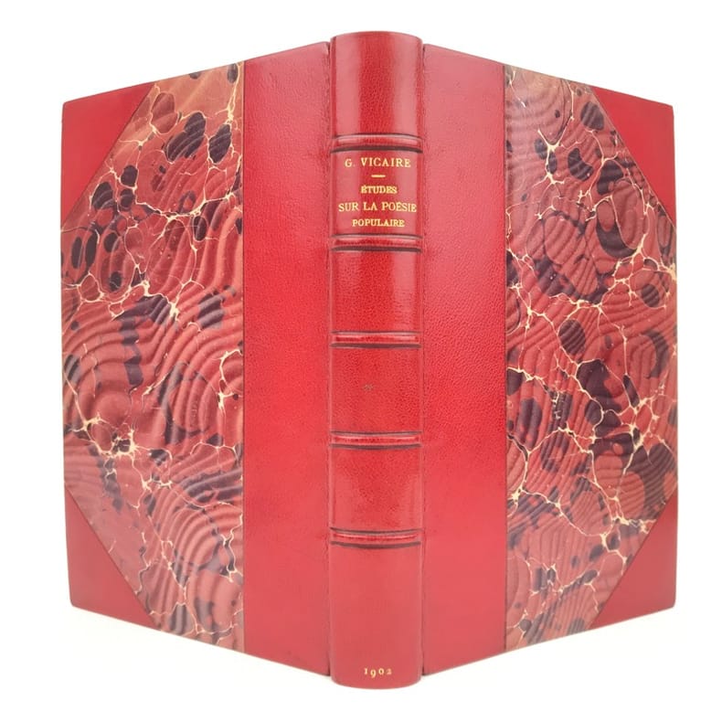 Édition originale de cette réunion d'articles de Gabriel Vicaire sur la poésie folklorique. Originaire de la région du Bugey, l'auteur n'oublie pas d'y consacrer une partie de ses études, ainsi qu'aux poésies paysannes, aux noëls, aux chansons russes, etc. Beau portrait héliogravé de l'auteur en frontispice. Un des 40 exemplaires de tête sur Hollande, et parmi eux un des 20 hors commerce, le n°X. Ex-libris héraldique d'un membre de la famille Pelletier de Chambure. Bel exemplaire en reliure mosaïquée.