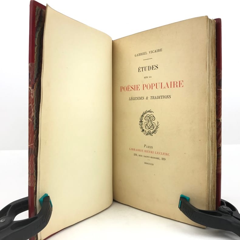 1 volume in-8 (21 cm x 13 cm), demi-chagrin rouge à coins (reliure signée Champs Stroobants), dos à nerfs, tête dorée, couverture et dos conservés, marges non ébarbées. [4]-ii-263-1 bl.-[4] pages (complet). Bon état. ÉDITION ORIGINALE. Tirage à 1040 exemplaires, celui-ci 1/40 sur papier de Hollande, ici 1/20 non mis dans le commerce, (n°XIII). Poète français, Gabriel Vicaire se met assez tardivement à écrire. En plein symbolisme, il s'oppose à toutes les recherches poétiques à la mode et fait figure d'homme heureux et sensuel auprès des décadents tourmentés par le sens de leur mission. Vicaire se rattache ainsi à une tradition de poésie facile, où se chante un accord profond avec la nature, avec la nourriture, le vin et l'amour. Originaire de la Bresse, ce sont les richesses de sa province qui l'inspirent dans Émaux bressans (1884), L'Heure enchantée (1890), Au bois joli (1893), Le Clos des fées (1897). Agréable exemplaire.