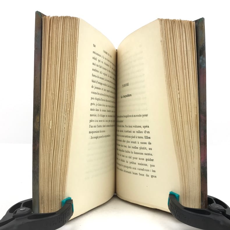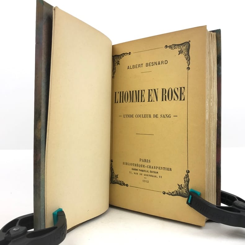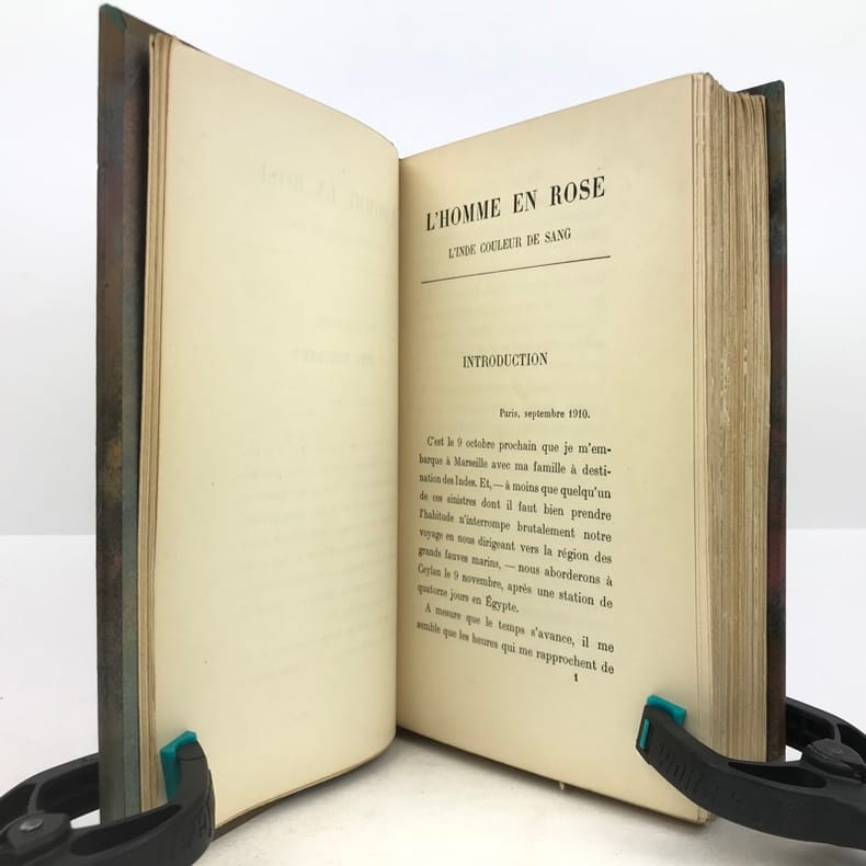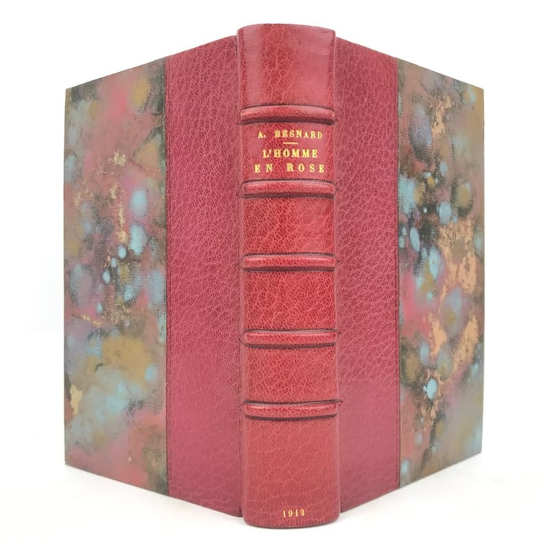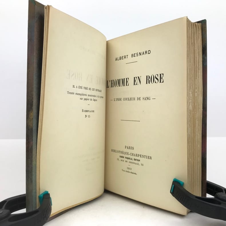 1 volume in-12 (18,5 cm x 11 cm), demi-maroquin rouge (reliure moderne signée A.D. Lavaux), dos à nerfs, tête dorée, joli papier intérieur, couverture et dos conservés. [6]-406-[1] pages (complet). Très bon état. ÉDITION ORIGINALE. Tirage à 30 exemplaires sur papier du japon, seuls grands papiers, ici n°15. Albert Besnard, (1849-1934), est un peintre et graveur français. Sa notoriété aujourd’hui ne reflète guère la gloire dont il a été couvert tout au long de sa carrière. Il a suivi un parcours exemplaire, en parfait représentant du cursus honorum des peintres du 19e siècle, qui l’a mené de l’École des beaux-arts à l’Académie française en passant par la Villa Médicis. L’artiste accomplit souvent de longs voyages au cours desquels sa palette se modifie. Après Londres, il y a l’Algérie en 1893-1894, d’où Besnard rapporte plusieurs œuvres qui le feront classer parmi les orientalistes. L’Inde enfin en 1912, voyage que décrit le peintre dans L’Homme en rose, l’Inde couleur de sang et dont les œuvres qu’il y réalise, exposées à la galerie Georges Petit, remportent un véritable triomphe. Agréable exemplaire.