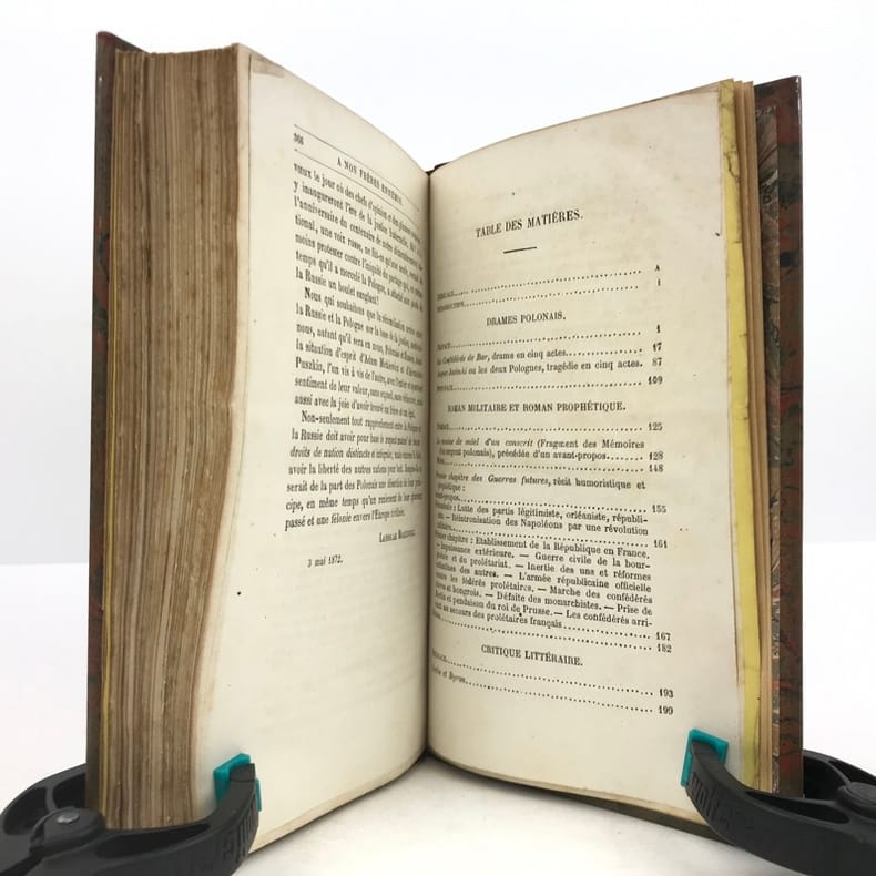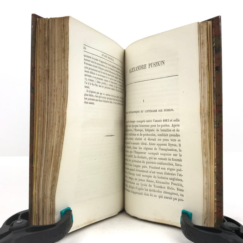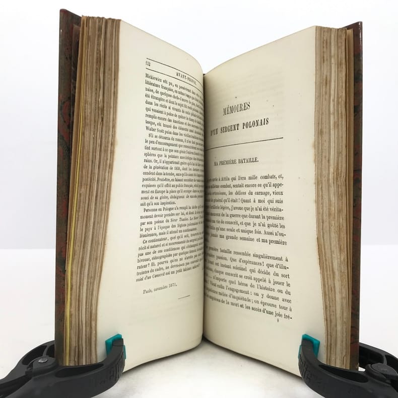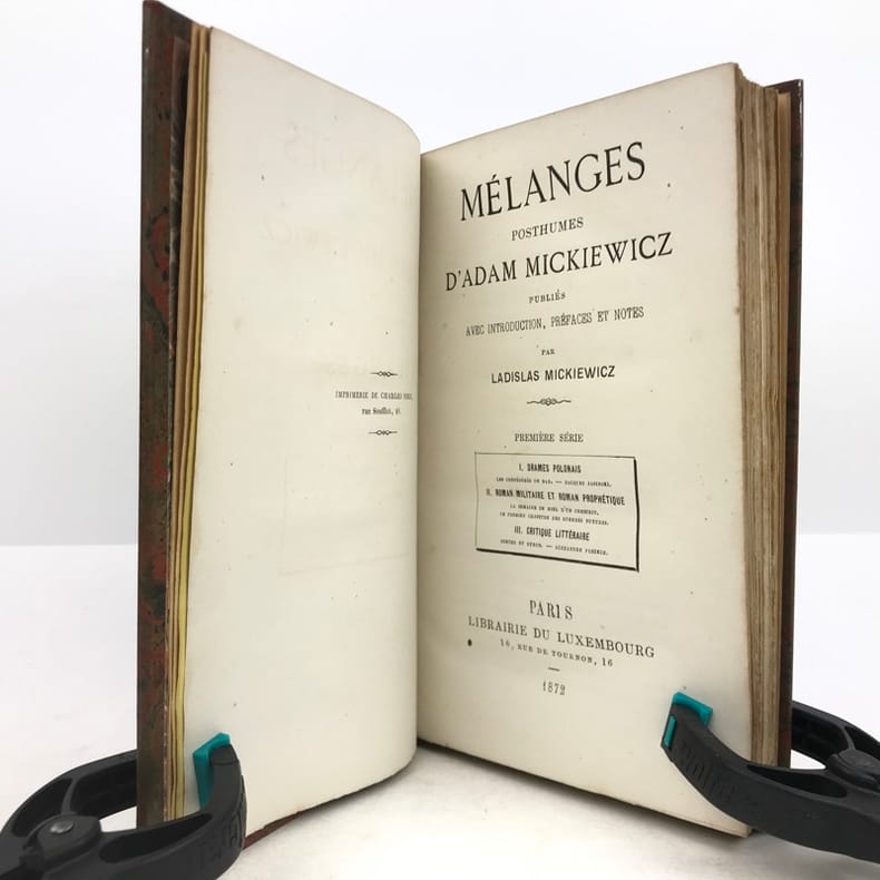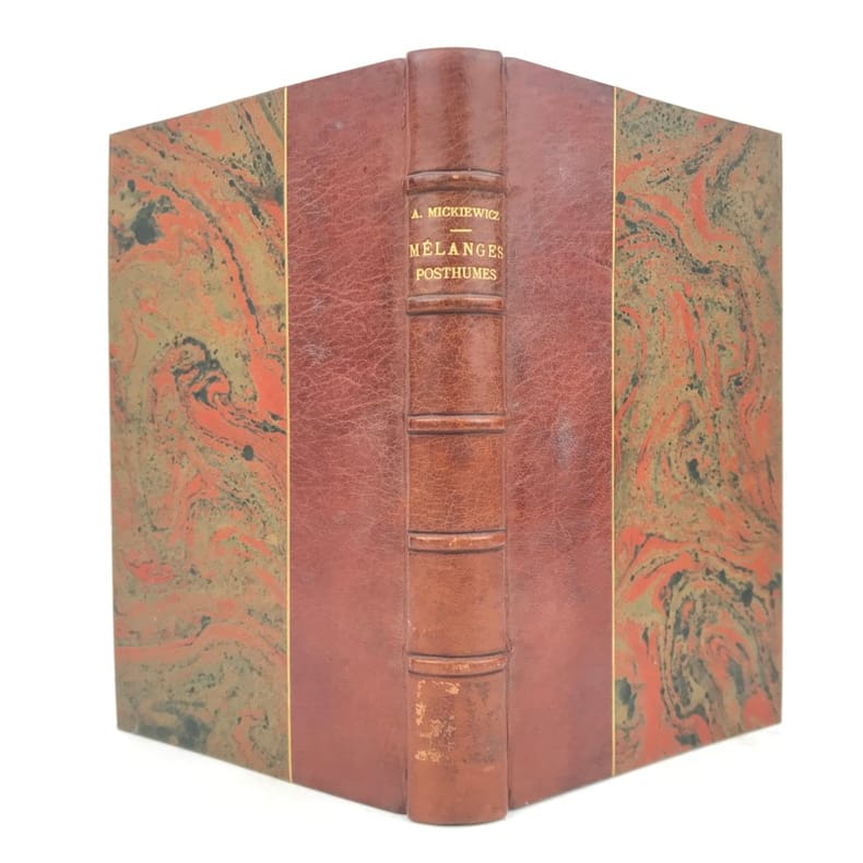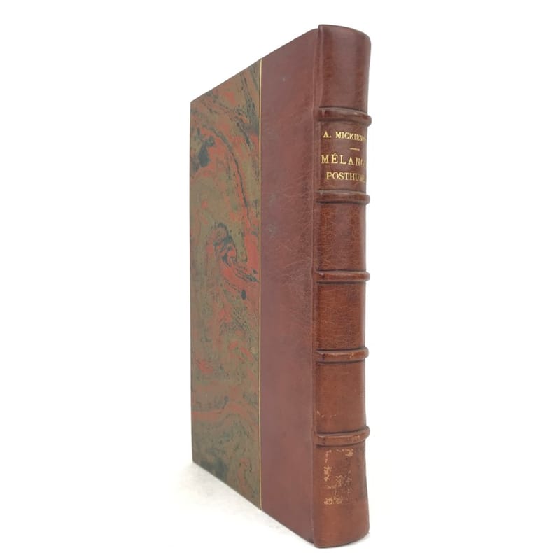 1 volume (sur 2) in-8 (18,5 cm x 11 cm), demi-maroquin bordeaux (reliure de l’époque), dos à nerfs, couverture conservée. [4]-L-xxiv-[2]-368 pages (complet en soi). Manque le tome II. Légers frottements à la reliure, rousseurs éparses. État très correct tout de même. Première édition en français des œuvres posthumes de Mickiewicz, par Ladislas Mickiewicz, fils d’Adam, dont il honora la mémoire en traduisant l’essentiel de l’œuvre en français. Adam Mickiewicz (1798-1855), est un poète, écrivain et militant polonais, considéré comme l'un des plus grands poètes romantiques. Mickiewicz est aux Polonais ce que Dante est aux Italiens et Gœthe aux Allemands : un poète inspiré qui a cristallisé l’identité culturelle de son peuple, grâce à qui la littérature a « remplacé » en quelque sorte la patrie disparue. Il est célébré dans son pays natal comme le père spirituel de la littérature polonaise moderne. Agréable exemplaire. Vendu 02/10/2025