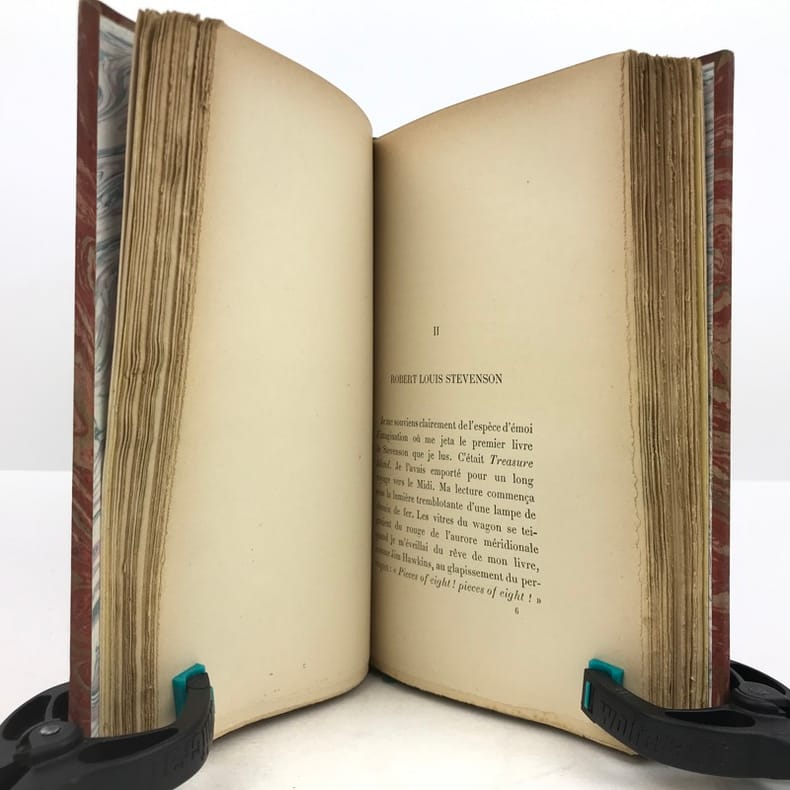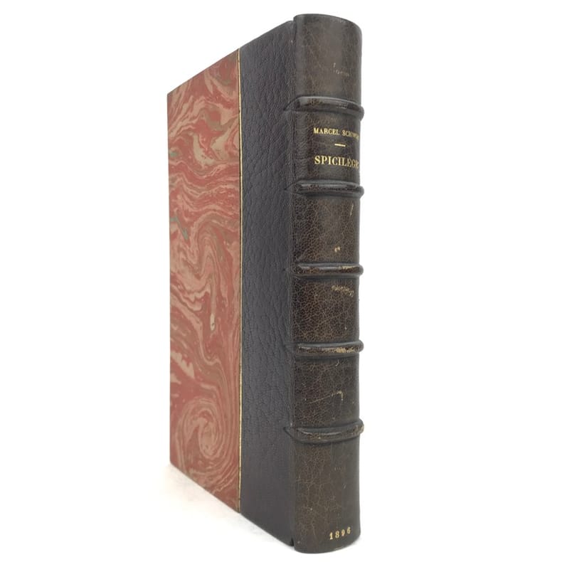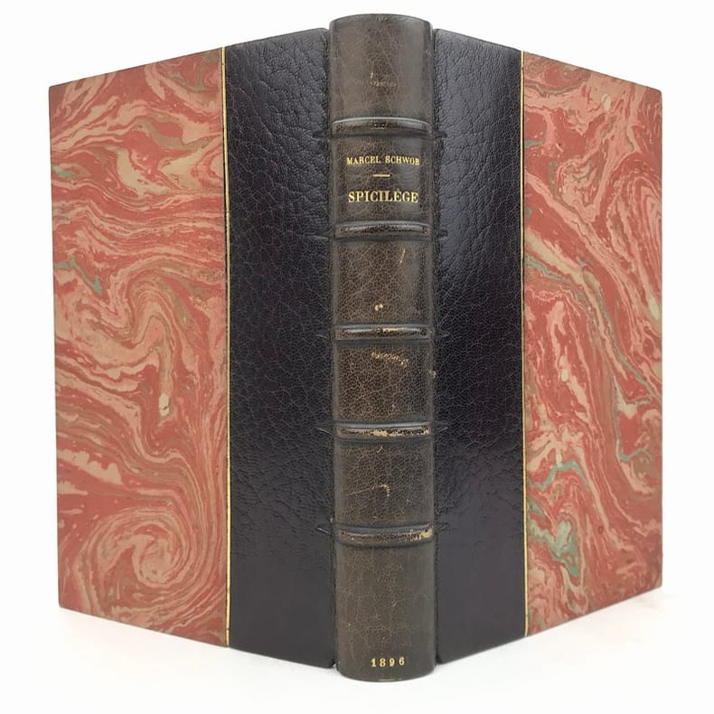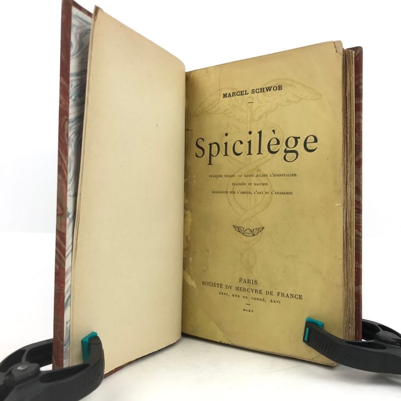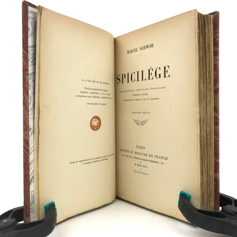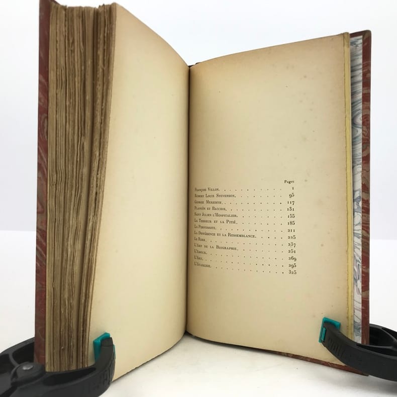 1 volume in-12 (18,5 cm x 11 cm), demi-maroquin brun (reliure postérieure, signée Ad. Lavaux), dos à nerfs, couverture conservée. [4]-341-1 bl.-[5]-1 bl. pages (complet). Frottements à la reliure, feuillets brunis. État très correct. Seconde édition. L'ouvrage réunit pour la première fois les chroniques de Marcel Schwob parues en revue ou dans la presse. On y relève la fameuse étude sur Villon, celles sur Stevenson (le dédicataire de Coeur double) et Meredith, ainsi que des essais sur le rire, l'amour, l'art de la biographie, la littérature universelle, l'esthétique, l'anarchie... Agréable exemplaire.