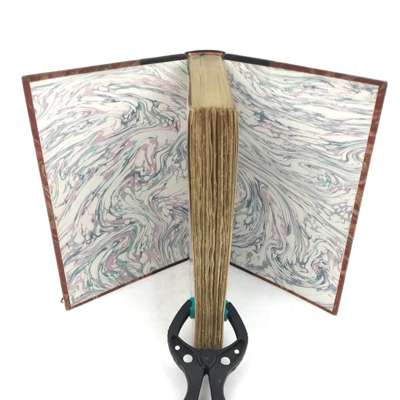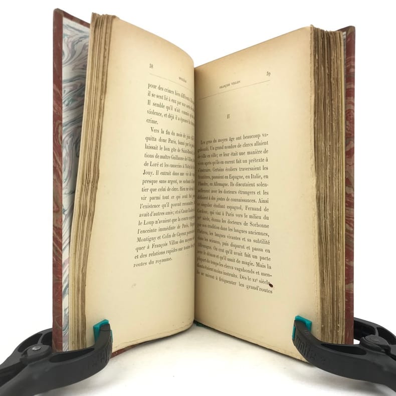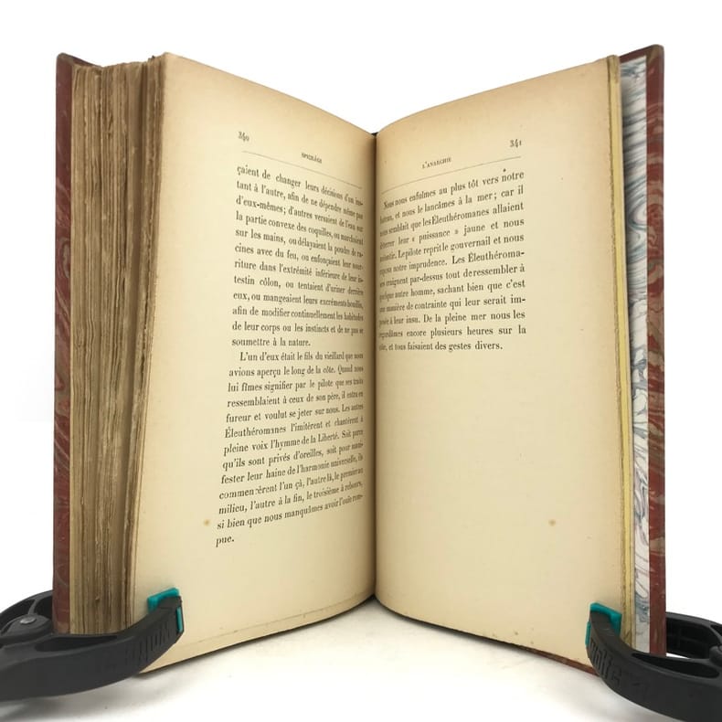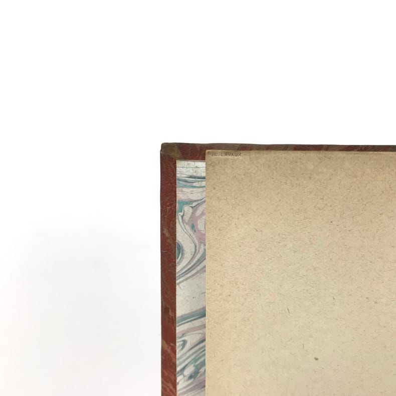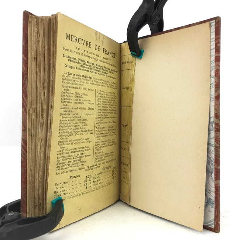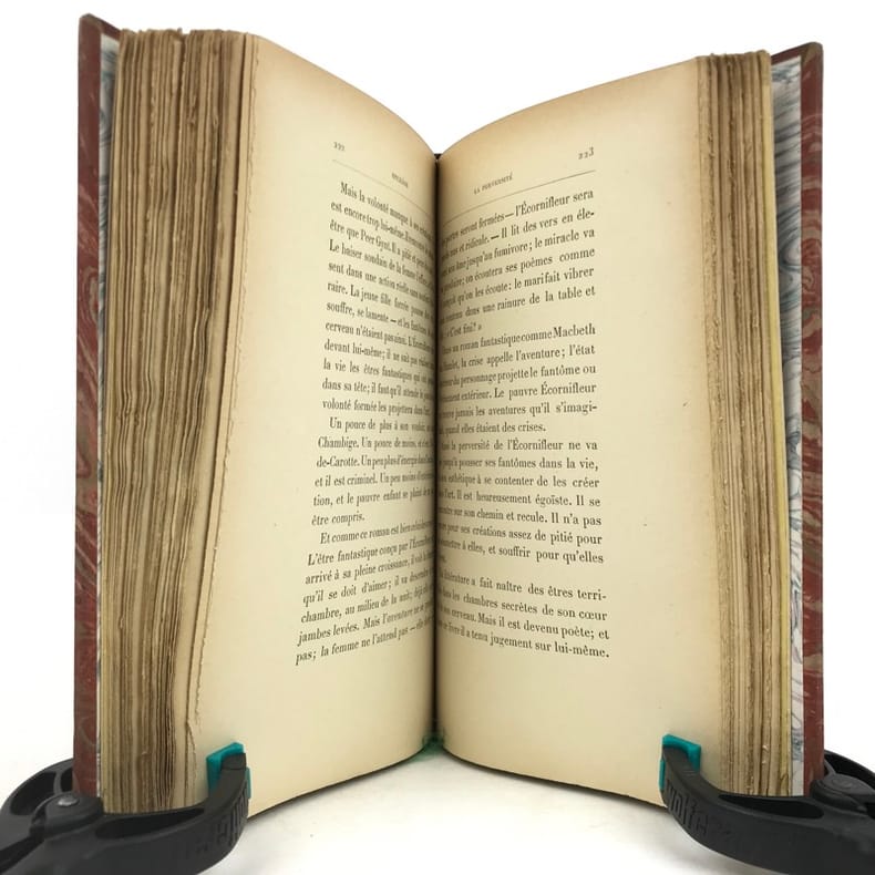 1 volume in-12 (18,5 cm x 11 cm), demi-maroquin brun (reliure postérieure, signée Ad. Lavaux), dos à nerfs, couverture conservée. [4]-341-1 bl.-[5]-1 bl. pages (complet). Frottements à la reliure, feuillets brunis. État très correct. Seconde édition. L'ouvrage réunit pour la première fois les chroniques de Marcel Schwob parues en revue ou dans la presse. On y relève la fameuse étude sur Villon, celles sur Stevenson (le dédicataire de Coeur double) et Meredith, ainsi que des essais sur le rire, l'amour, l'art de la biographie, la littérature universelle, l'esthétique, l'anarchie... Agréable exemplaire.