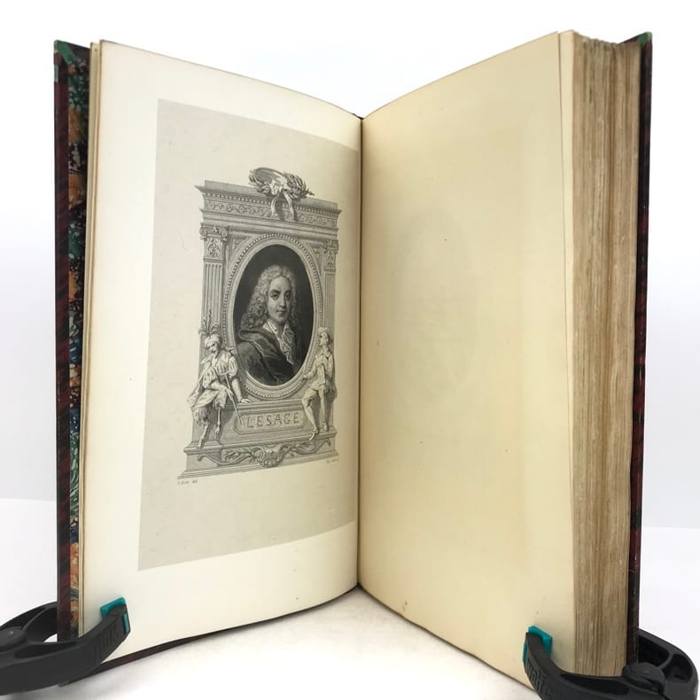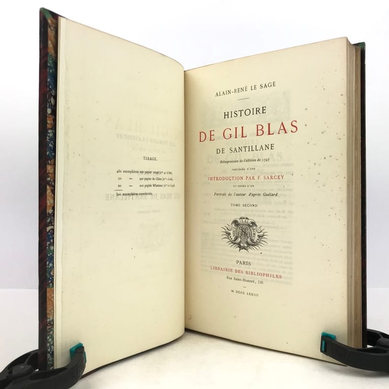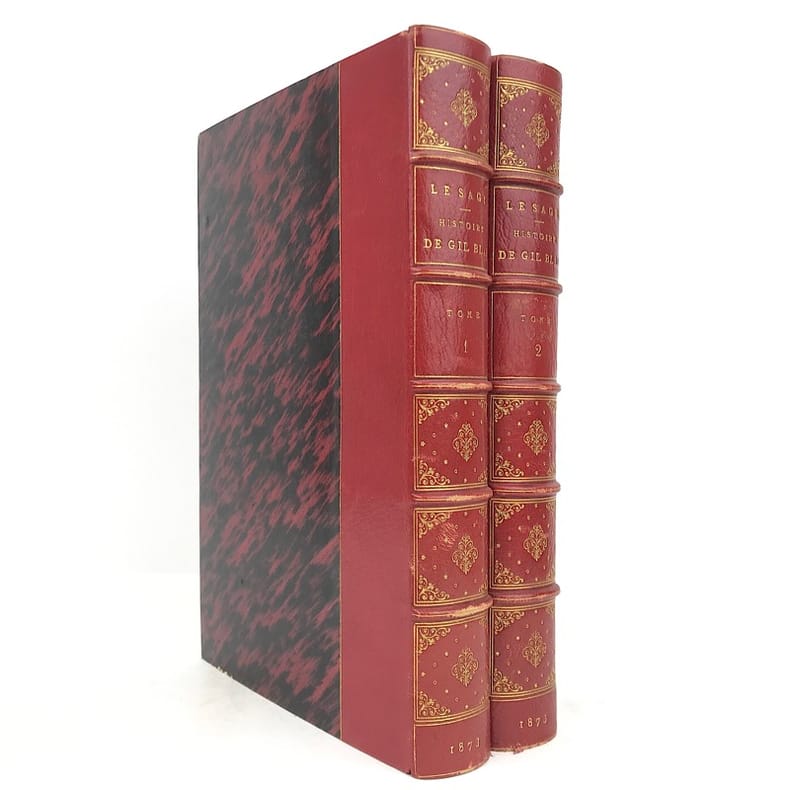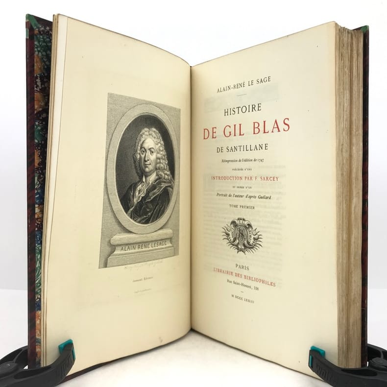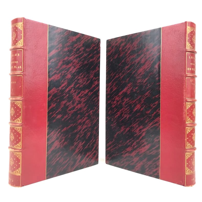 2 volumes in-8 (23,5 x 15 cm), demi maroquin rouge (reliure de l’époque signée Allô), dos à nerfs joliment orné, filet doré en bordures, tranche de tête dorée, titre en rouge et noir, [4]-c-iv à xx-403-[1] ; [4]-411-[1] pages (complet). Infimes frottements à un coin. Bon état. Nouvelle édition, réimpression de celle de 1747, illustrée du portrait de l’auteur en frontispice gravé par Nargeot d'après Guélard. Tirage à 500 exemplaires, celui-ci 1/460 sur papier vergé, (n°67). Exemplaire ENRICHI de 9 planches hors texte gravées par Colin, tirées sur Chine monté, dont un portrait de l'auteur. Alain-René Lesage (1668-1747) est un romancier, dramaturge et traducteur français. Il s’inspire ici du roman picaresque, à l’image de Don Quichotte, mais innove dans le sens où son héros, Gil Blas, va lui parvenir à élever sa condition sociale initiale. Bel exemplaire.