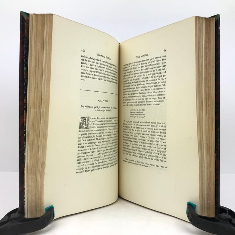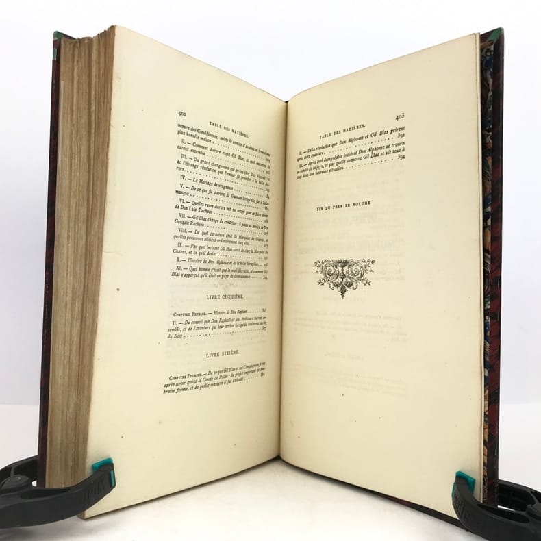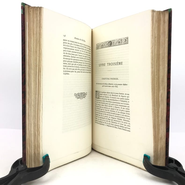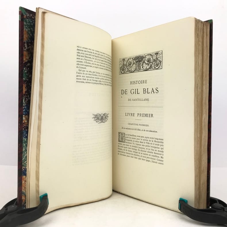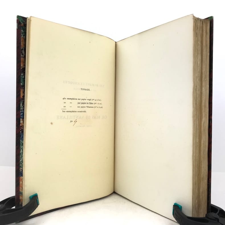 2 volumes in-8 (23,5 x 15 cm), demi maroquin rouge (reliure de l’époque signée Allô), dos à nerfs joliment orné, filet doré en bordures, tranche de tête dorée, titre en rouge et noir, [4]-c-iv à xx-403-[1] ; [4]-411-[1] pages (complet). Infimes frottements à un coin. Bon état. Nouvelle édition, réimpression de celle de 1747, illustrée du portrait de l’auteur en frontispice gravé par Nargeot d'après Guélard. Tirage à 500 exemplaires, celui-ci 1/460 sur papier vergé, (n°67). Exemplaire ENRICHI de 9 planches hors texte gravées par Colin, tirées sur Chine monté, dont un portrait de l'auteur. Alain-René Lesage (1668-1747) est un romancier, dramaturge et traducteur français. Il s’inspire ici du roman picaresque, à l’image de Don Quichotte, mais innove dans le sens où son héros, Gil Blas, va lui parvenir à élever sa condition sociale initiale. Bel exemplaire.