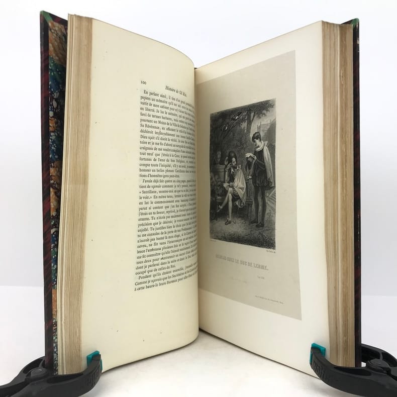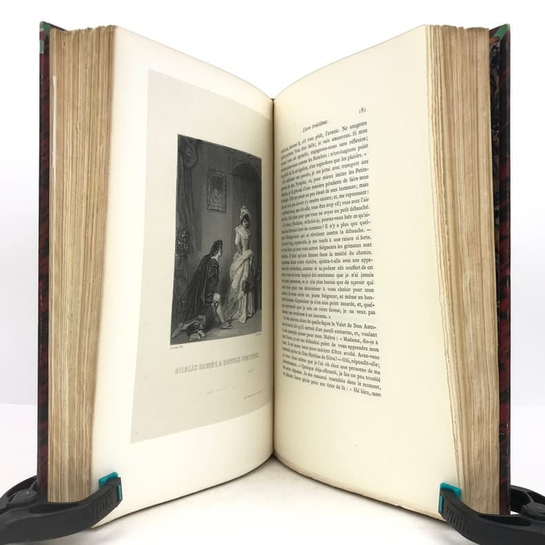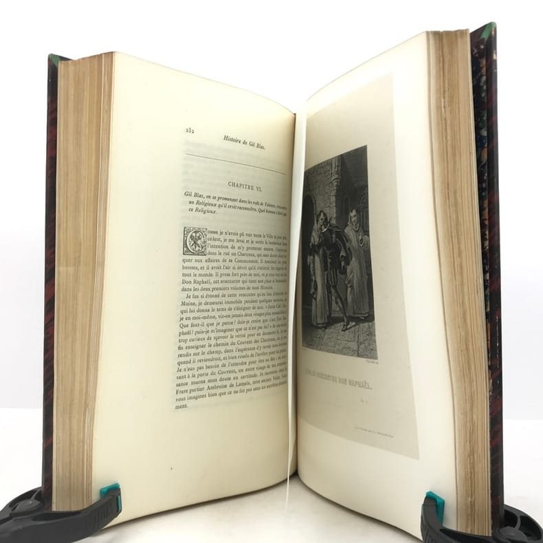 vignettes par Jean Gigoux L’Histoire de Gil Blas de Santillane est un roman d'inspiration picaresque de l'écrivain français Alain-René Lesage, paru entre 1715 et 1735. Lesage joue avec les références antiques et picaresques qu'il détourne. Et l'inspiration antique marque l’œuvre jusque dans le découpage en douze livres, qui rappelle les douze chants de l'Énéide. L'auteur narre, à la première personne, la vie de Gil Blas de Santillane. L'action se passe dans l'Espagne du Siècle d'or. Ce personnage né d’un écuyer et d’une femme de chambre quitte Oviedo à l’âge de dix-sept ans pour se rendre à l’Université de Salamanque, après avoir été éduqué par son oncle chanoine Gil Perez ( wiki) vol. in-4, 265x180, demi chagrin, dos à nerfs, légère décoloration, rousseurs, 827pp, bien complet, bon exemplaire Paris , Dubrochet 1838