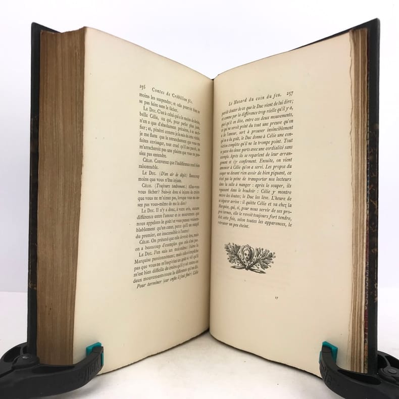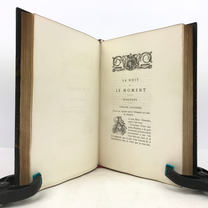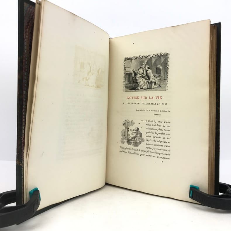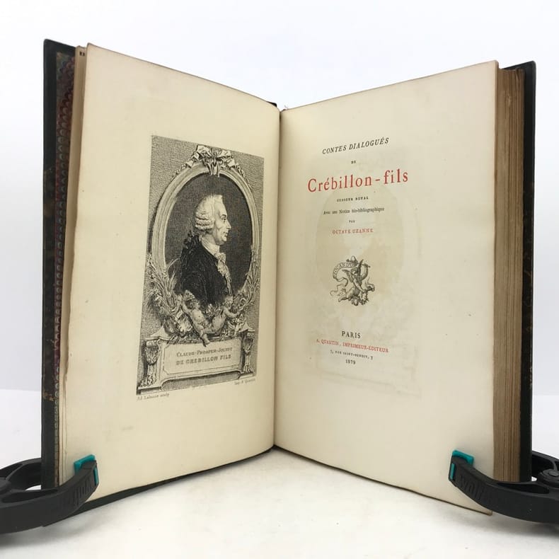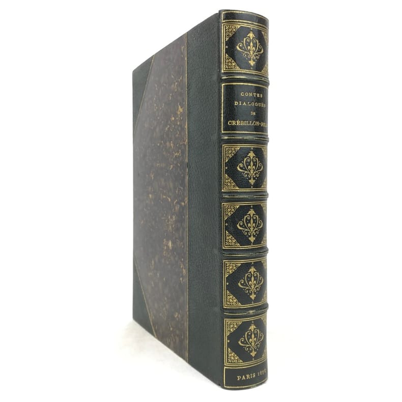 1 volume in-8 (20 x 14,5 cm), demi-maroquin vert à coins (reliure de l’époque signée Smeers), dos à nerfs orné, filet doré en bordure, tranche de tête dorée, titre en rouge et noir, [4]-lxxxii-283-[5] pages (complet). Légères taches aux pages 96 et 97. Bon état. Nouvelle édition des Contes de Crébillon, illustrée de son portrait en frontispice, d’une gravure hors-texte et d’une lettre autographe de l'auteur en fac-similé. Elle comporte, également, une notice bio-bibliographique d’Octave Uzanne (1851-1931). Claude-Prosper Jolyot de Crébillon (1707-1777), dit Crébillon fils, est un écrivain, chansonnier et goguettier français. Ces contes, jugés immoraux, ne rencontrent pas un grand succès lors de leur parution, mais seront redécouverts aux XIXe et XXe siècles. Plaisant exemplaire.