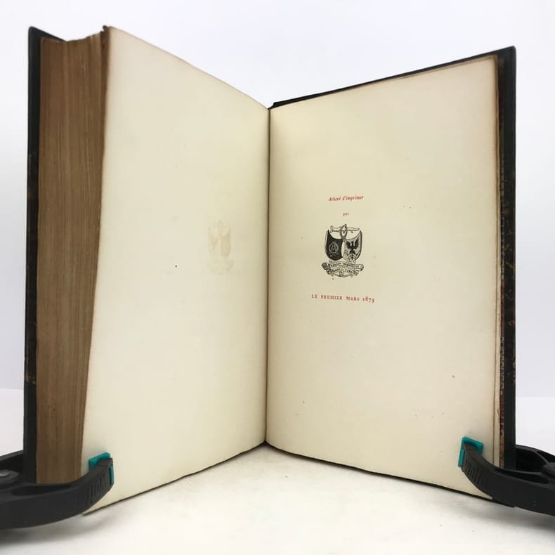 P., Quantin, 1879. In-8 rel. demi-basane blonde de l'époque à grands coins cernés de filets dorés, dos à 5 faux-nerfs, pièce de titre basane bordeaux, titre, filets et fleurons dorés, tête dorée, signet, LXXXII-283 pp., titre gravé, portrait-frontispice par A. Lalauze, 4 planches gravées sur cuivre par F. Milius, dont 1 fac-similé dépliant, bandeaux, lettrines et culs-de-lampe gravés. Tirage à petit nombre sur papier fort.