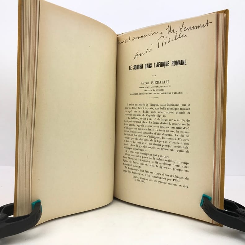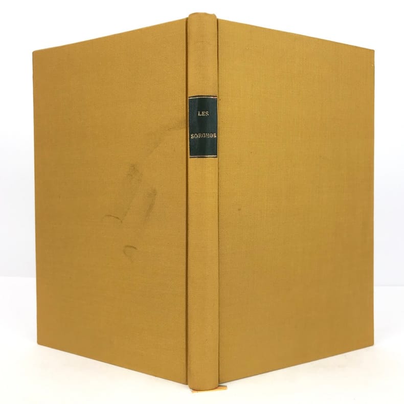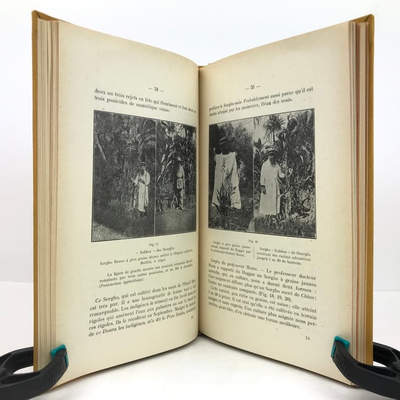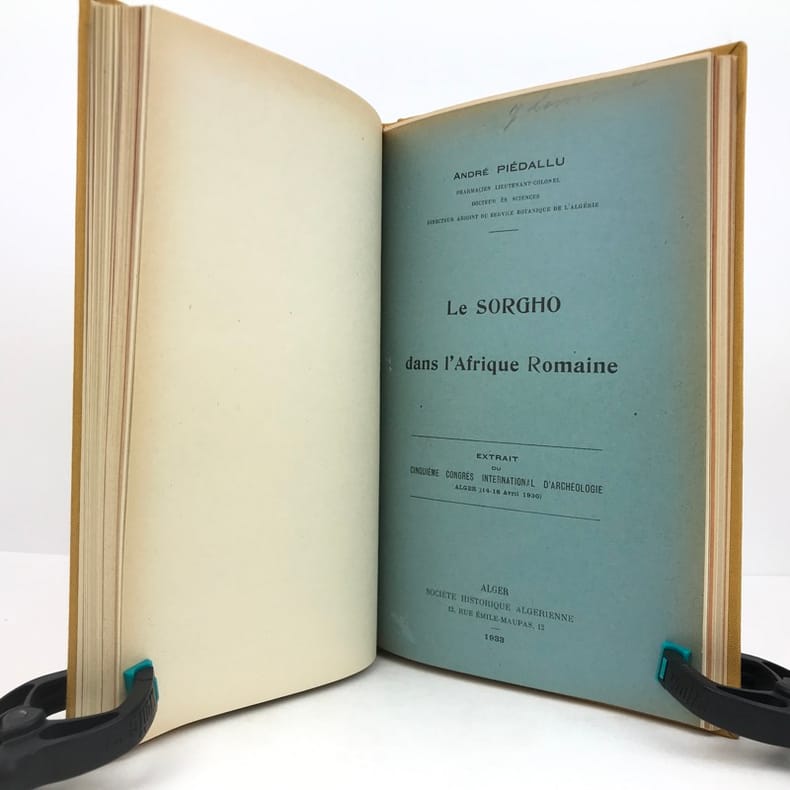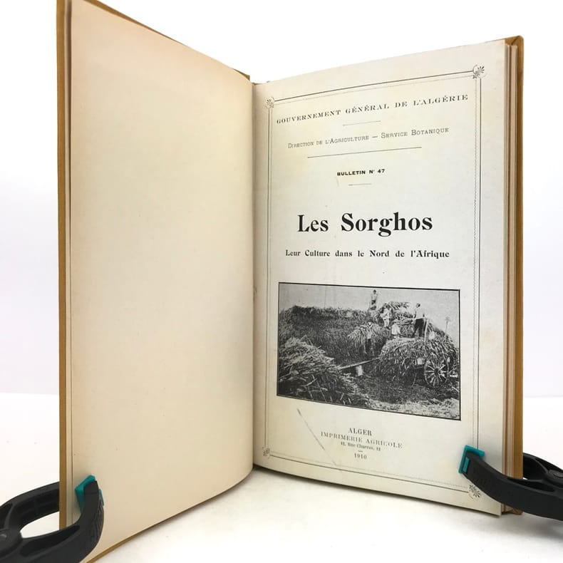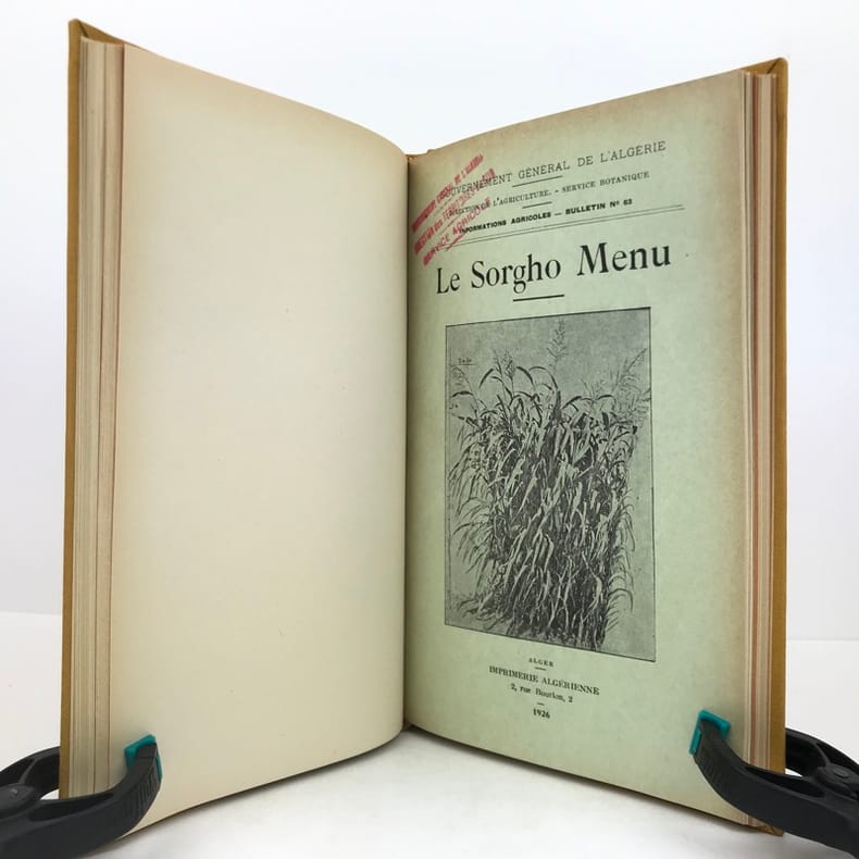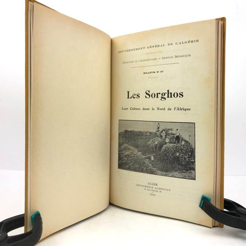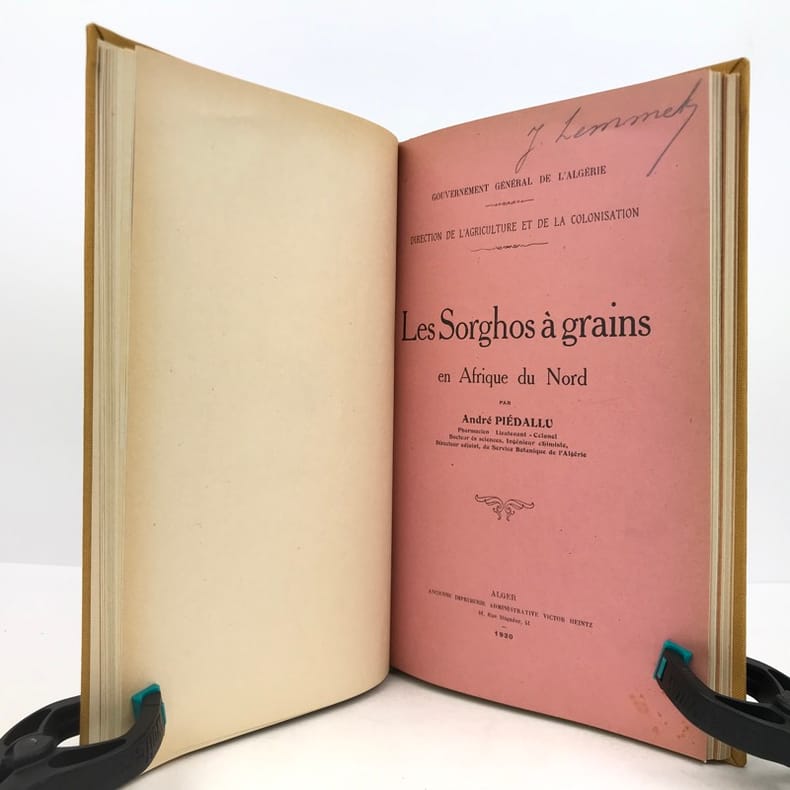 5 ouvrages in-8 (23,5 x 15,5 cm), bradel toile jaune (reliure moderne), pièce de titre noire, couvertures conservées, cachet à quelques feuillets, envoi autographe signé de André Pédallu sur le 1er feuillet du 4e texte. 36 ; 41-3bl. ; 8 ; 4 ; 45-[3] pages (textes complets). Second plat de la reliure légèrement sali. Bon état. Réunion de 5 études sur le sorgho, illustrées de reproductions photographiques hors texte et de figures in-texte, certaines à pleine page. Documents et renseignements agricoles réunis dans une collection publiée par le Gouvernement Général de l’Algérie (Direction de l’économie de l’agriculture). Louis Charles Trabut (1853-1929), botaniste, agronome et médecin français, fondateur de la Revue horticole de l'Algérie connu notamment pour ses travaux sur les agrumes, dont la première description du clémentinier (Citrus clementina). Piédallu, André (1876-1945). Pharmacien. - Botaniste. Docteur és sciences, ingénieur-chimiste, pharmacien-major de 1re classe à l'hôpital militaire d'Alger.. Lauréat de l'académie d'agriculture et de la société nationale d'acclimatation. Intéressant ensemble.