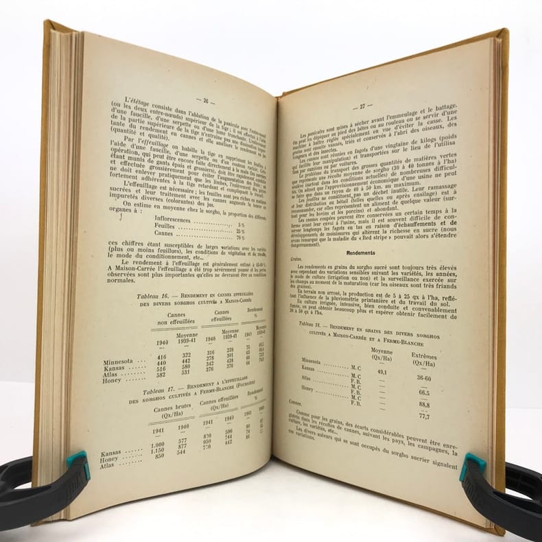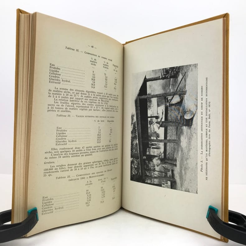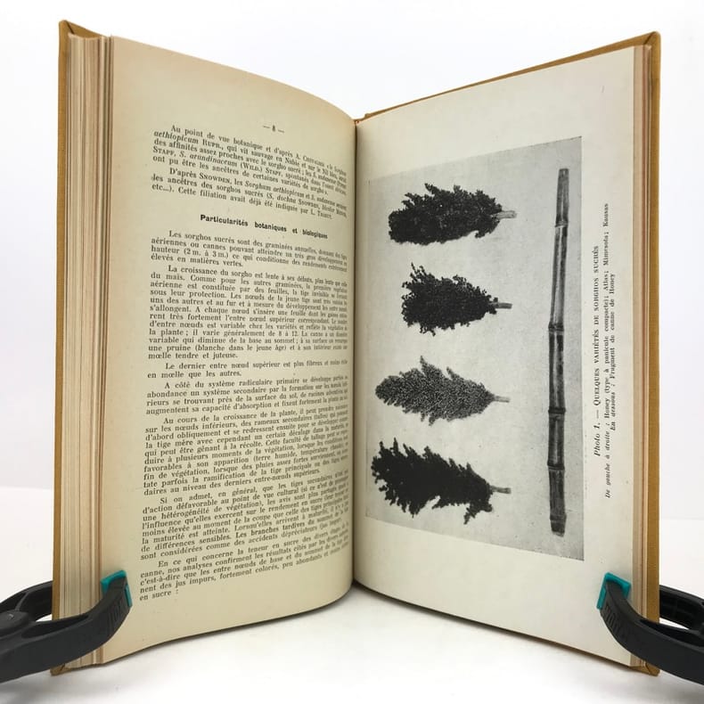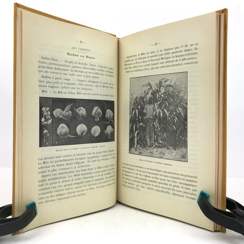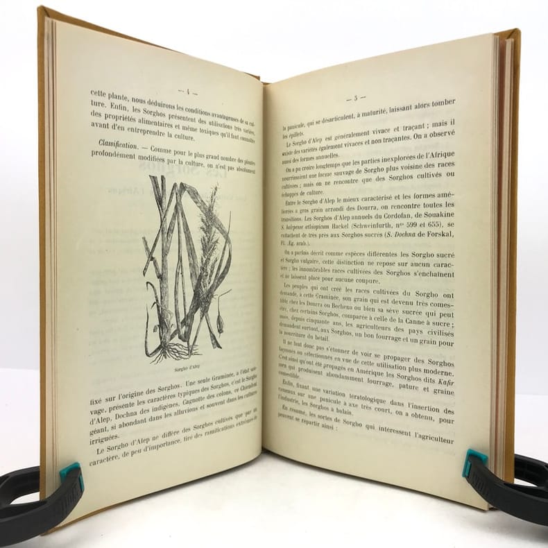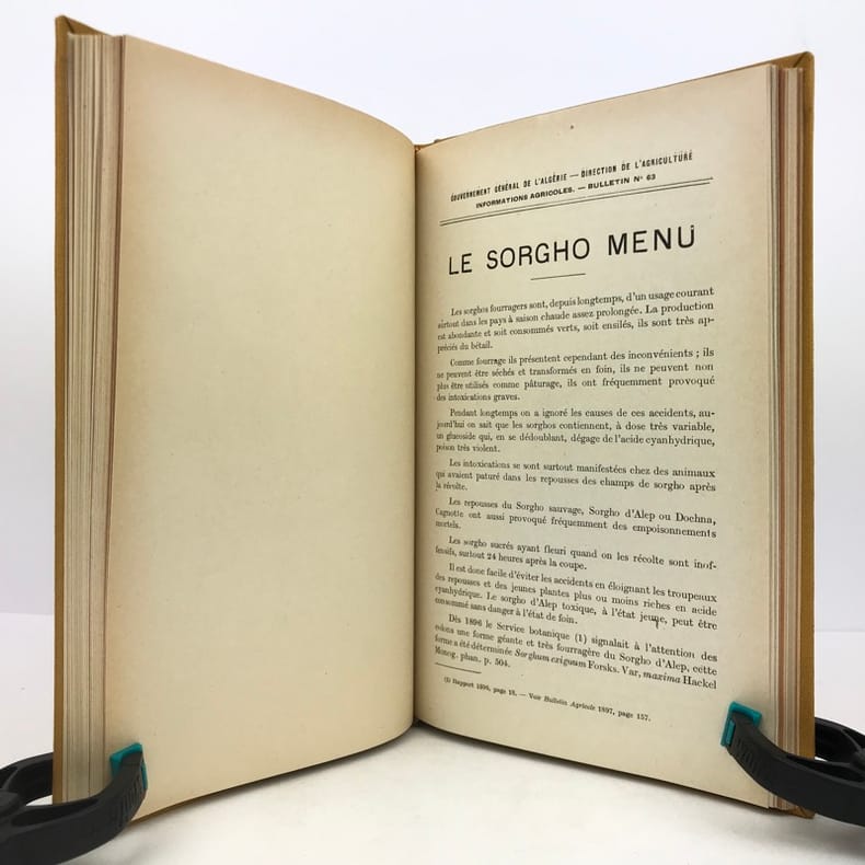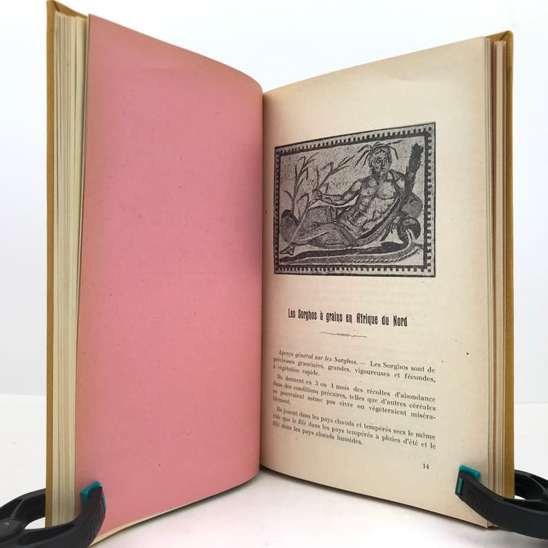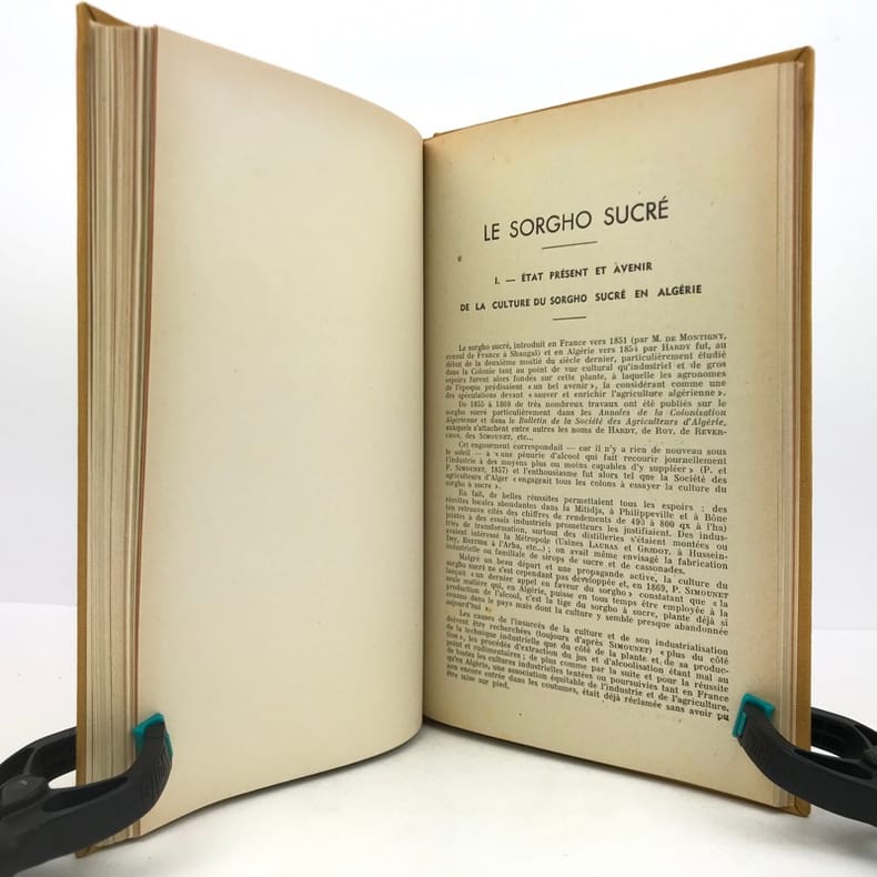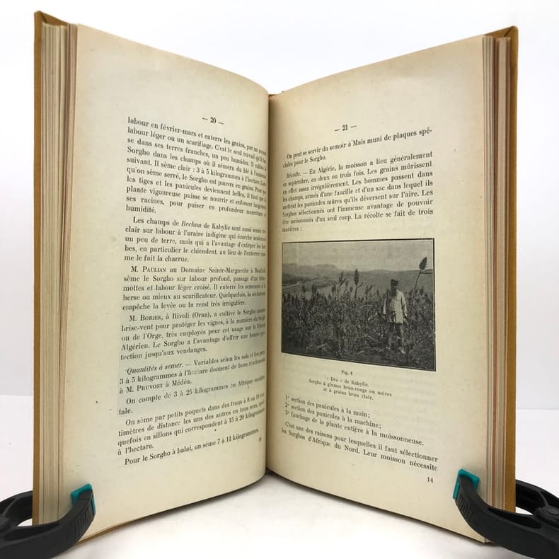 5 ouvrages in-8 (23,5 x 15,5 cm), bradel toile jaune (reliure moderne), pièce de titre noire, couvertures conservées, cachet à quelques feuillets, envoi autographe signé de André Pédallu sur le 1er feuillet du 4e texte. 36 ; 41-3bl. ; 8 ; 4 ; 45-[3] pages (textes complets). Second plat de la reliure légèrement sali. Bon état. Réunion de 5 études sur le sorgho, illustrées de reproductions photographiques hors texte et de figures in-texte, certaines à pleine page. Documents et renseignements agricoles réunis dans une collection publiée par le Gouvernement Général de l’Algérie (Direction de l’économie de l’agriculture). Louis Charles Trabut (1853-1929), botaniste, agronome et médecin français, fondateur de la Revue horticole de l'Algérie connu notamment pour ses travaux sur les agrumes, dont la première description du clémentinier (Citrus clementina). Piédallu, André (1876-1945). Pharmacien. - Botaniste. Docteur és sciences, ingénieur-chimiste, pharmacien-major de 1re classe à l'hôpital militaire d'Alger.. Lauréat de l'académie d'agriculture et de la société nationale d'acclimatation. Intéressant ensemble.