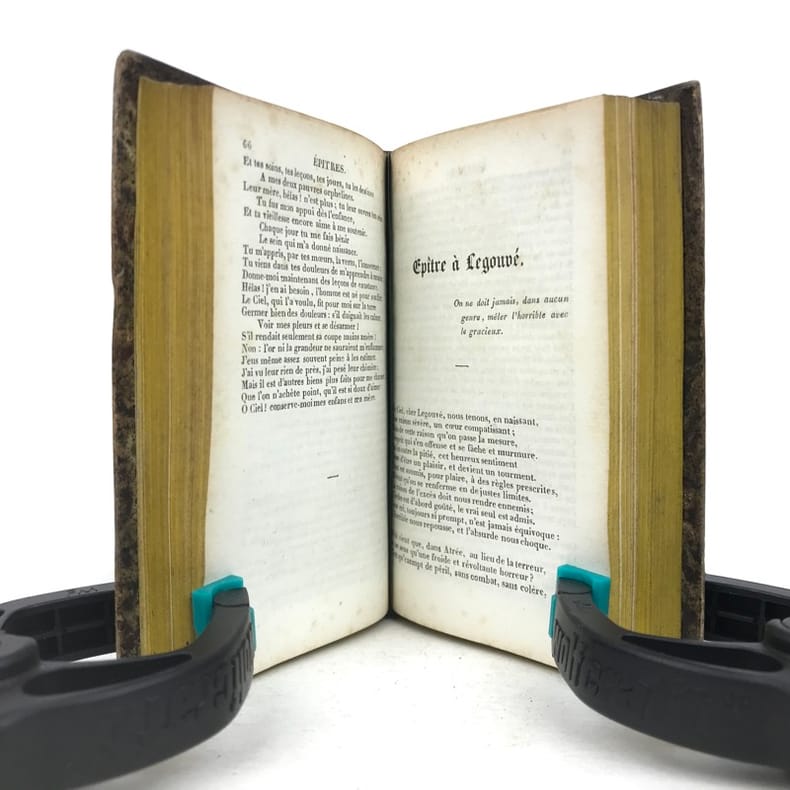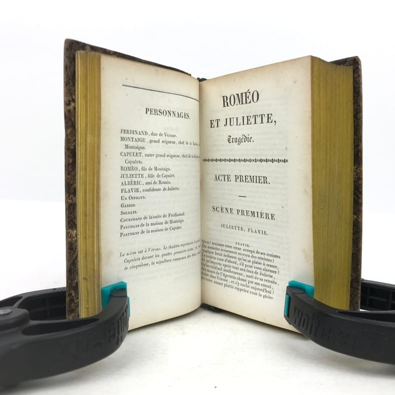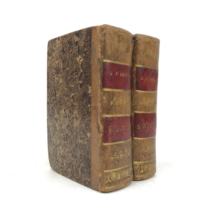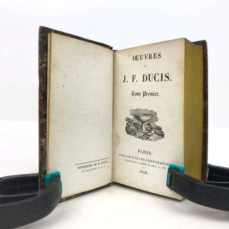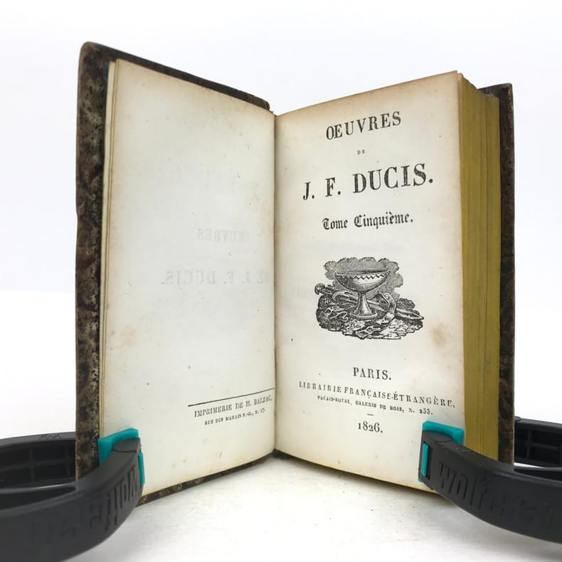 8 tomes en 2 volumes in-32 (10 x 6 cm), demi basane fauve (reliure de l’époque), dos lisse orné, pièces de titre et de tomaison en basane rouge, tranches jaunes, ex-libris de Jacques Laget, [4]-206-[6]-166-[6]-147-[6]-135-[3] ; [4]-127-[7]-134-[3]-120-[4]-124 pages (complet). Reliure légèrement frottée, quelques rousseurs éparses. État très correct tout de même. Nous avons ici un recueil hétéroclite de ses œuvres : des reprises des plus grands succès shakespeariens, ou encore de courtes poésies composées en fin de vie. Jean-François Ducis (1733-1816) est un écrivain, dramaturge et poète français. Bon exemplaire.