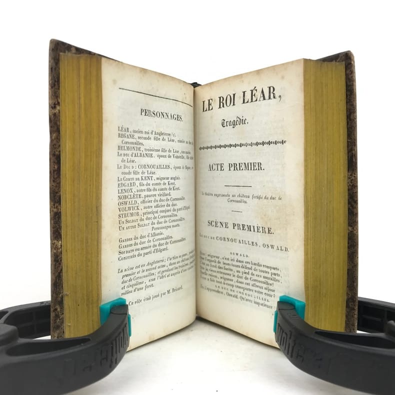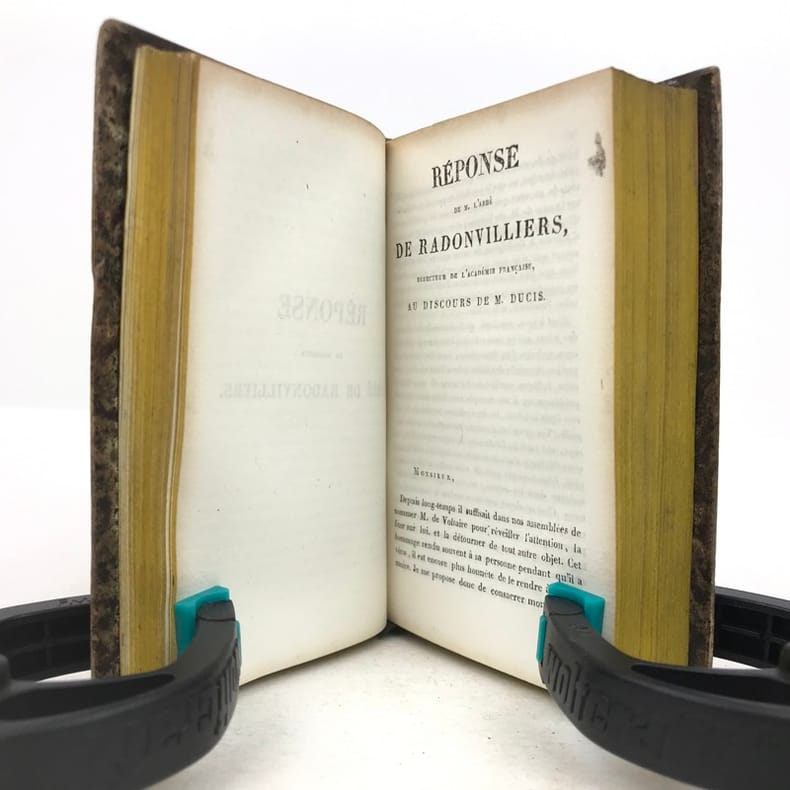 1819 Paris, Nepveu,1819 ; 3 volumes in-8 demi-basane blonde de l'époque, dos à nerfs plats, nerfs ornés de palettes dorées,entre-nerfs ornés de larges palettes dorées et fleurons à froid, titre et tomaison dorés,t ranches bleues jaspées de rose; 2ff., LXXXVIpp., 387pp., 1p.nch.; 2ff., 461pp., 1p.nch.; 2ff., 503pp. Illustré d'un portrait de Ducis par Gérard gravé par Fersell et de 11 gravures hors texte d'après Desenne et Girodet.